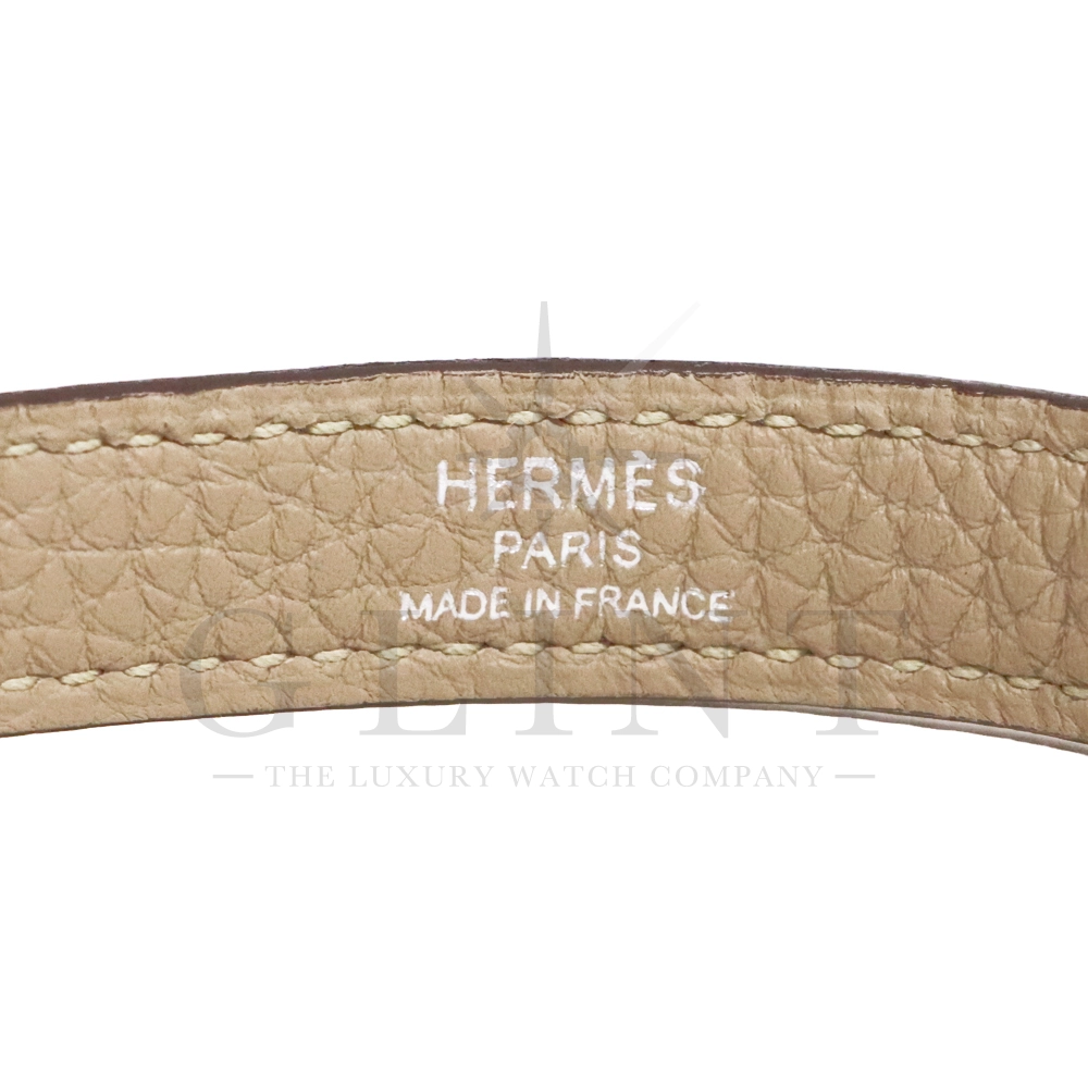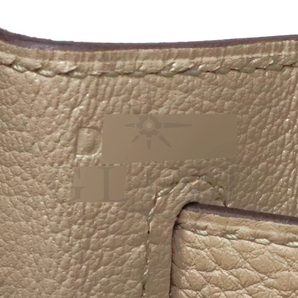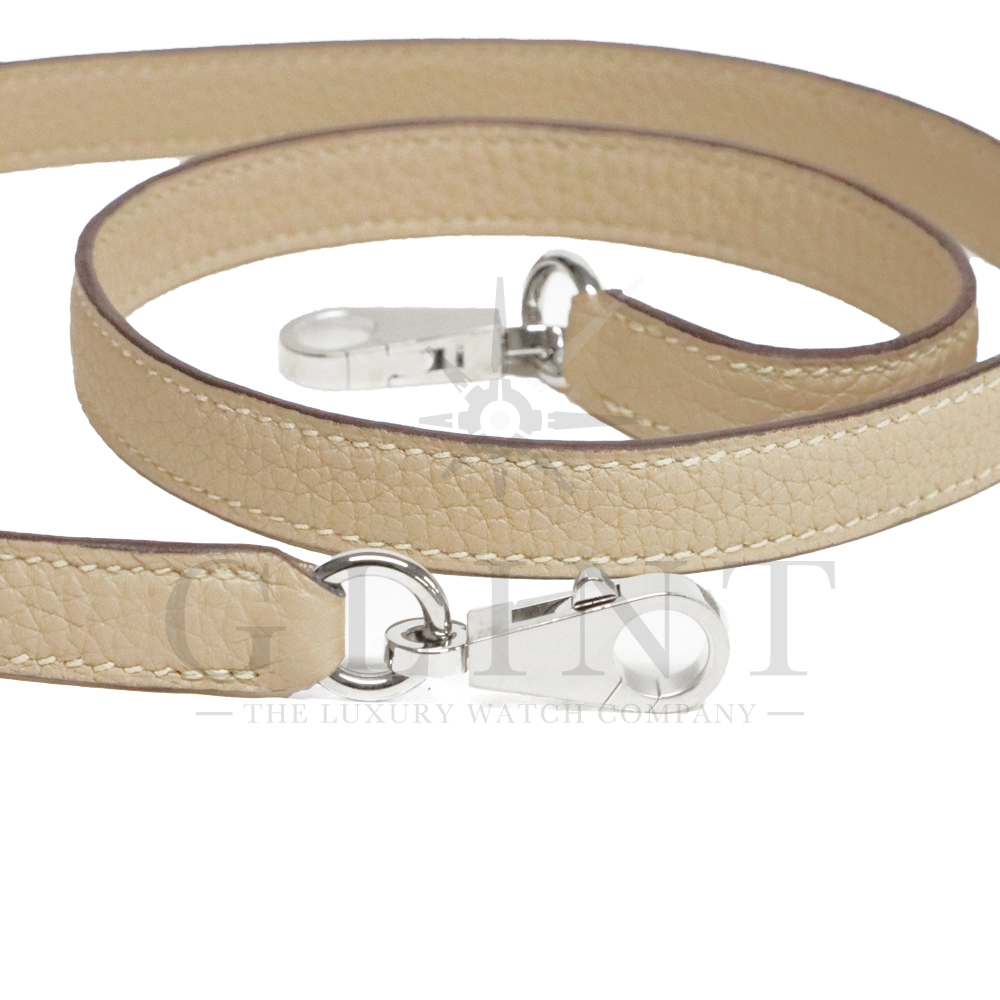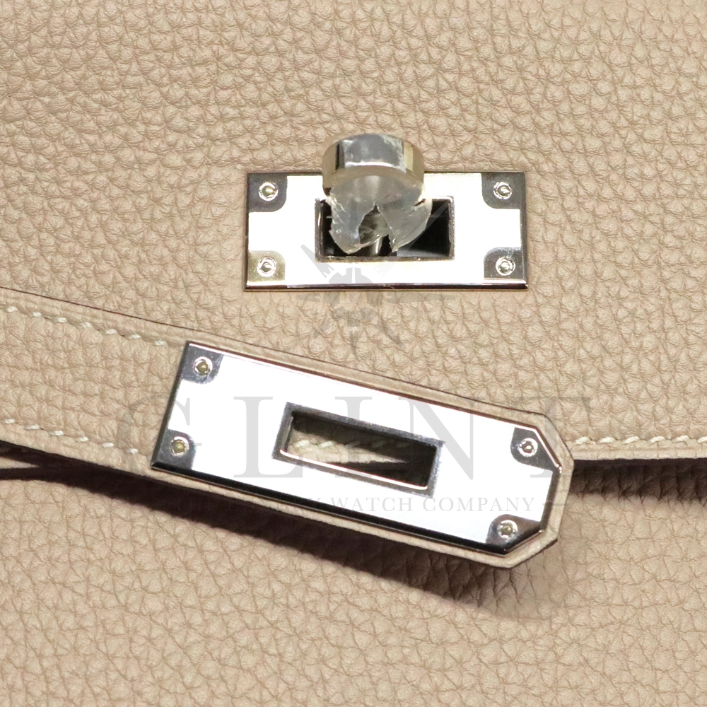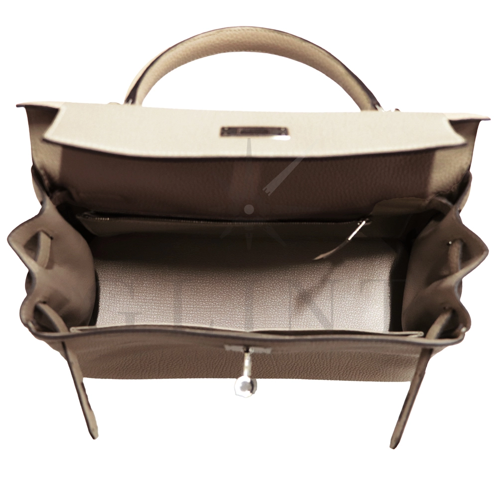 こちらはエルメス ケリー28です。女性らしい可憐なフォルムの中に、凛とした雰囲気も持ち合わせるケリーバッグ。どこから見ても一寸の狂いもない究極な美フォルムは、洗練されたオトナの女性を演出し、パーティーやフォーマルなシーンにおいてふさわしいエレガントなムードに溢れます。1997年に発表された雄の子牛革を使用したトゴは現在では最もポピュラーであり、エルメスの定番とも言えます。正式名称をヴォー・クリスペ・トゴと言い、 深めの斑と血管の筋が出ているものもありますが、皮の風合いをそのままの状態で使用しているため、天然素材の個体差を楽しむことができます。そのトゴは適度な柔らかさがあり、エキゾチックレザーに比べて摩擦に強く、大変扱いやすい素材として定評があり、デイリーに使用されている方も多い素材です。そして、カラーは人気の高いカラー、トレンチ。内縫いのケリーのため服装を問わず気軽に合わせやすい便利さから、様々なシーンで大活躍してくれることでしょう。