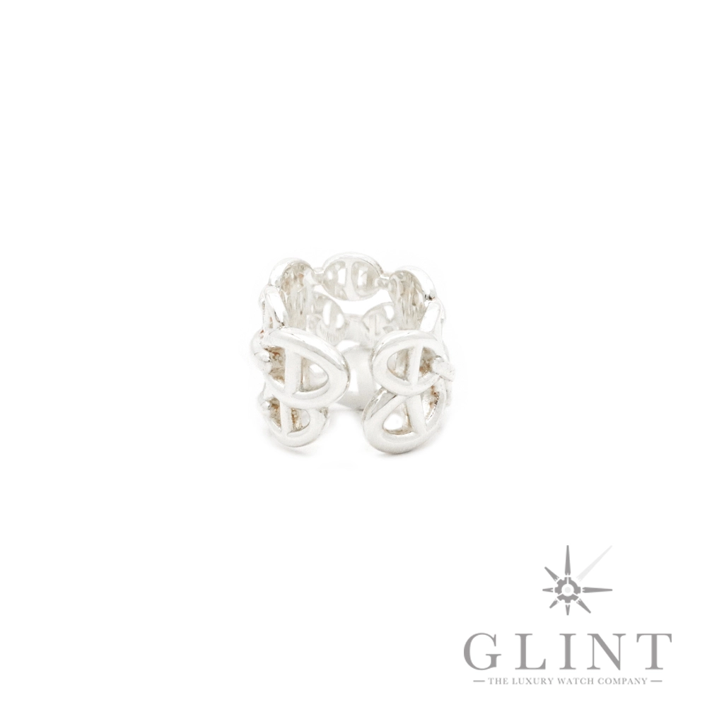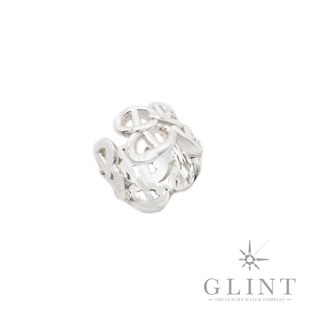 こちらはエルメス シェーヌダンクル アンシェネ GM リングです。メゾンを象徴する「シェーヌ・ダンクル」モチーフを、よりモダンで力強いフォルムへと昇華させた《アンシェネ》コレクション。GMサイズは、指元に確かな存在感をもたらすボリュームと洗練を兼ね備えたデザインです。船の錨の鎖から着想を得たシェーヌ・ダンクルは、1938年に誕生して以来、エルメスのアイコンとして愛され続けてきました。アンシェネでは、そのコマを立体的かつ大胆に再構築。シルバーのなめらかな曲線とエッジの効いたラインが光を美しく反射し、上品でありながらも個性を際立たせます。シンプルな装いに合わせるだけで、スタイル全体を格上げする存在感。ジェンダーを問わずお使いいただけるユニセックスなデザインで、デイリーから特別なシーンまで幅広く活躍します。
