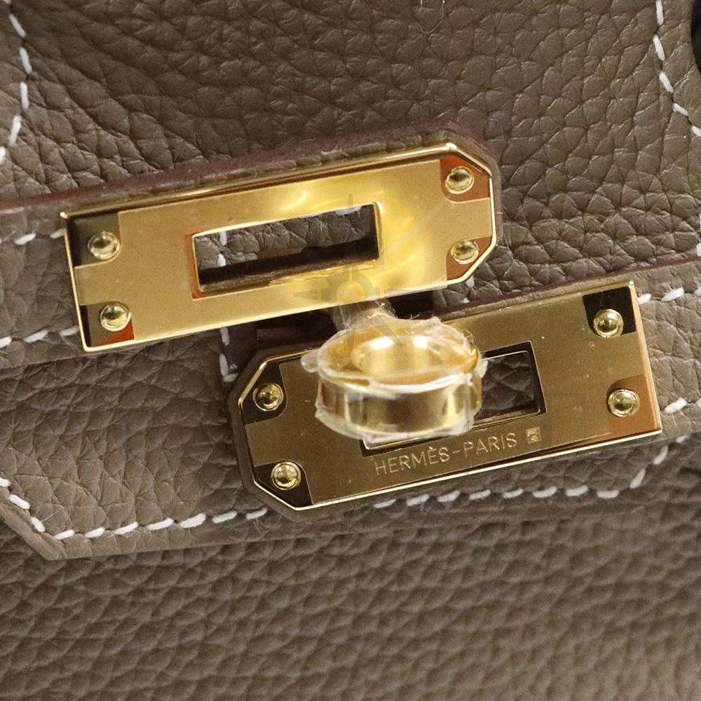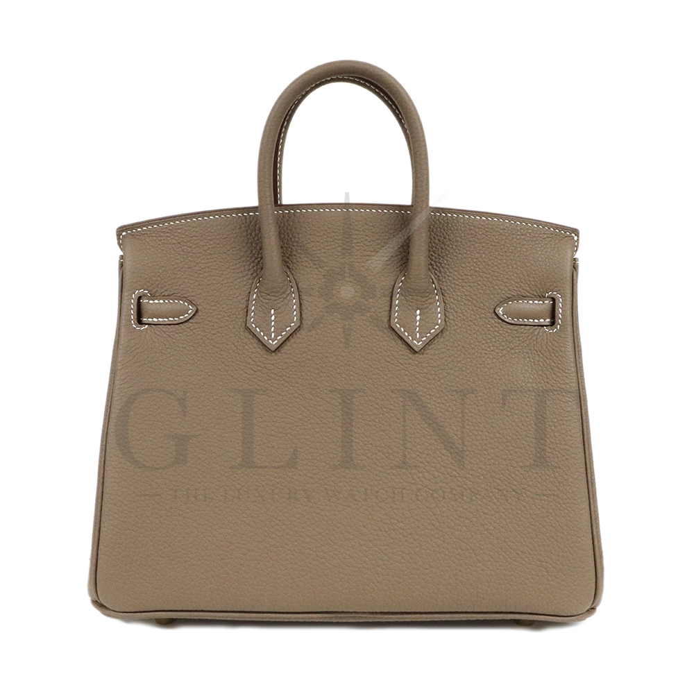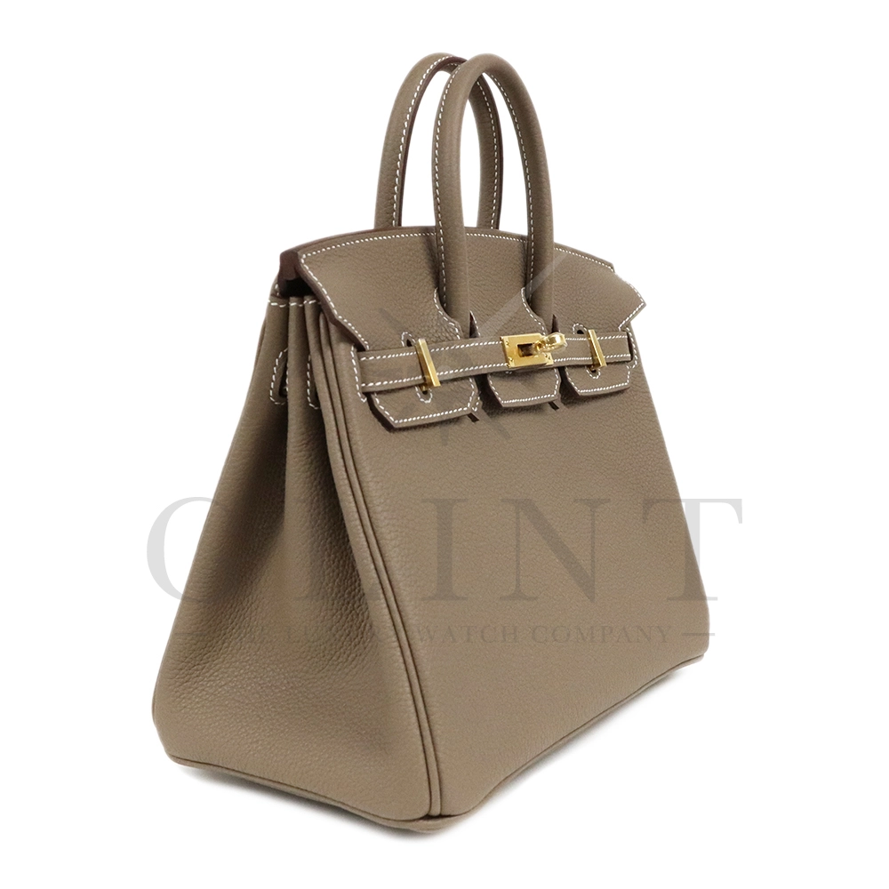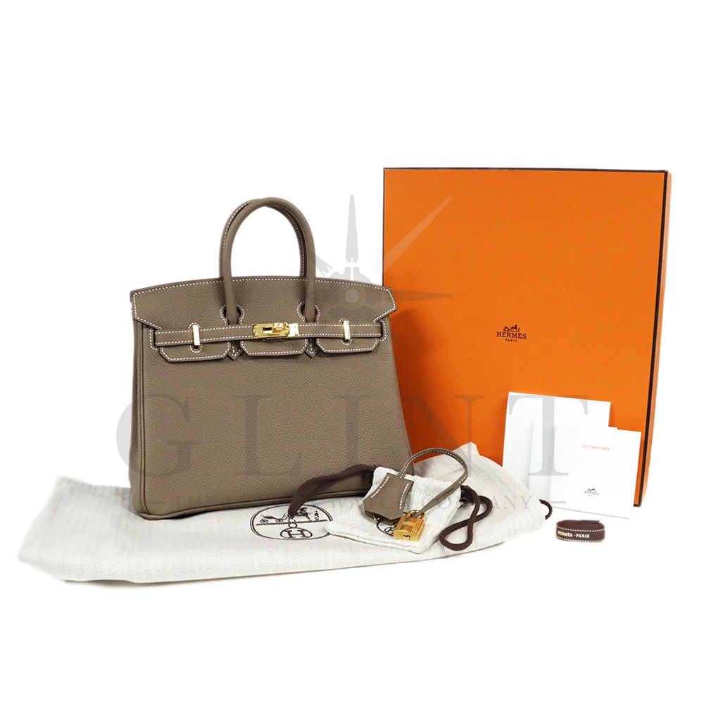 こちらはグランドメゾン・エルメスを象徴する人気のバッグバーキン 25です。Hermèsを象徴するアイコンバッグ「バーキン25」は、卓越したクラフツマンシップとタイムレスな美しさを兼ね備えた逸品です。本モデルは、上質なトゴレザーを採用しており、ほどよいシボ感と柔らかさ、そして優れた耐久性が魅力。傷や型崩れが目立ちにくく、日常使いにも適した実用性を備えながら、ラグジュアリーな存在感をしっかりと放ちます。カラーは人気のエトゥープ。グレーとベージュが絶妙に溶け合ったニュアンスカラーで、落ち着きと上品さを兼ね備えています。季節やスタイルを問わずコーディネートに自然に馴染み、カジュアルからフォーマルまで幅広いシーンで活躍してくれるでしょう。シンプルでありながらも奥行きのある色味は、大人の洗練されたスタイルを引き立てます。サイズはコンパクトで扱いやすい25サイズ。小ぶりながらも必要なアイテムをしっかり収納でき、デイリーから特別なシーンまで幅広く対応します。開口部はフラップ仕様で、クロアとカデナがあしらわれたエルメスならではのデザインが特徴。細部に至るまで丁寧に仕上げられたディテールは、長い歴史に裏打ちされた職人技術の結晶です。持つ人の品格を高め、スタイルに確かな存在感を与えるバーキン25。流行に左右されることなく、長く愛用できる一生もののバッグとして、世代を超えて受け継がれる価値を持っています。洗練された美しさと実用性を兼ね備えた、まさにラグジュアリーの真髄を体現する特別なアイテムです。