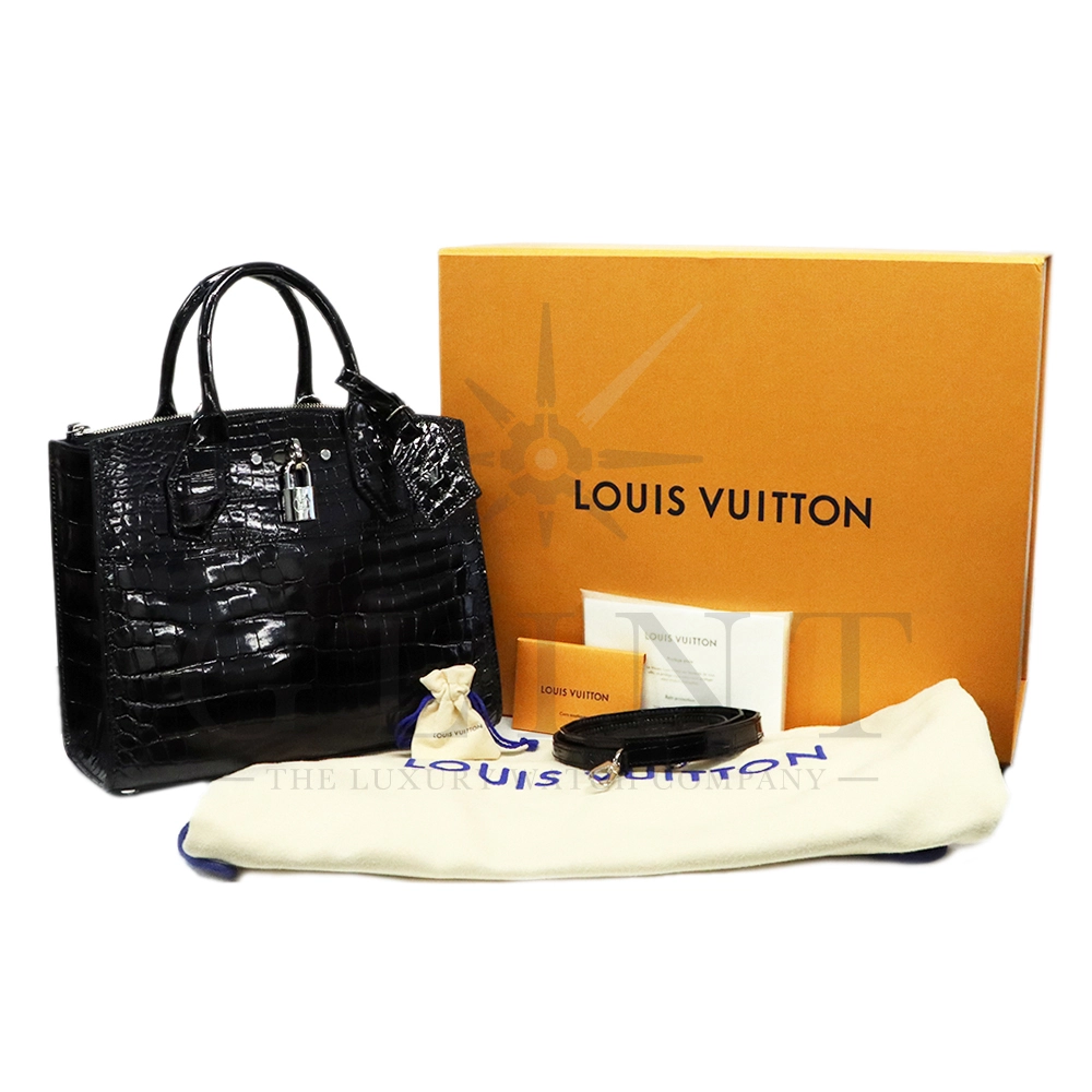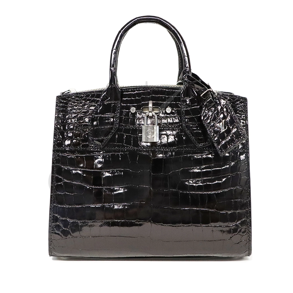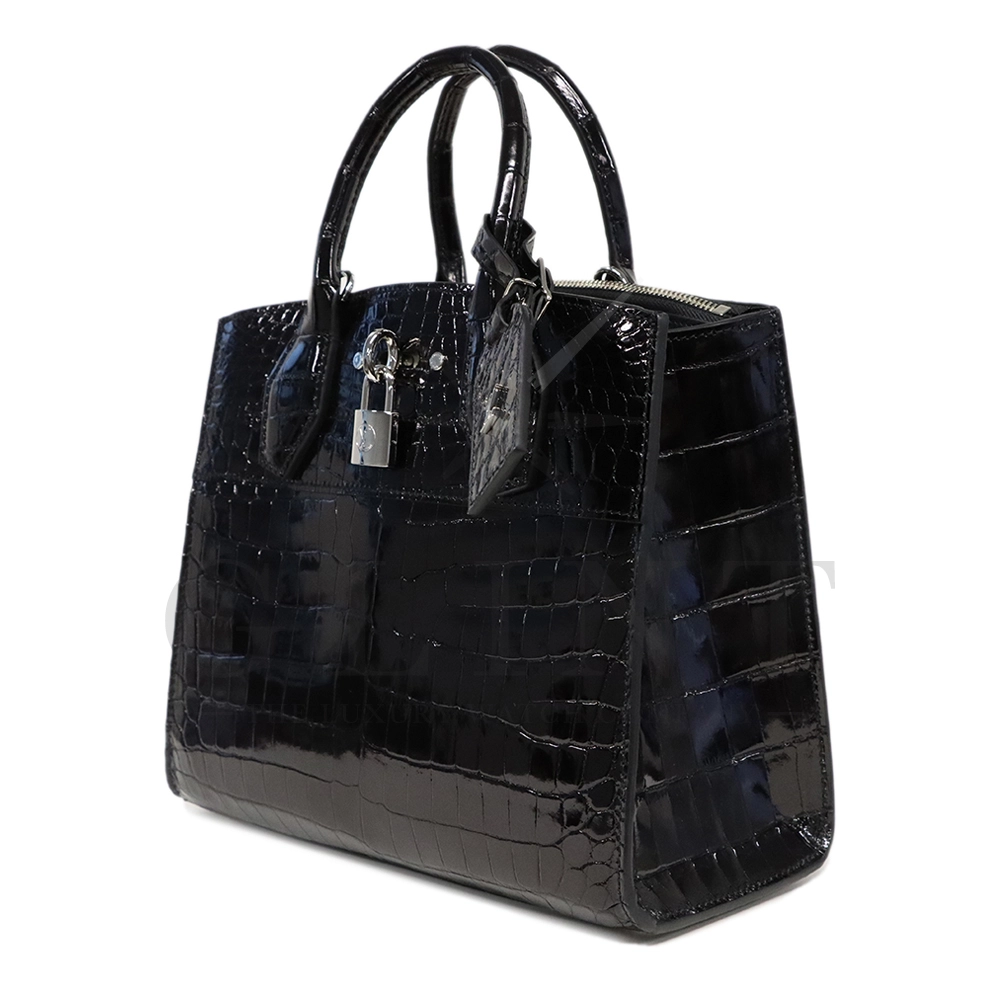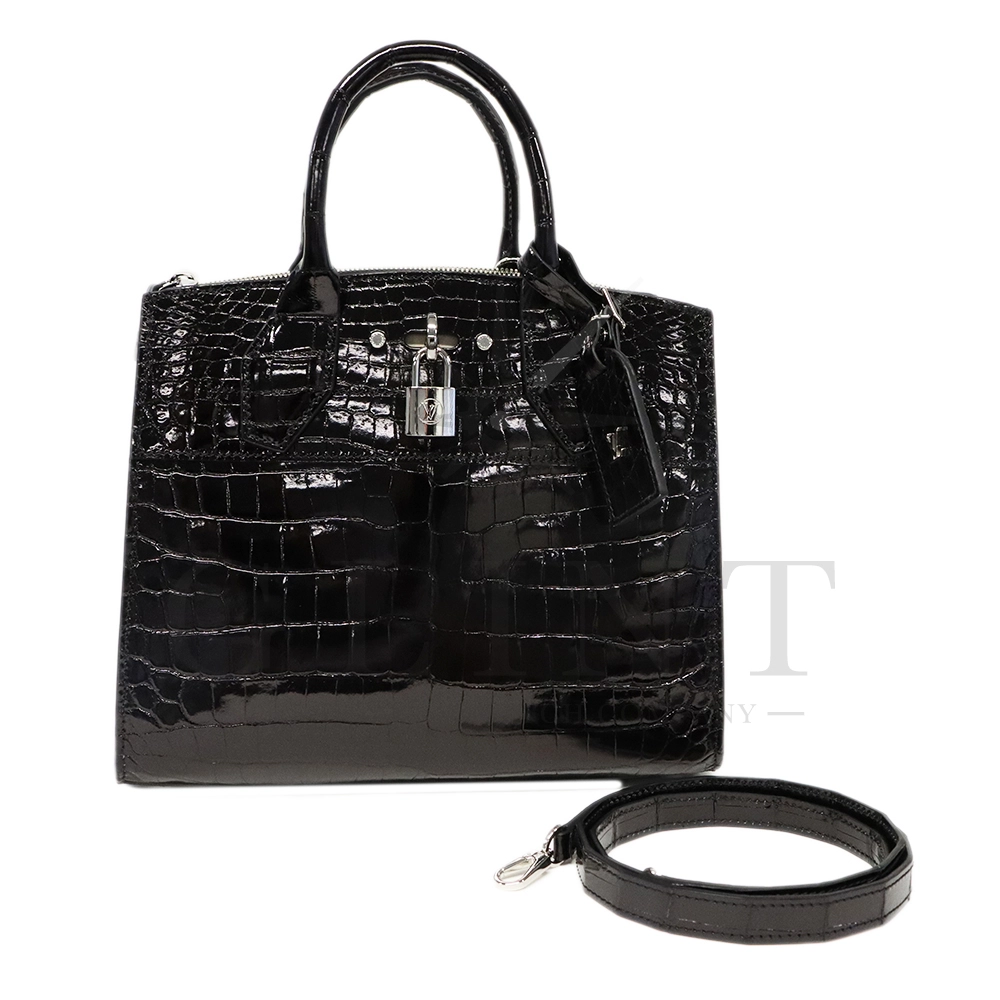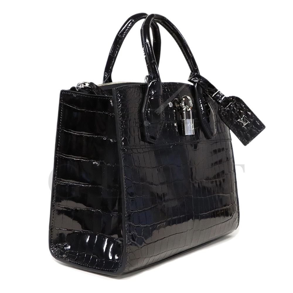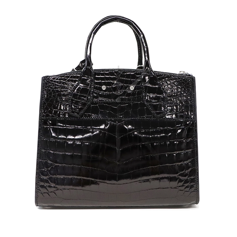 こちらはシティ・スティーマー PM エキゾチックレザーです。「City Steamer(シティ スティーマー)」は、ルイ・ヴィトンの比較的新しいハンドバッグ・ラインのひとつで、スティーマー(蒸気船用のトランク=Steamer luggage)をモチーフにしたデザイン要素を取り入れています。伝統的なトランクや旅行鞄からの流れを現代的に解釈した、構造的でありながらもエレガントな佇まいが特徴です。また、付属のストラップを使用することでショルダーバッグとしてもご使用いただけます。