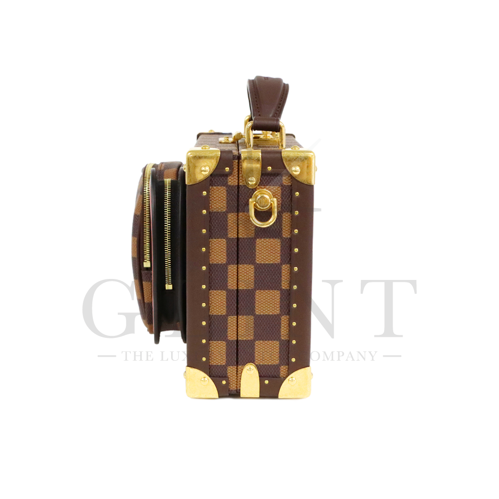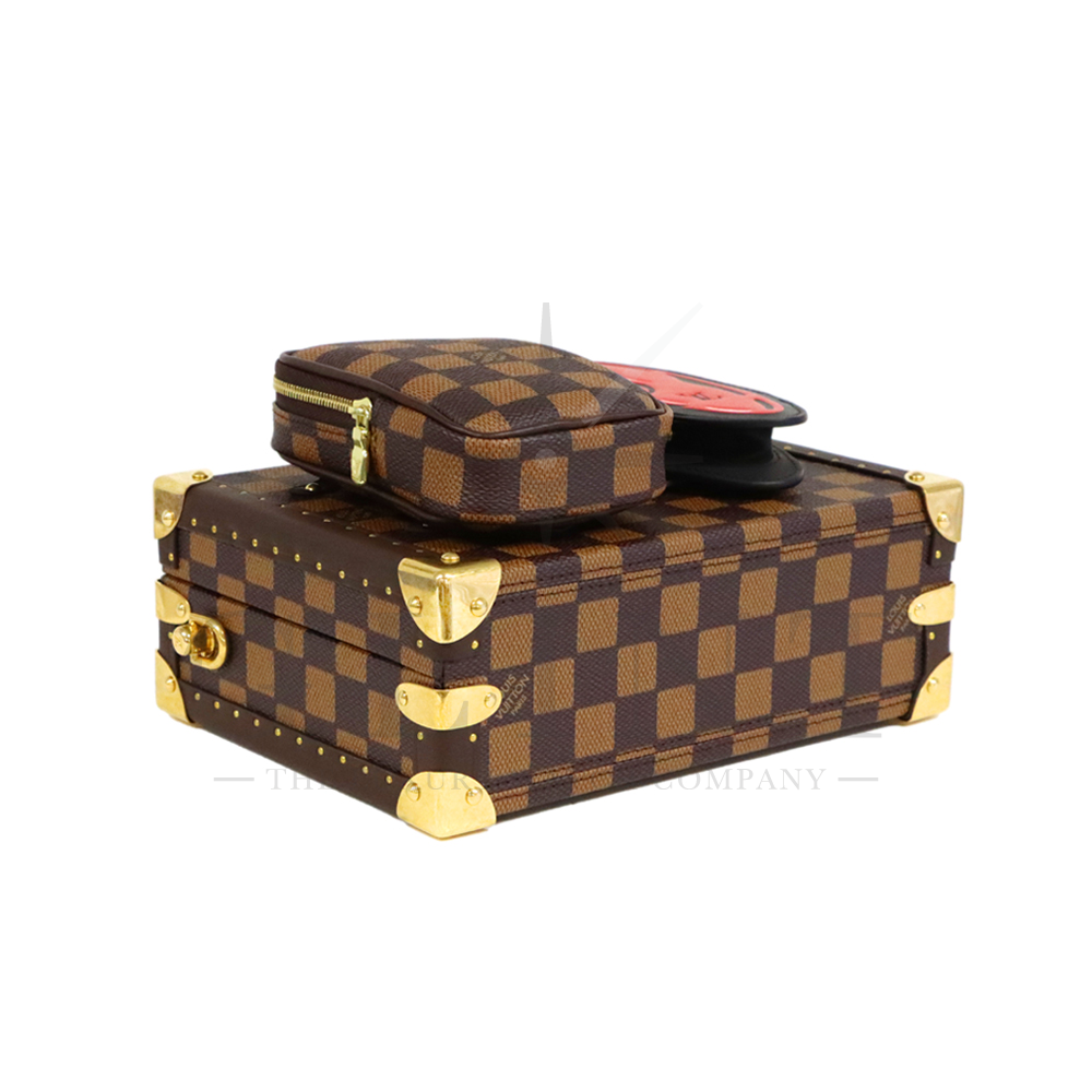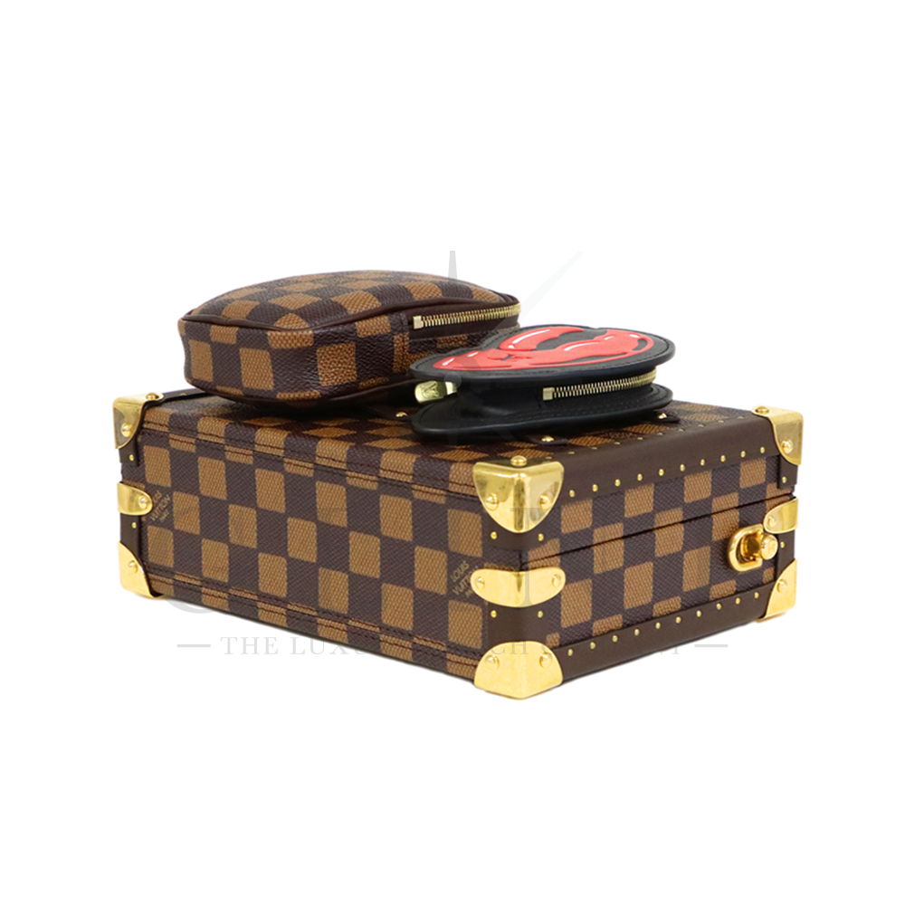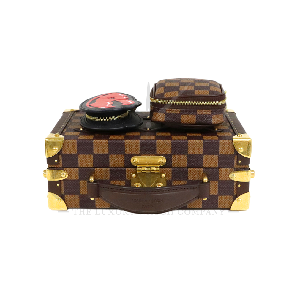 こちらは「サワガニ・トランク」です。ファレル・ウィリアムスと日本人デザイナー NIGO®の長年にわたるコラボレーションを讃える、ダミエ・フレンドシップ キャンバスの「サワガニ・トランク ダミエ フレンドシップ」。ストラップで持ち運べるこのトランクは、片面には遊び心溢れる複数のポーチを、もう片面にはファレルとNIGO®の横顔を配した特徴的なデザイン。内装には、NIGO®が手掛けた日本の伝統的な七宝文様の織物とモノグラム・フラワーを組み合わせたライニングを施しています。ファレルが持つ鮮やかな色彩感覚と、NIGO®が持つ一目でそれとわかる大胆なアイコンが組み合わり、ストリートカルチャーをラグジュアリーへと昇華させた傑作コレクションです。