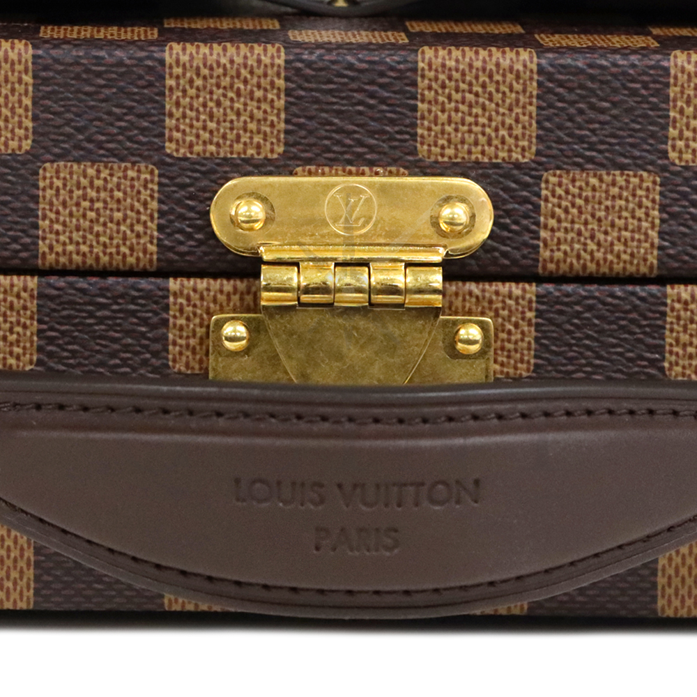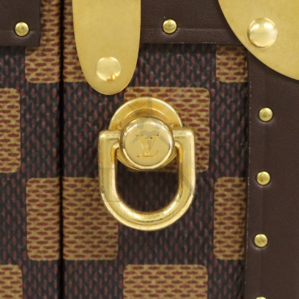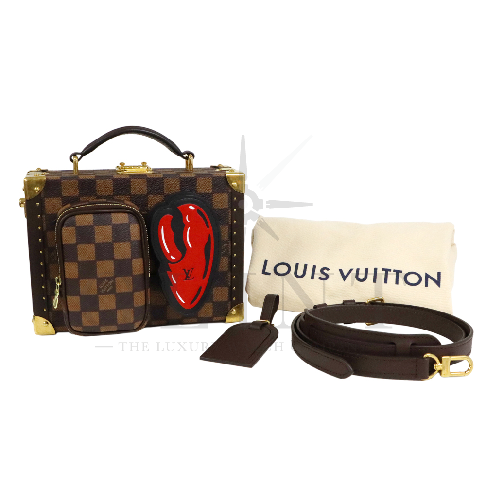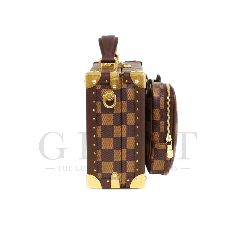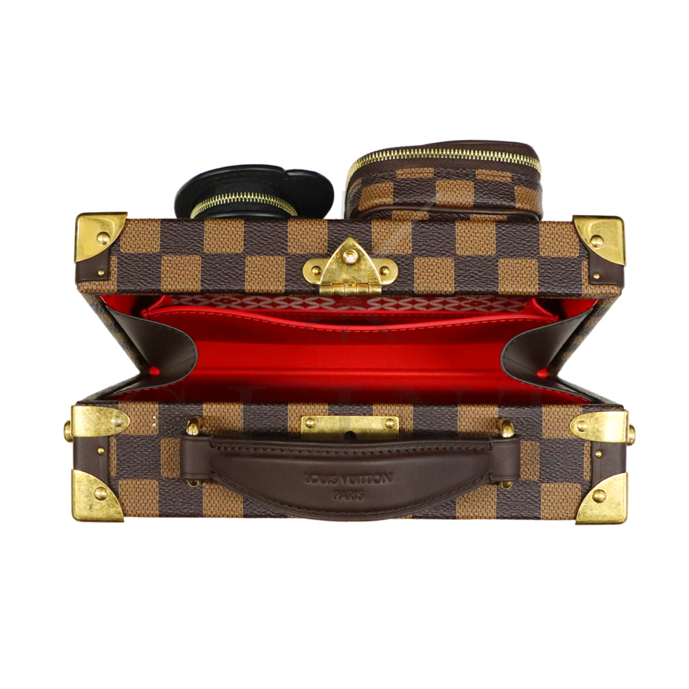 こちらは「サワガニ・トランク」です。ファレル・ウィリアムスと日本人デザイナー NIGO®の長年にわたるコラボレーションを讃える、ダミエ・フレンドシップ キャンバスの「サワガニ・トランク ダミエ フレンドシップ」。ストラップで持ち運べるこのトランクは、片面には遊び心溢れる複数のポーチを、もう片面にはファレルとNIGO®の横顔を配した特徴的なデザイン。内装には、NIGO®が手掛けた日本の伝統的な七宝文様の織物とモノグラム・フラワーを組み合わせたライニングを施しています。ファレルが持つ鮮やかな色彩感覚と、NIGO®が持つ一目でそれとわかる大胆なアイコンが組み合わり、ストリートカルチャーをラグジュアリーへと昇華させた傑作コレクションです。