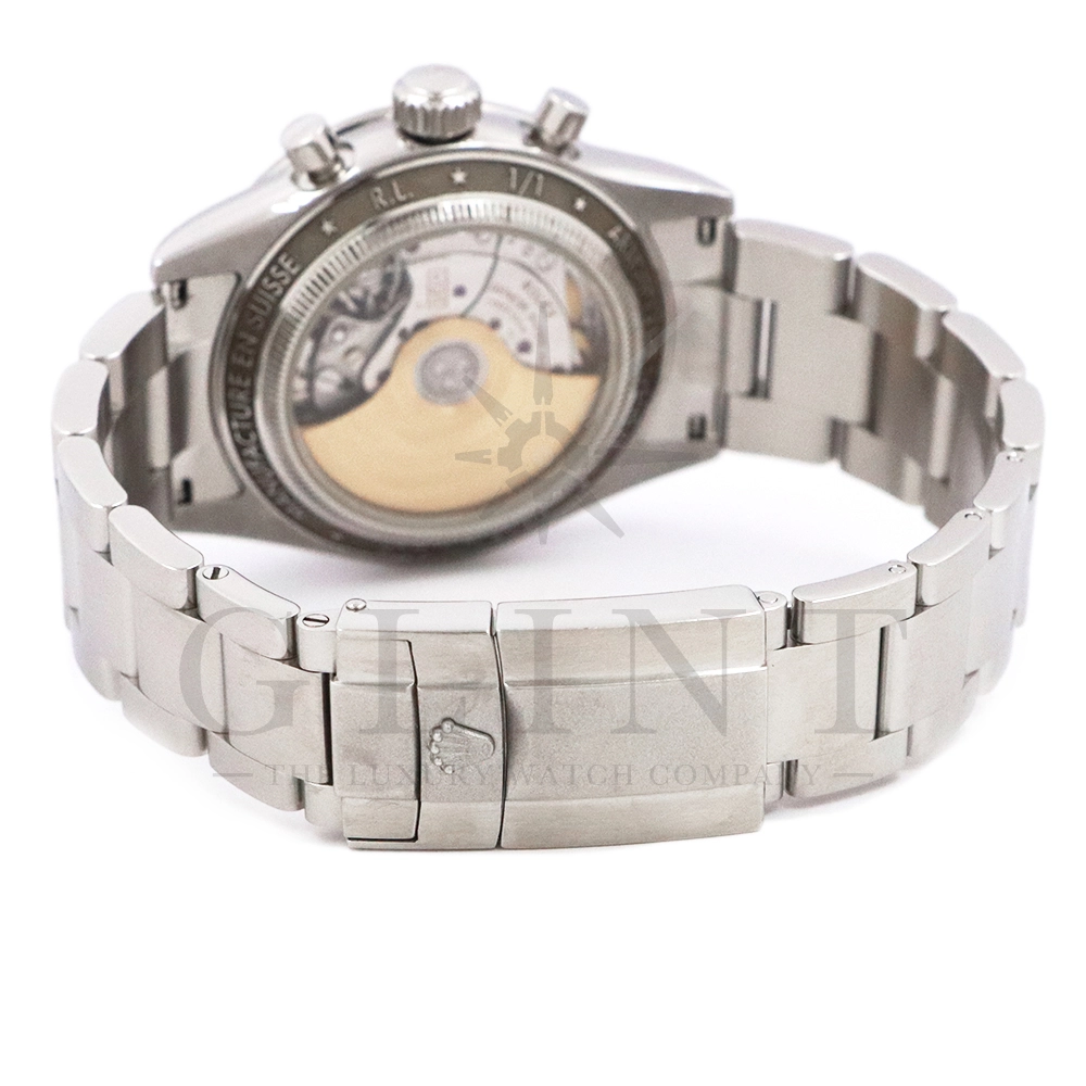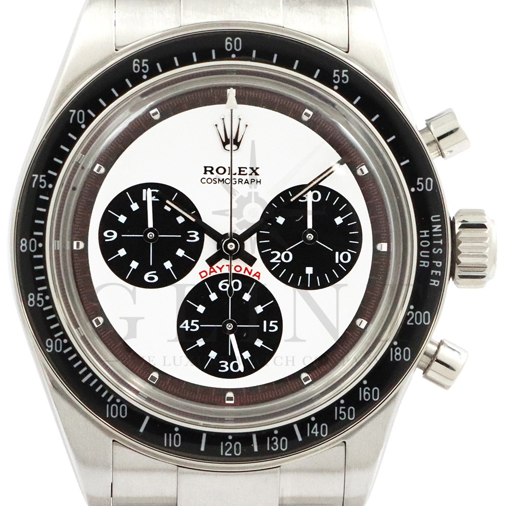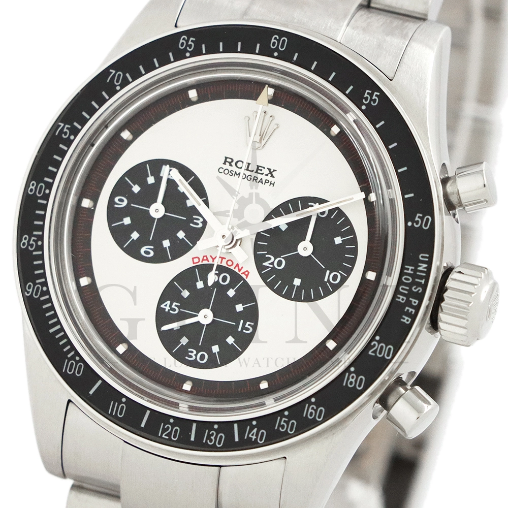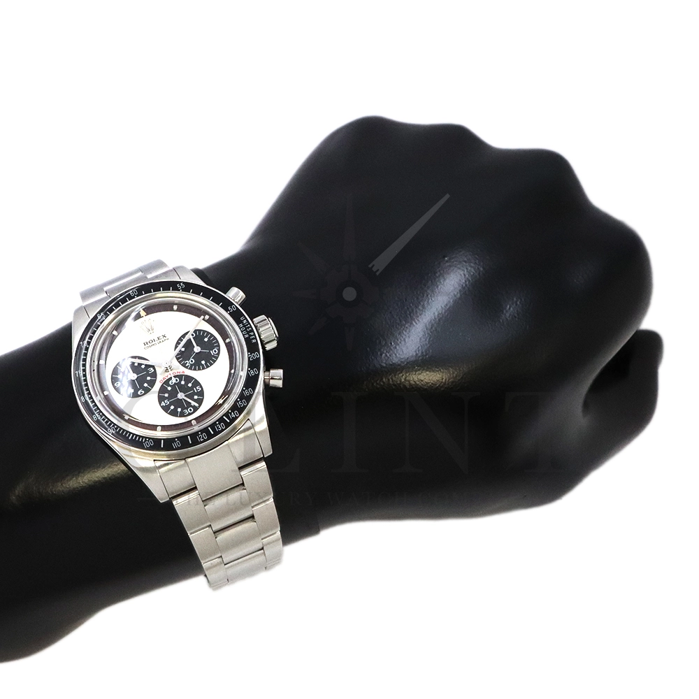 こちらはアーティザンズドゥジュネーブ デイトナ ユニークピースです。1970年代の美学を想起させる顧客のために作られたオーダーメイドモデル。ベースには116520を使用。ベークライトのベゼルは過去の時計へのオマージュとして、ブラックのベークライトを採用。文字盤は往年のヴィンテージモデルに見受けられたモチーフ、エキゾチックダイアル(ポール・ニューマンダイアル)を再現しており、独特な雰囲気を醸し出してくれるでしょう。リューズガードはヴィンテージ感を出すために機械加工され、ムーブメントのローターは手作業で実現されたコート ド ジュネーブ パターンと円形の研磨で装飾されています。熟練の時計師たちによる卓越した技術で優れたデザイン性と品質で魅了してくれる唯一無二のタイムピースです。