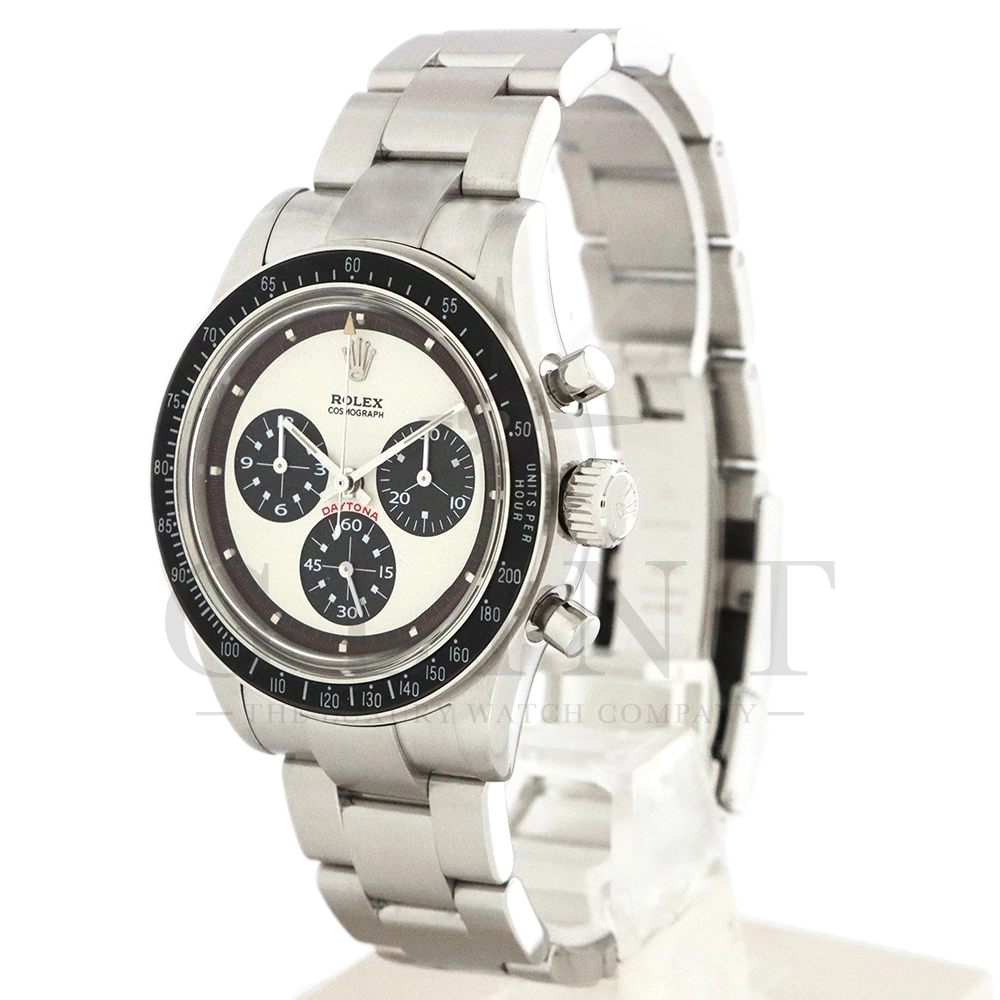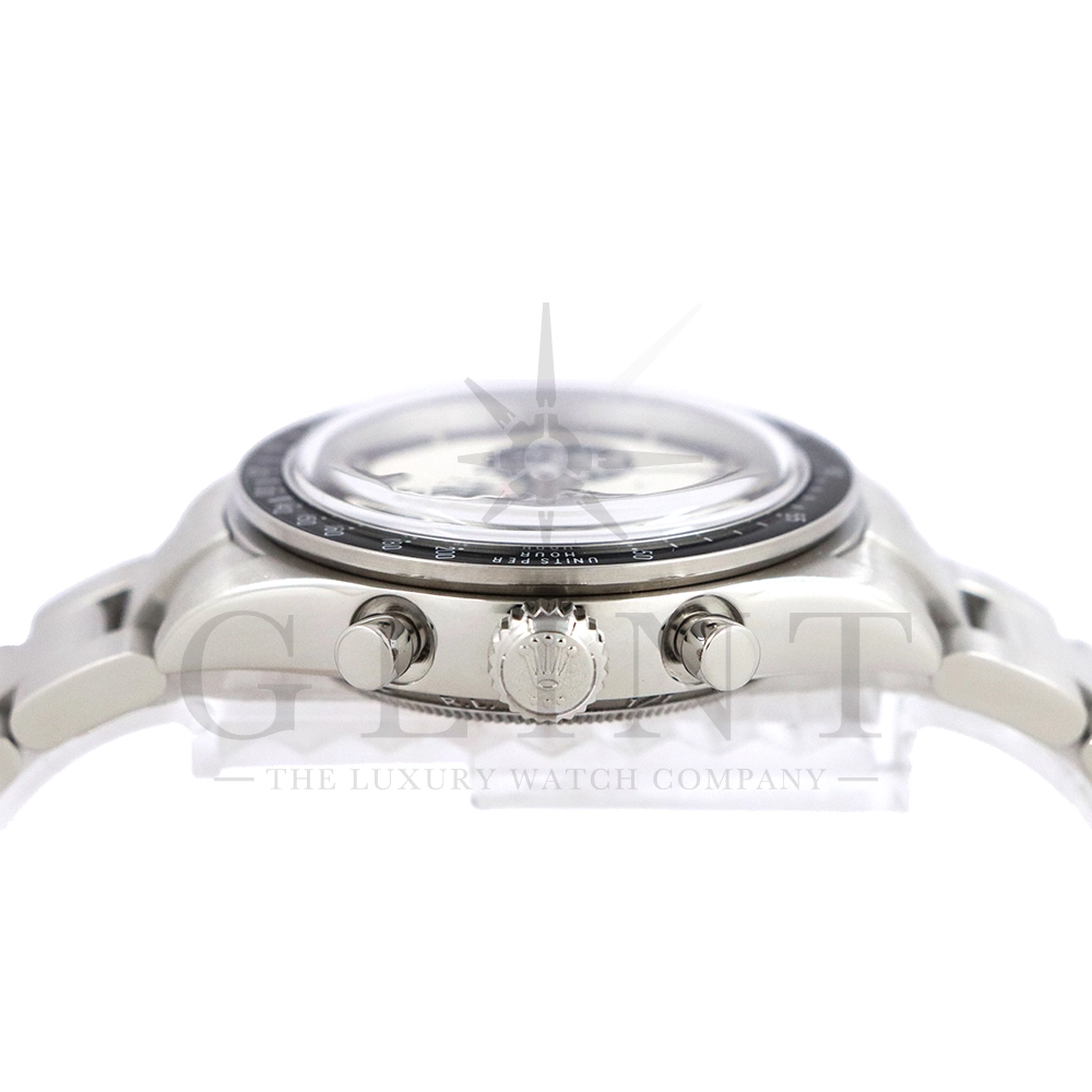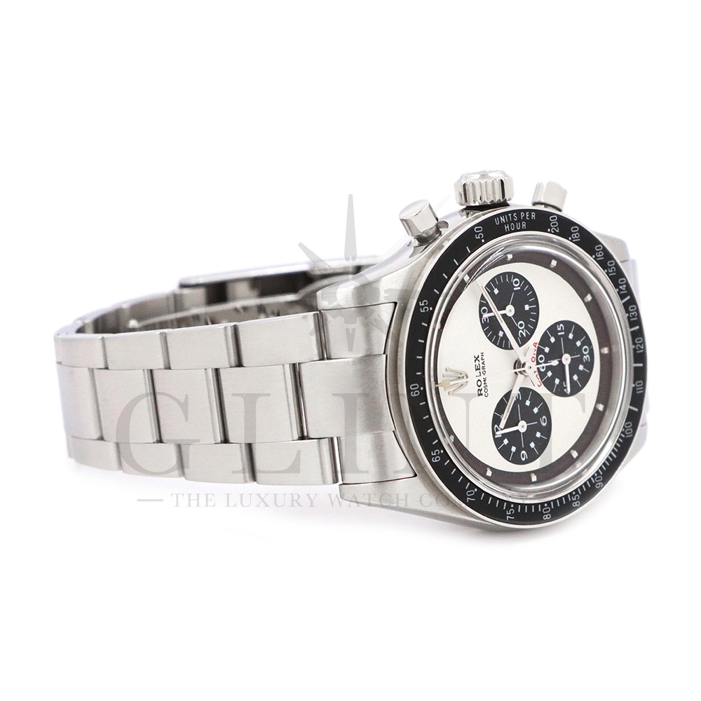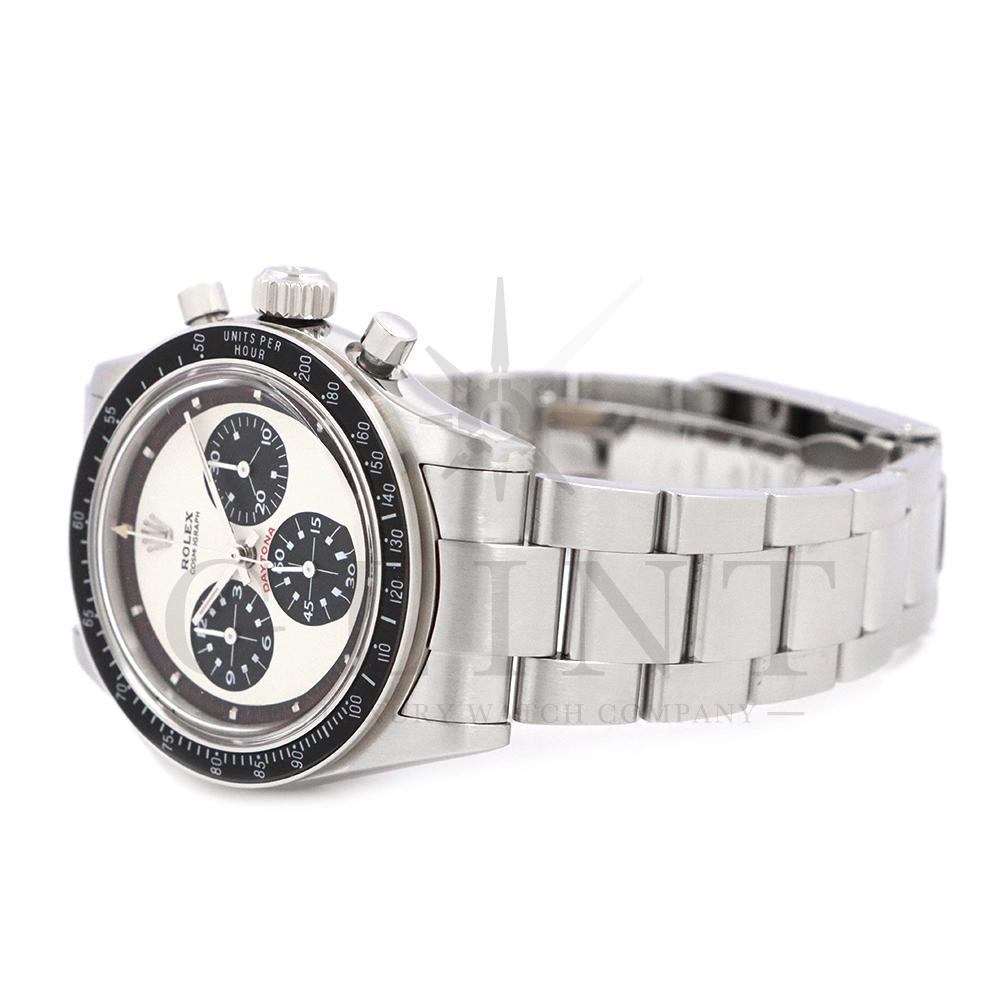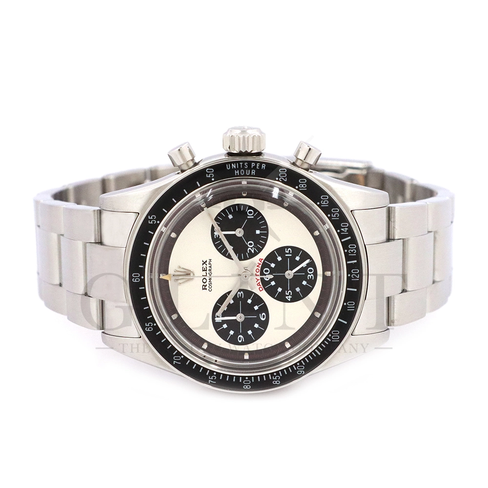 こちらはアーティザンズドゥジュネーブ デイトナ ユニークピースです。1970年代の美学を想起させる顧客のために作られたオーダーメイドモデル。ベースには116520を使用。ベークライトのベゼルは過去の時計へのオマージュとして、ブラックのベークライトを採用。文字盤は往年のヴィンテージモデルに見受けられたモチーフ、エキゾチックダイアル(ポール・ニューマンダイアル)を再現しており、独特な雰囲気を醸し出してくれるでしょう。リューズガードはヴィンテージ感を出すために機械加工され、ムーブメントのローターは手作業で実現されたコート ド ジュネーブ パターンと円形の研磨で装飾されています。熟練の時計師たちによる卓越した技術で優れたデザイン性と品質で魅了してくれる唯一無二のタイムピースです。