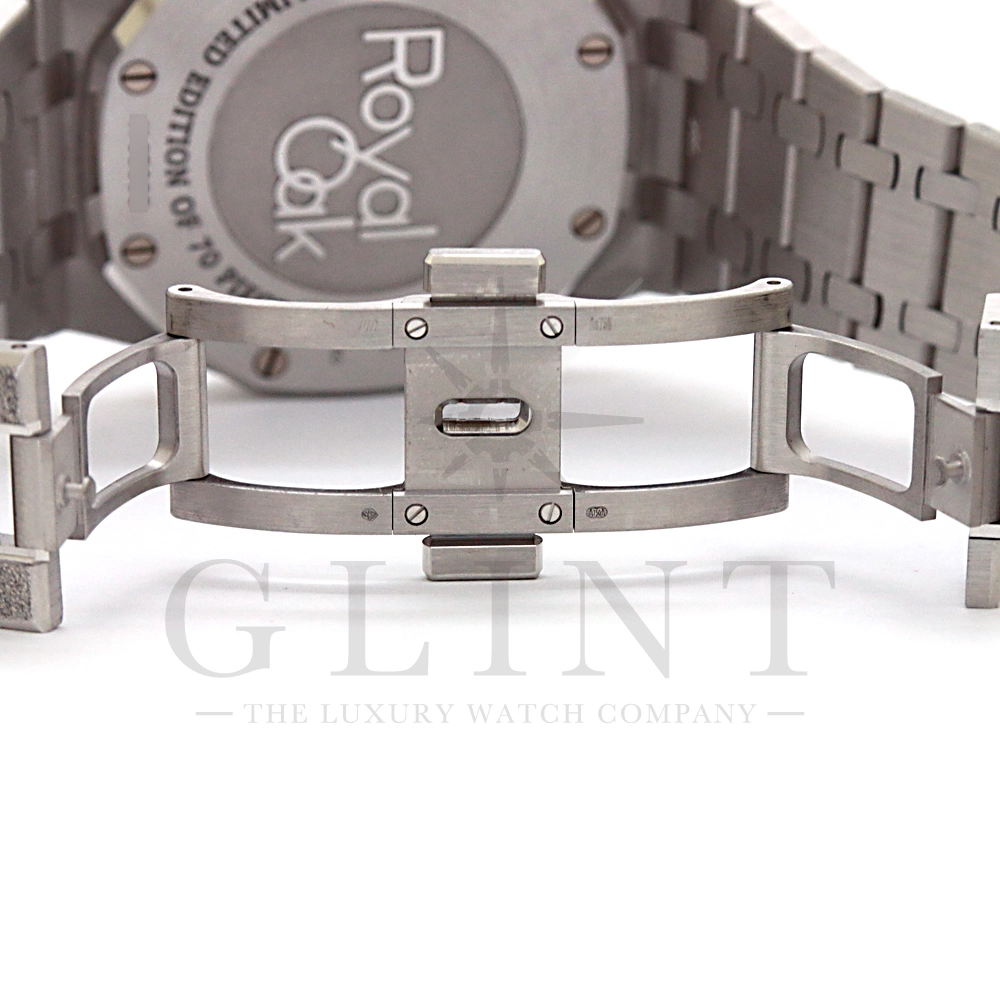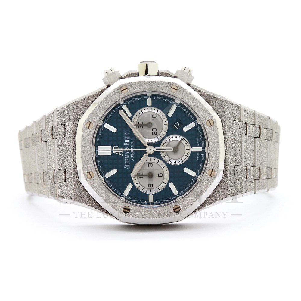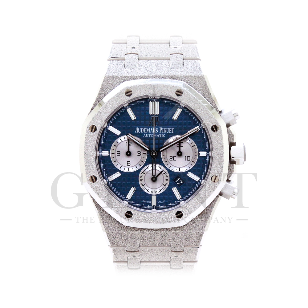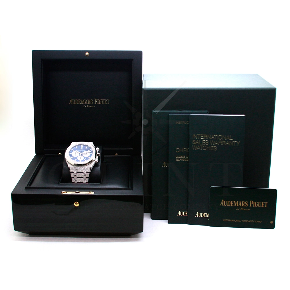 文字盤:「グランド・タペストリー」模様のブルーダイヤル、ロジウムカラーのカウンター、蓄光処理を施したホワイトゴールドのアプライドアワーマーカーとロイヤルオーク針