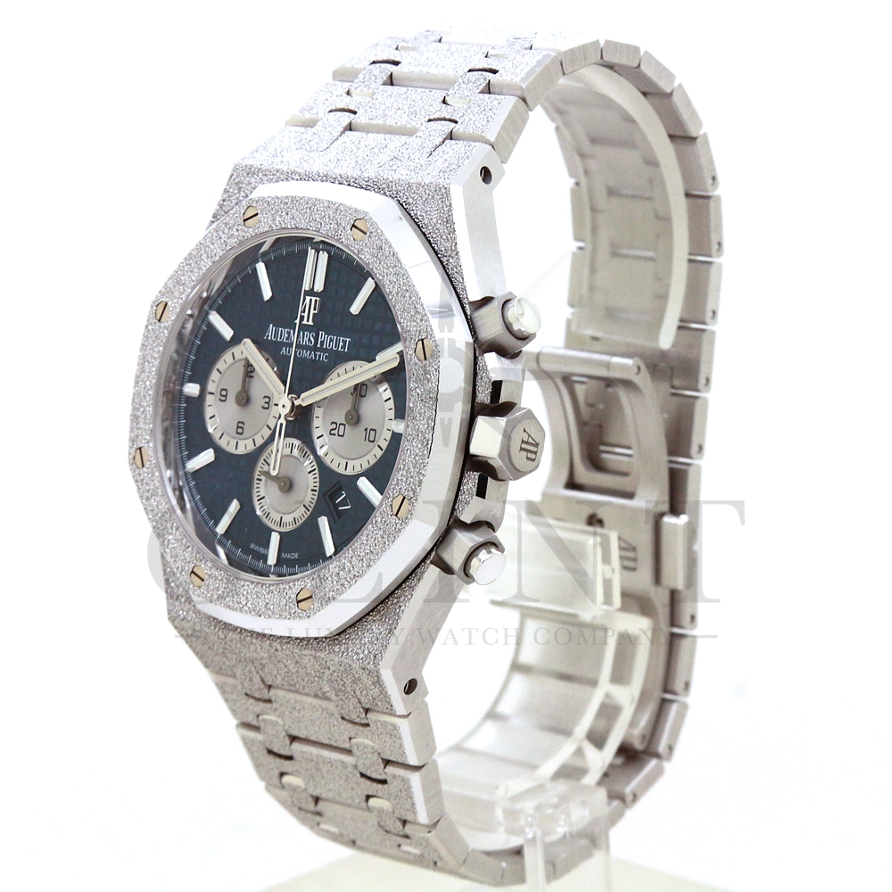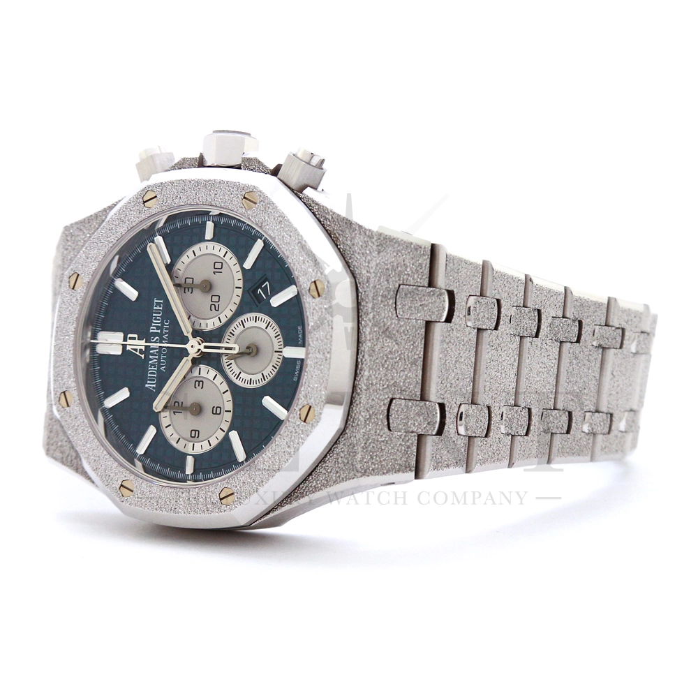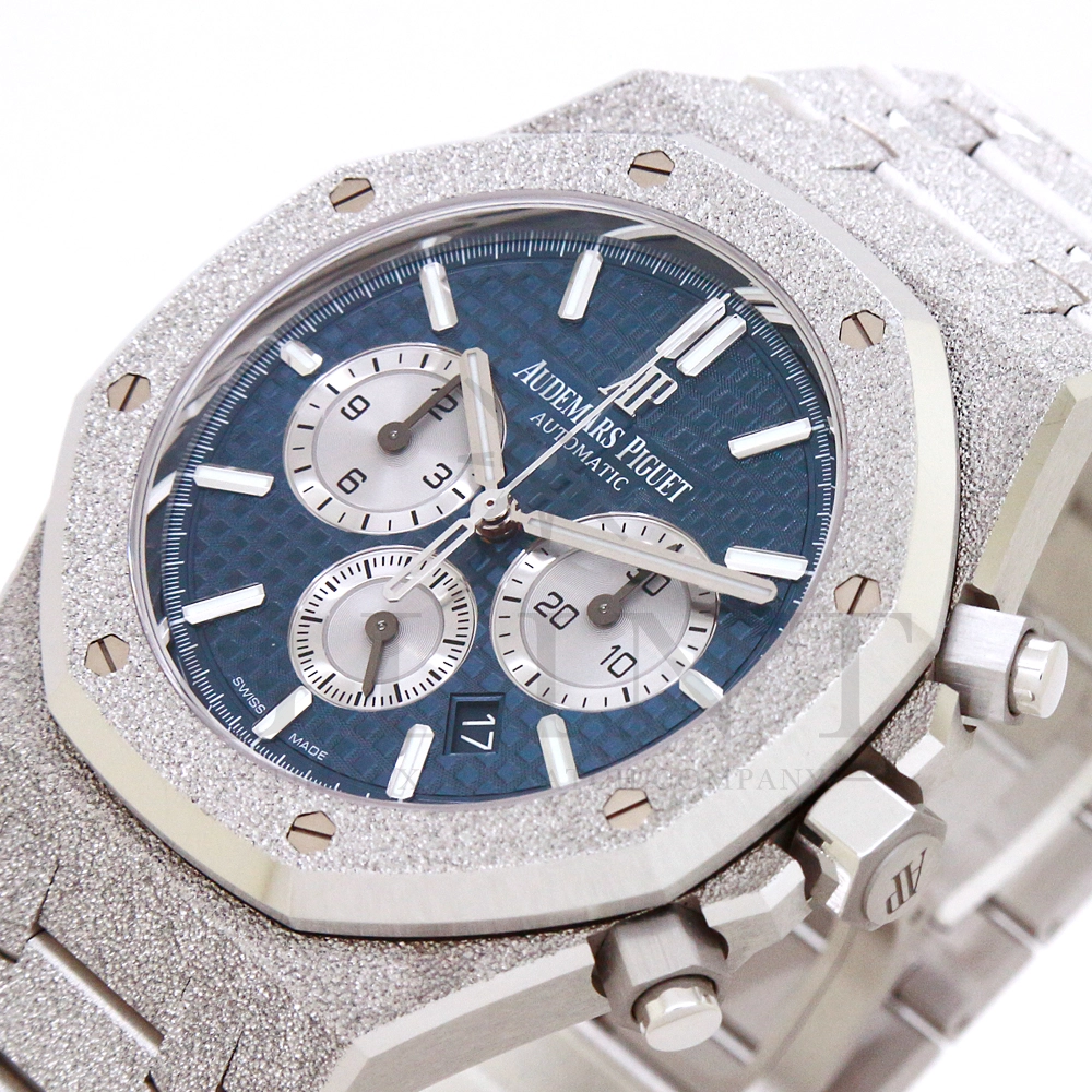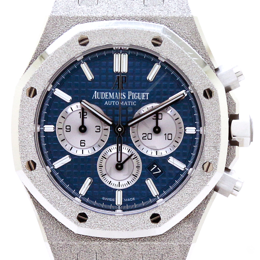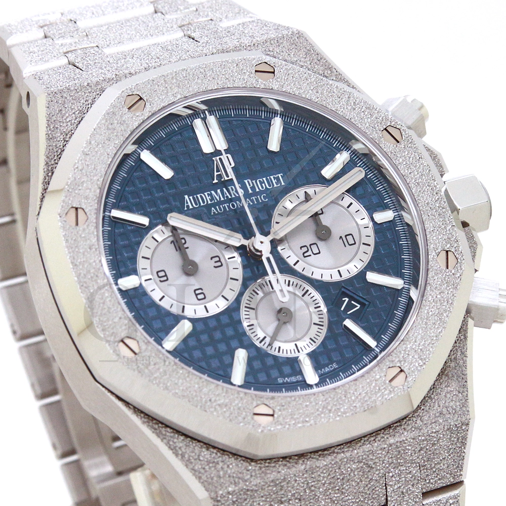 こちらはSIHH(ジュネーヴサロン)2019で発表されたジャパンブティック限定70本のロイヤルオーク フロステッド ゴールド クロノグラフです。伝統的な鍛金技法「フィレンツェ仕上げ」を表面加工に導入したフロステッドゴールドは、ハンマーの先端にモース硬度10のダイヤモンドを散りばめ、幾度も叩き込むことによって表現された繊細な模様によって、あらゆる角度から光を反射して雪の結晶のような幻想的な煌めきが特徴です。そして、文字盤は落ち着いたブルーの「グランド・タペストリー」模様にロジウムカラーのカウンターが配され、華やかな限定モデルでありながらも文字盤の色味が全体の雰囲気を引き締め、絶妙なトータルバランスを実現。フロステッドゴールドにはクロノグラフモデルが存在しておりませんでしたが、満を持して2019年に登場して以来、絶大な人気を博しております。スポーツラグジュアリーのフラッグシップモデルとしての風格を漂わせる至極の一本です。