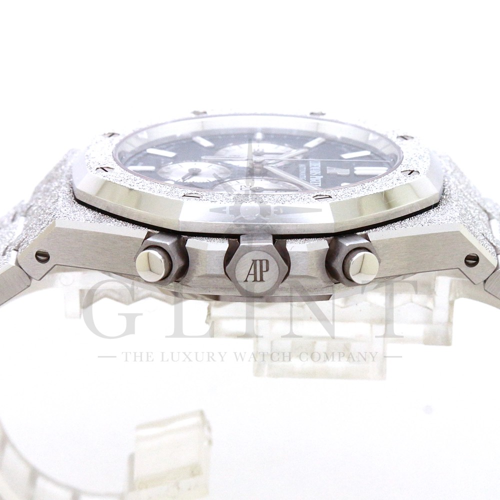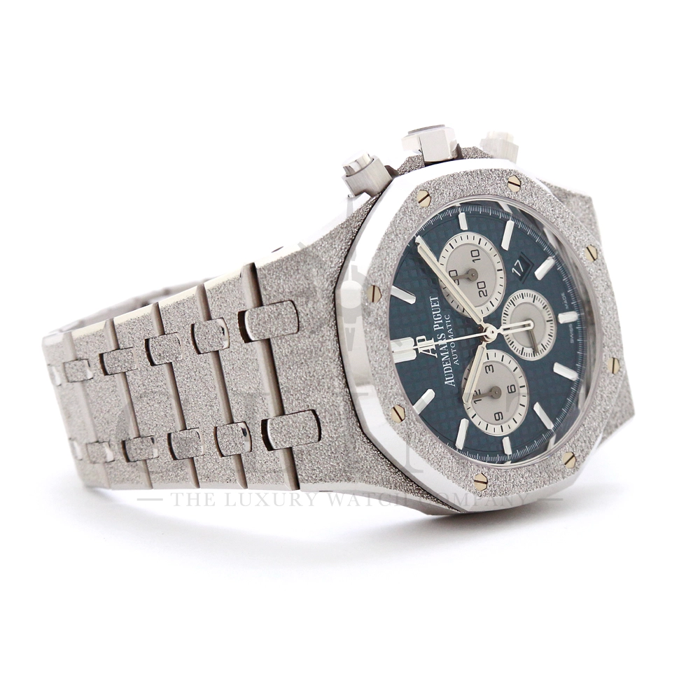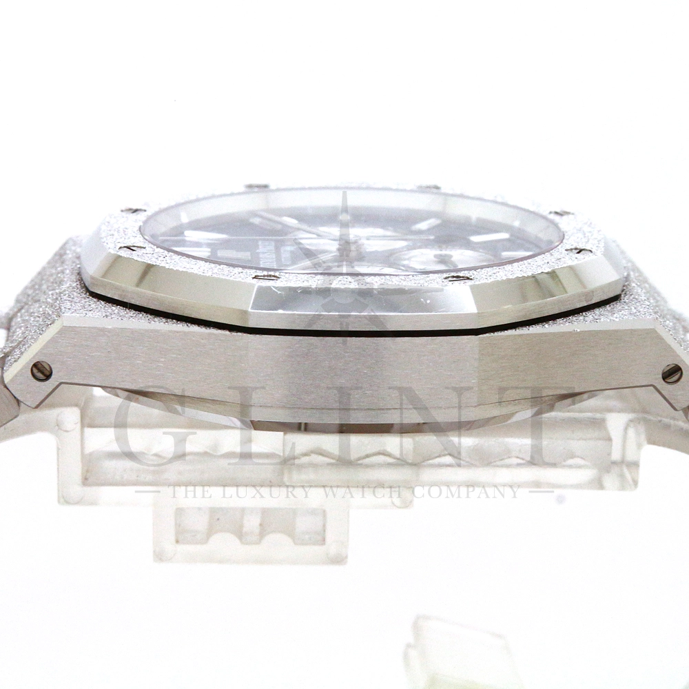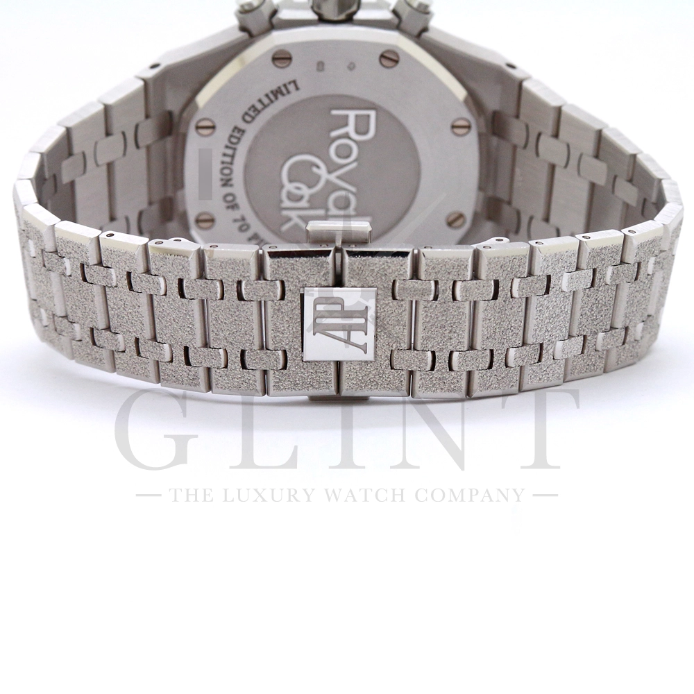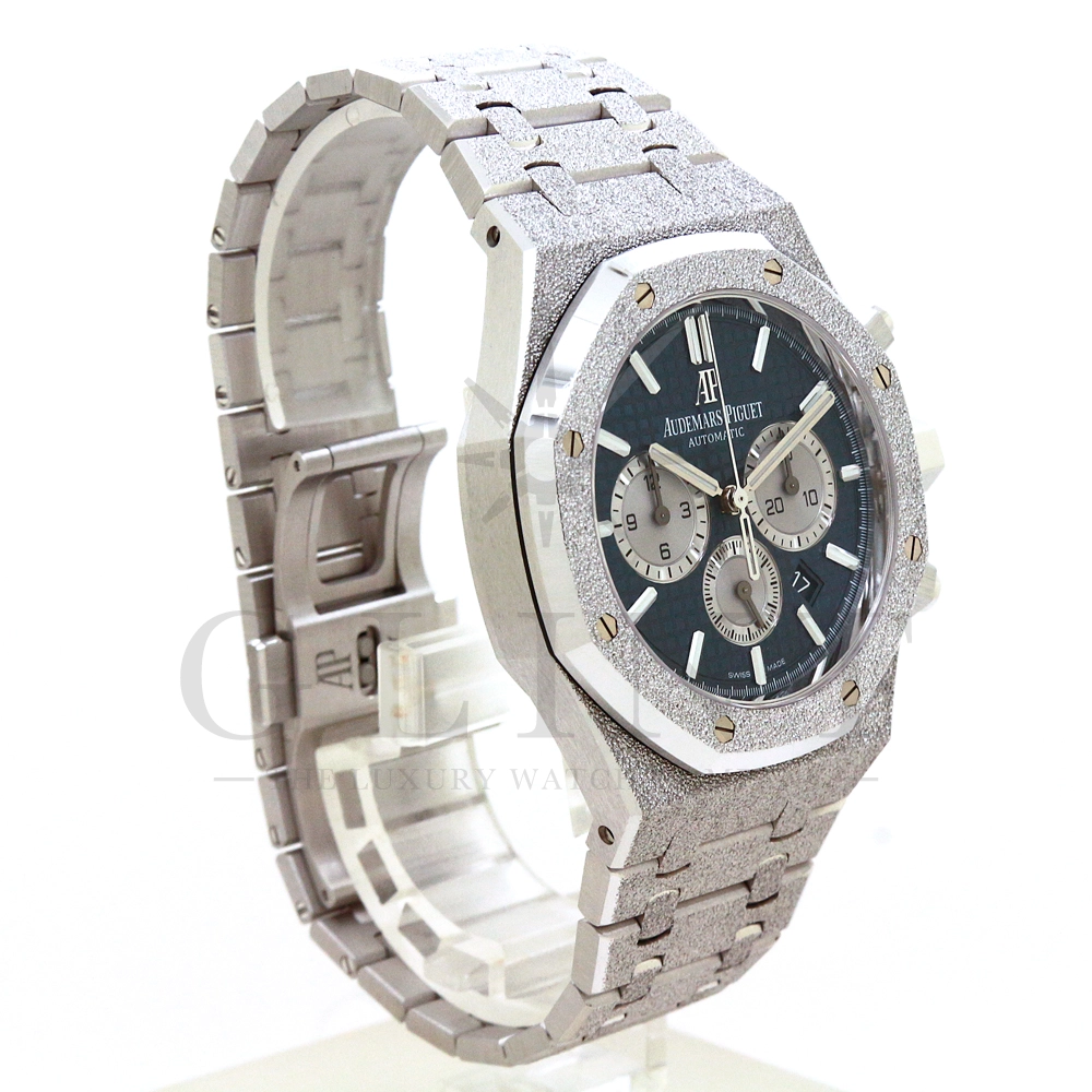 こちらはSIHH(ジュネーヴサロン)2019で発表されたジャパンブティック限定70本のロイヤルオーク フロステッド ゴールド クロノグラフです。伝統的な鍛金技法「フィレンツェ仕上げ」を表面加工に導入したフロステッドゴールドは、ハンマーの先端にモース硬度10のダイヤモンドを散りばめ、幾度も叩き込むことによって表現された繊細な模様によって、あらゆる角度から光を反射して雪の結晶のような幻想的な煌めきが特徴です。そして、文字盤は落ち着いたブルーの「グランド・タペストリー」模様にロジウムカラーのカウンターが配され、華やかな限定モデルでありながらも文字盤の色味が全体の雰囲気を引き締め、絶妙なトータルバランスを実現。フロステッドゴールドにはクロノグラフモデルが存在しておりませんでしたが、満を持して2019年に登場して以来、絶大な人気を博しております。スポーツラグジュアリーのフラッグシップモデルとしての風格を漂わせる至極の一本です。