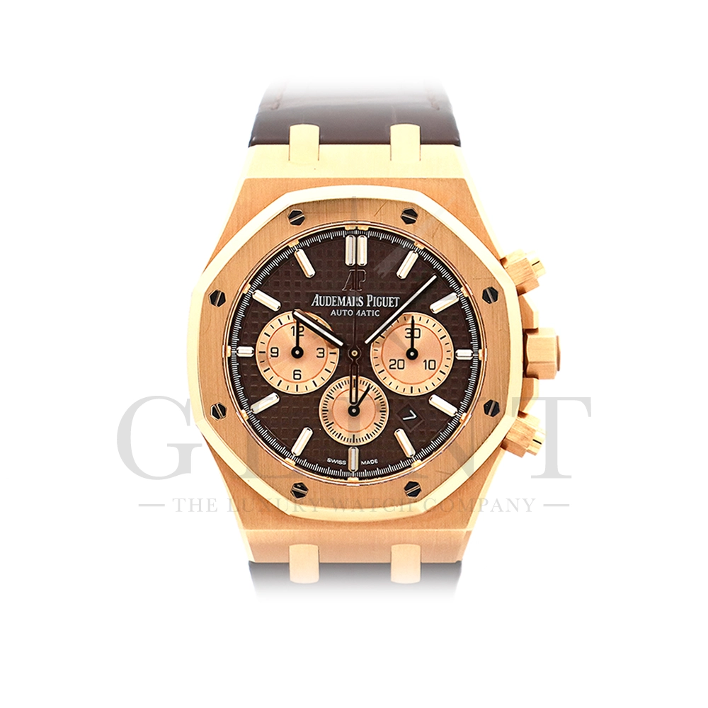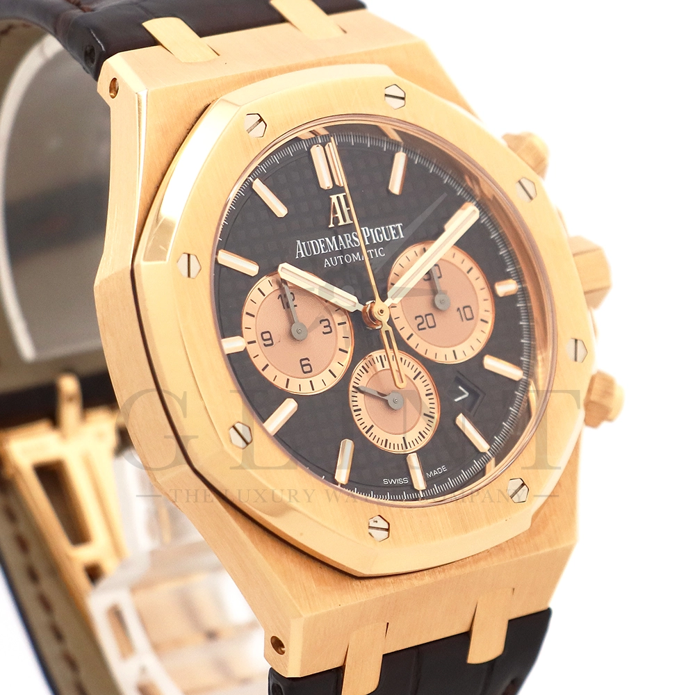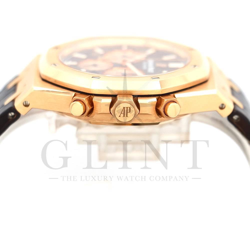 文字盤:「グランド・タペストリー」模様のブラウンダイヤル、ピンクゴールドカラーのカウンター、ピンクゴールド製アプライドアワーマーカーと蓄光処理を施したロイヤルオーク針