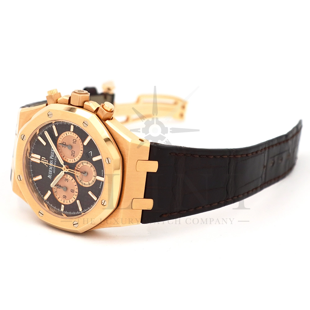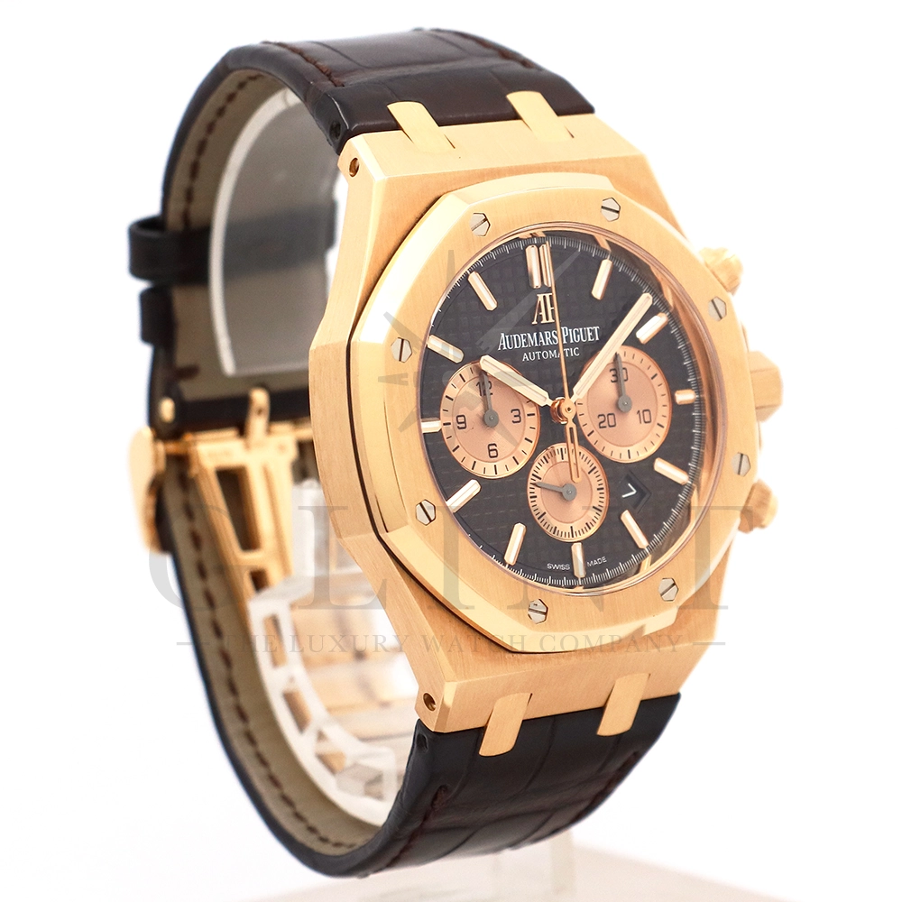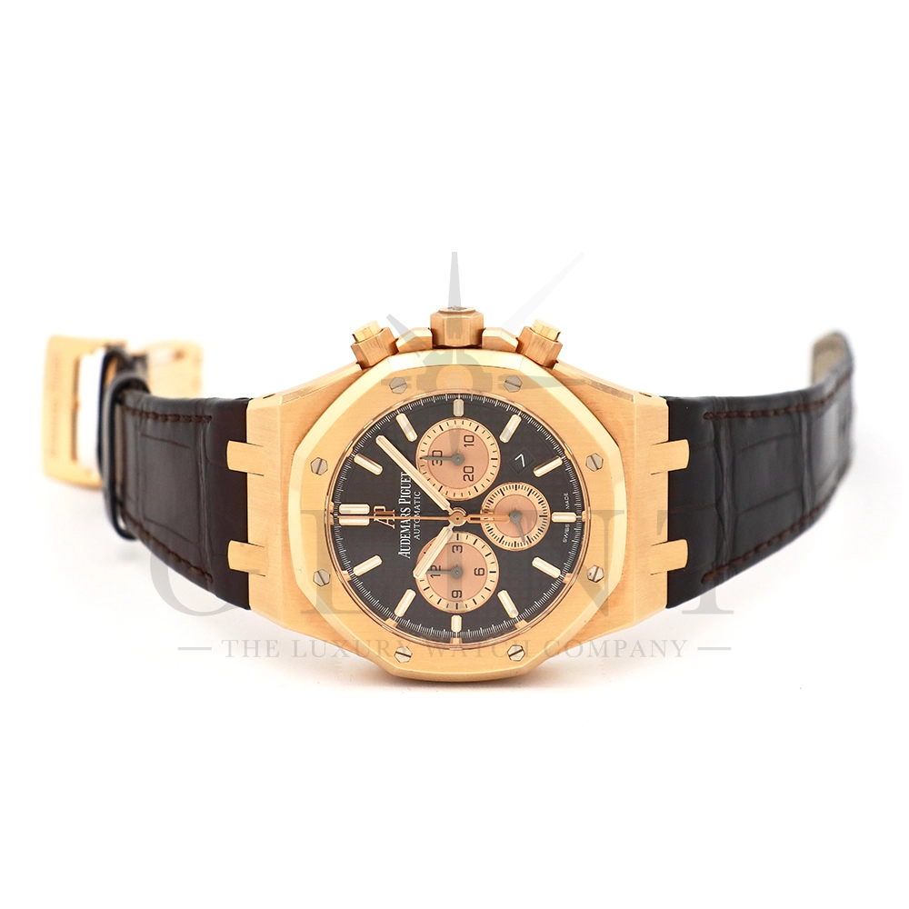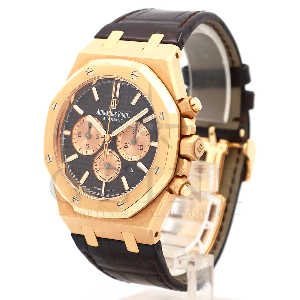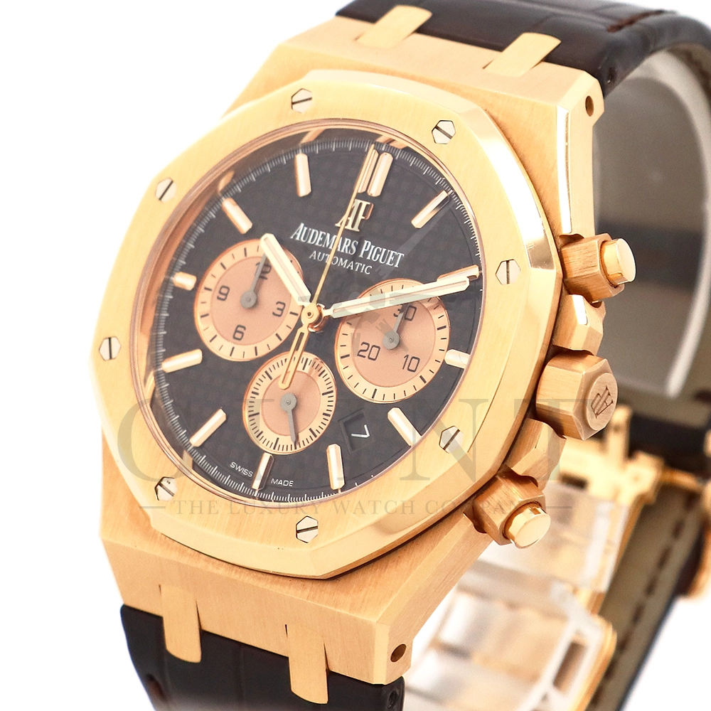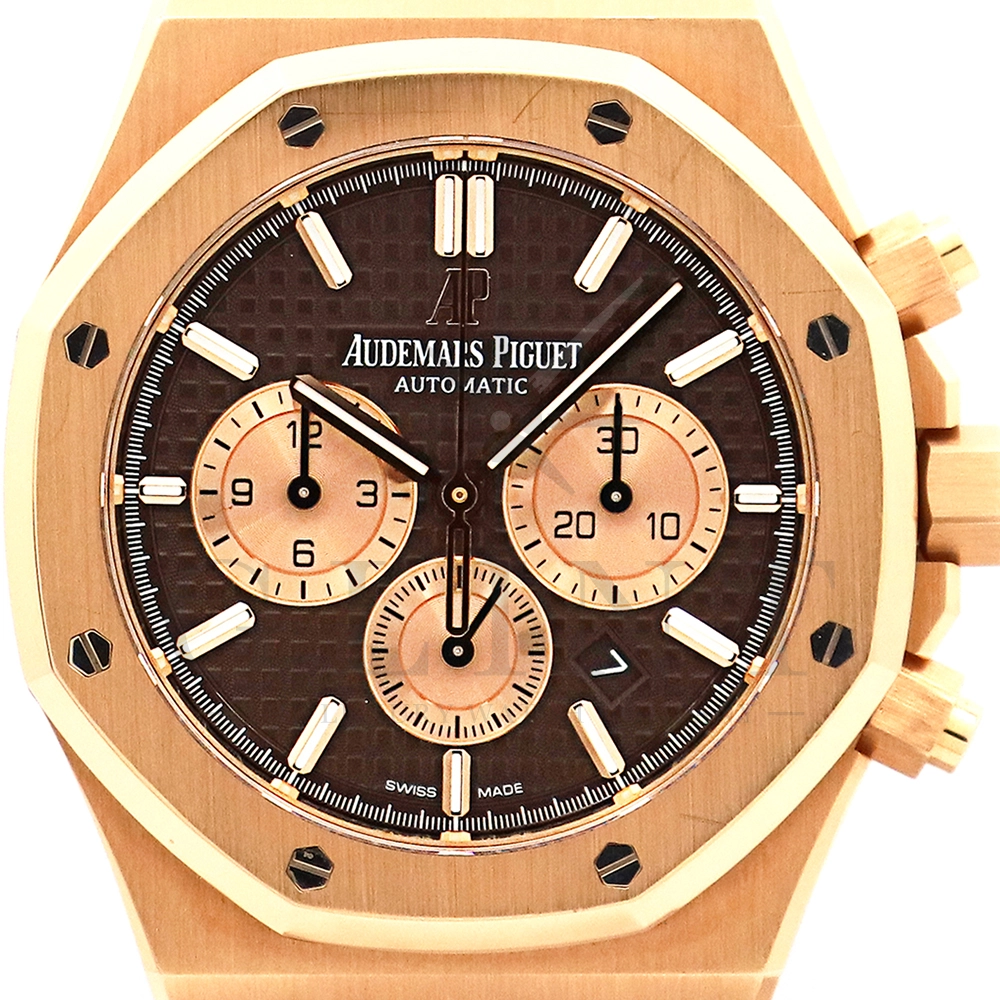 こちらはロイヤル オーク クロノグラフです。SIHH(ジュネーヴサロン)2017にてロイヤル オーク クロノグラフ20周年記念モデルとして発表されたモデル。ケース素材には18Kピンクゴールドを使用しており、洗練された上質な高級感を堪能できるでしょう。装い新たになったコンビカラーのダイヤルには落ち着いた印象のブラウンカラーの「グランド・タペストリー」模様を採用。3時位置・9時位置のサイズが大きくなったカウンターや短く幅が広くなったインデックス、蓄光処理箇所を増やすなど、高い視認性を確保する為の新しい要素が取り入れた仕上がりとなっております。スポーツラインという位置付けのロイヤルオークですが、18Kピンクゴールドとブラウンのアリゲーターストラップの組み合わせによって、落ち着きのある大人のドレスウォッチとしても活躍してくれるでしょう。世界三大時計ブランドが誇る人気のロイヤル オーク クロノグラフは所有者を格別な気持ちにさせてくれる事は間違いないステータス性にも富んだ極上の一本です。