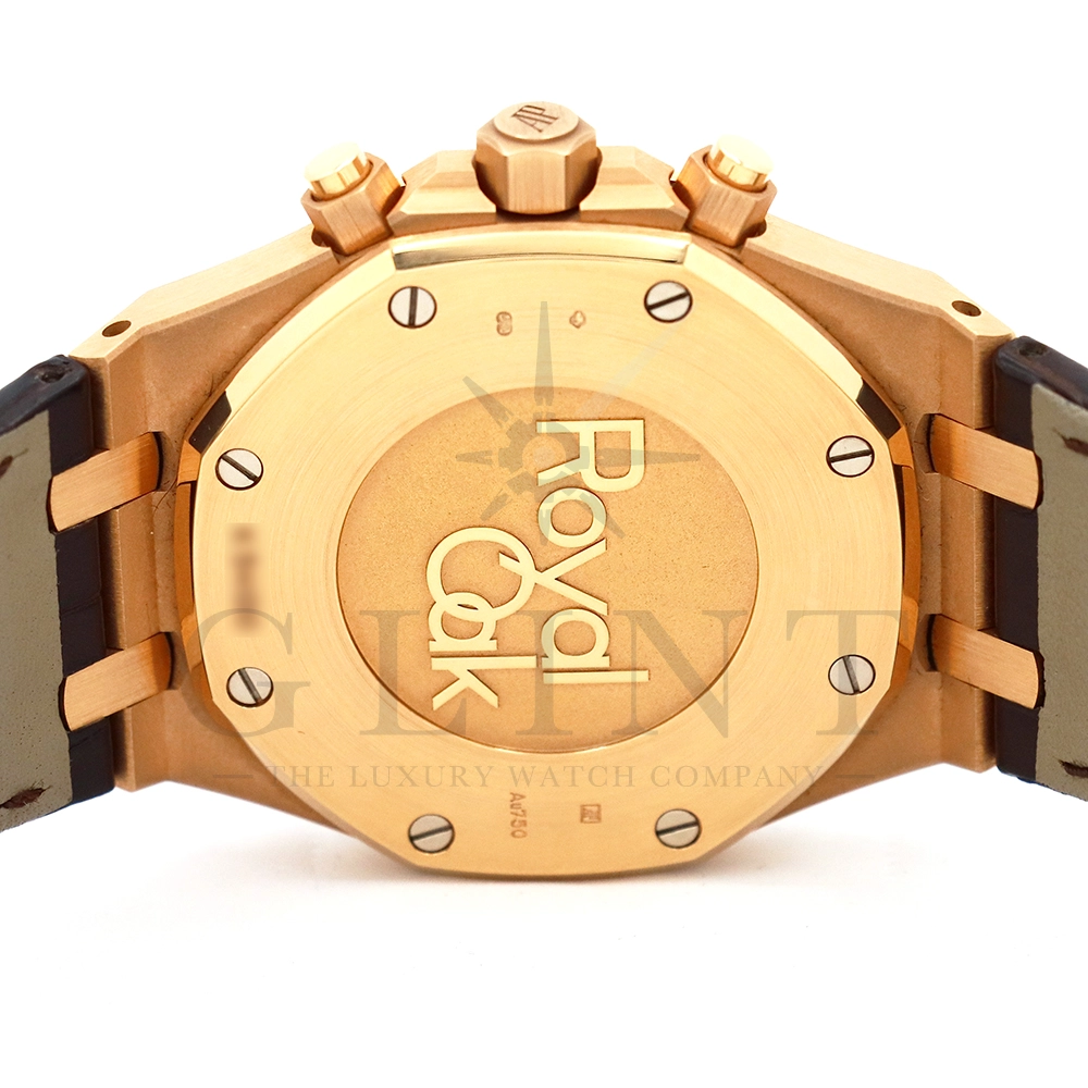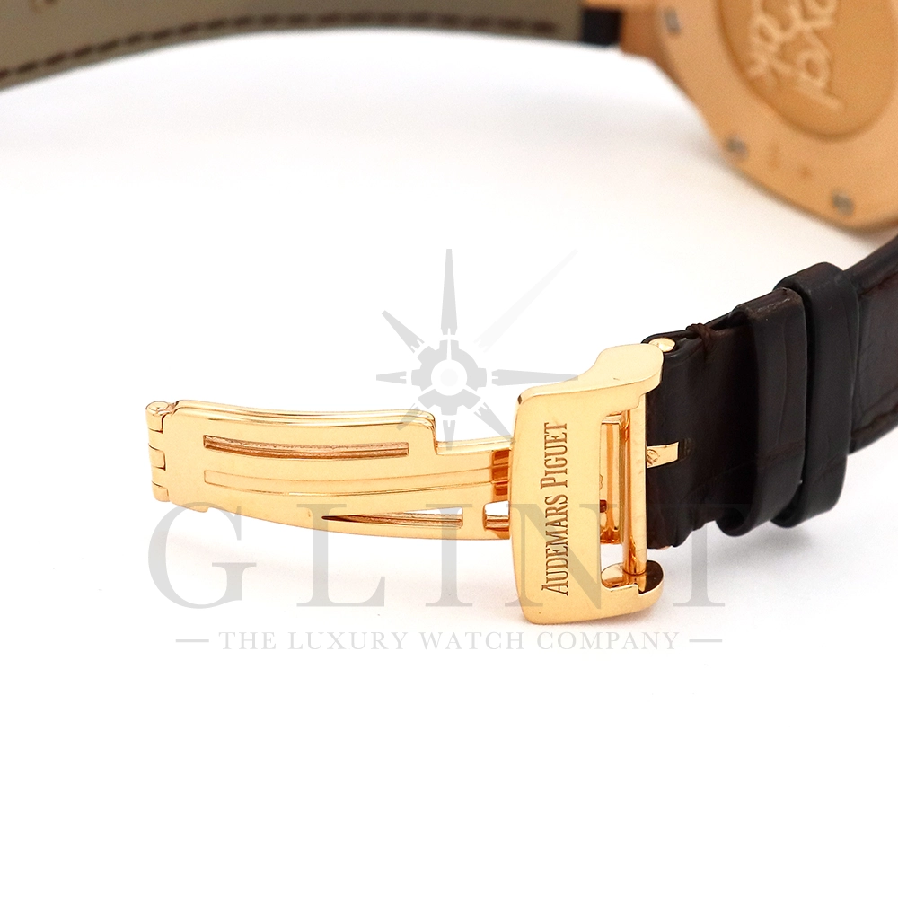 ストラップ:ハンドステッチの「大きな竹斑入り」のブラウンアリゲーターストラップ 18Kピンクゴールド製APフォールディングバックル