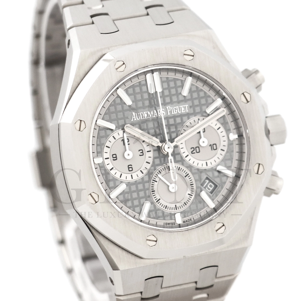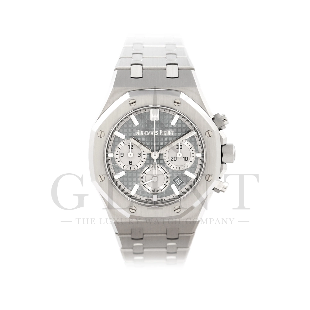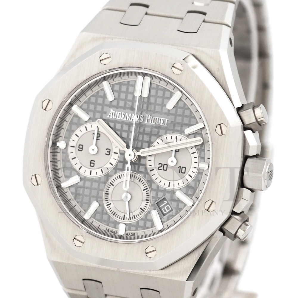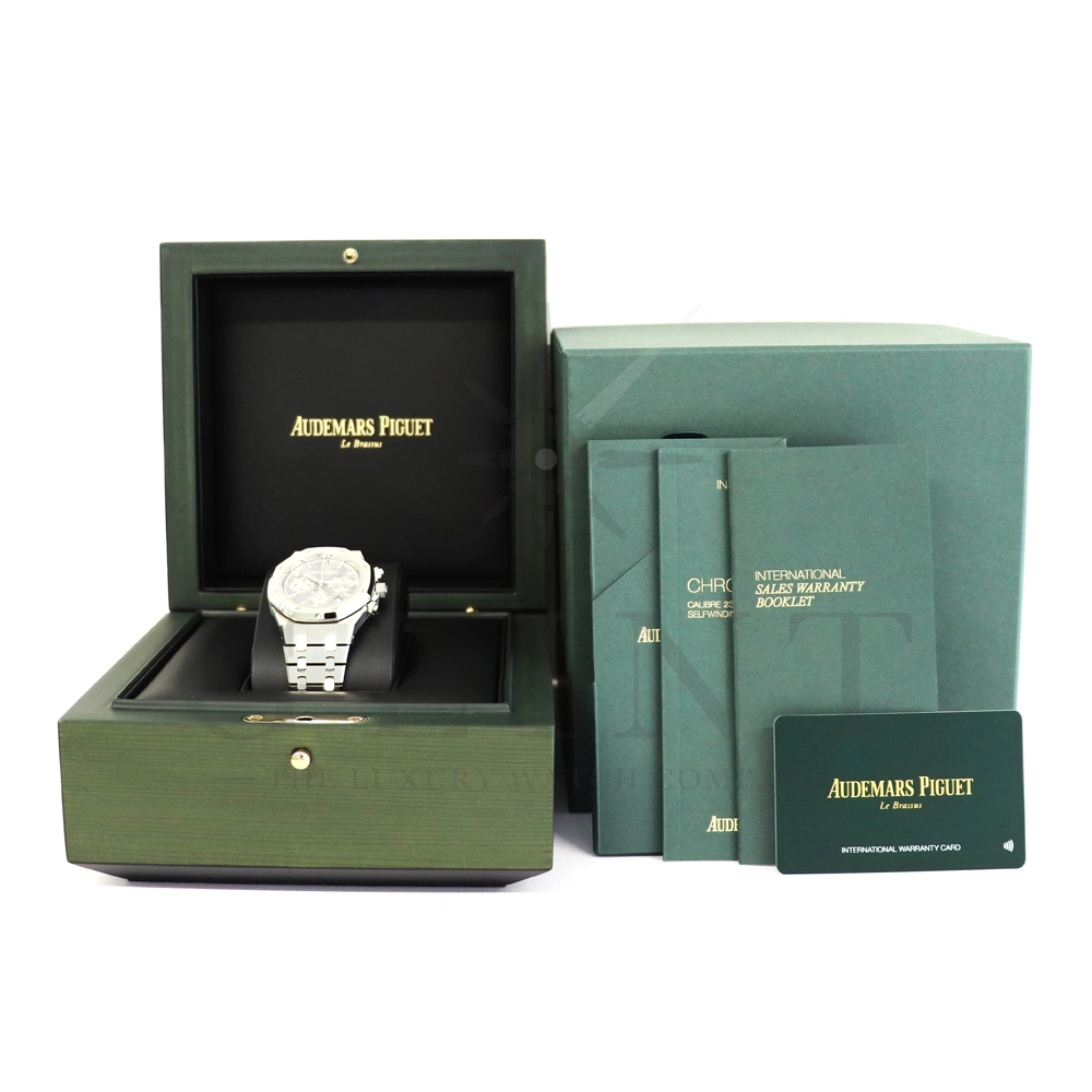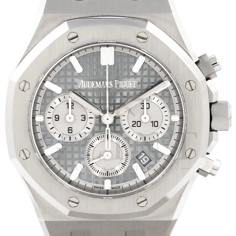 文字盤:「グランドタペストリー」模様のグレーダイヤル、シルバーカラーのカウンター、蓄光処理を施したホワイトゴールドのアプライドアワーマーカーとロイヤルオーク針