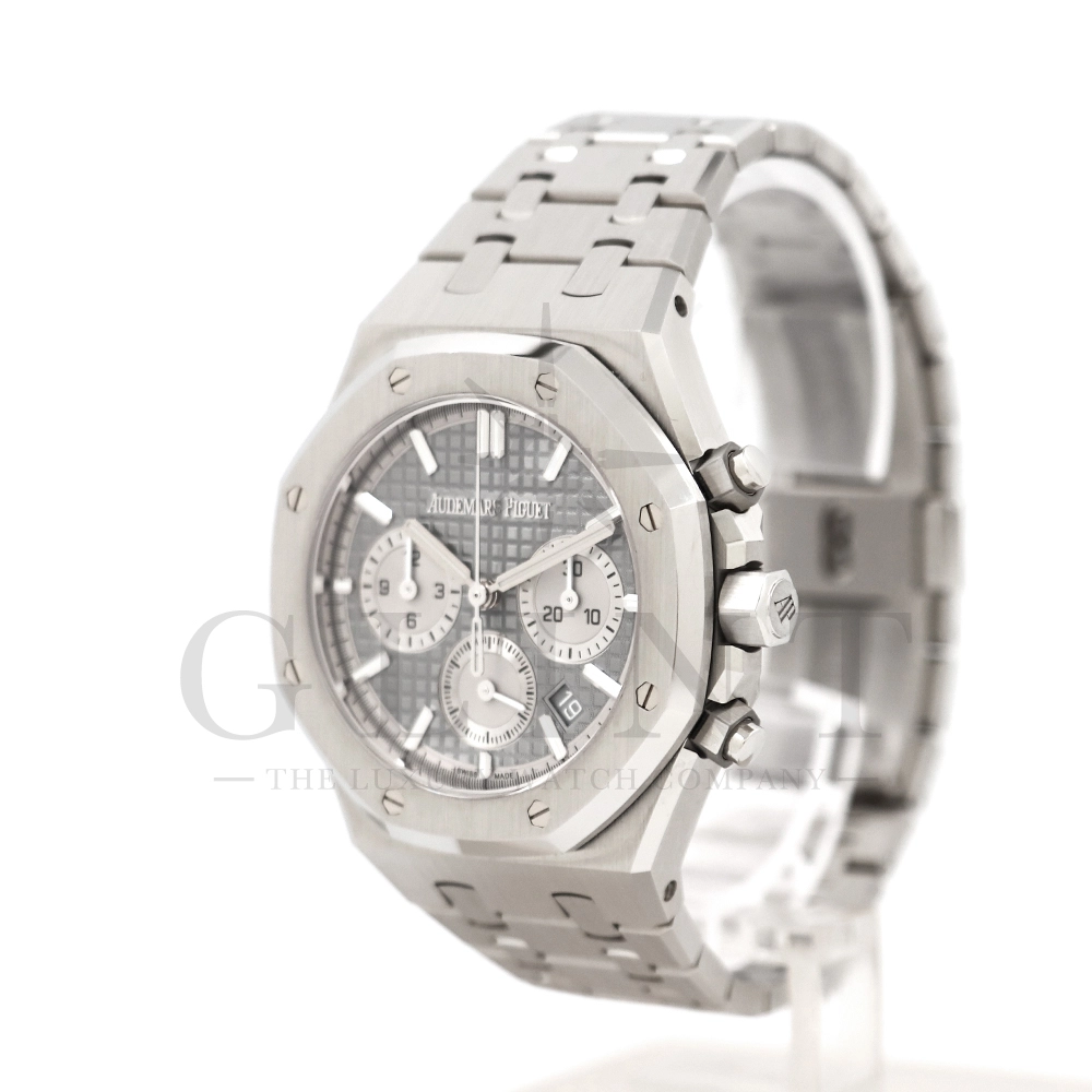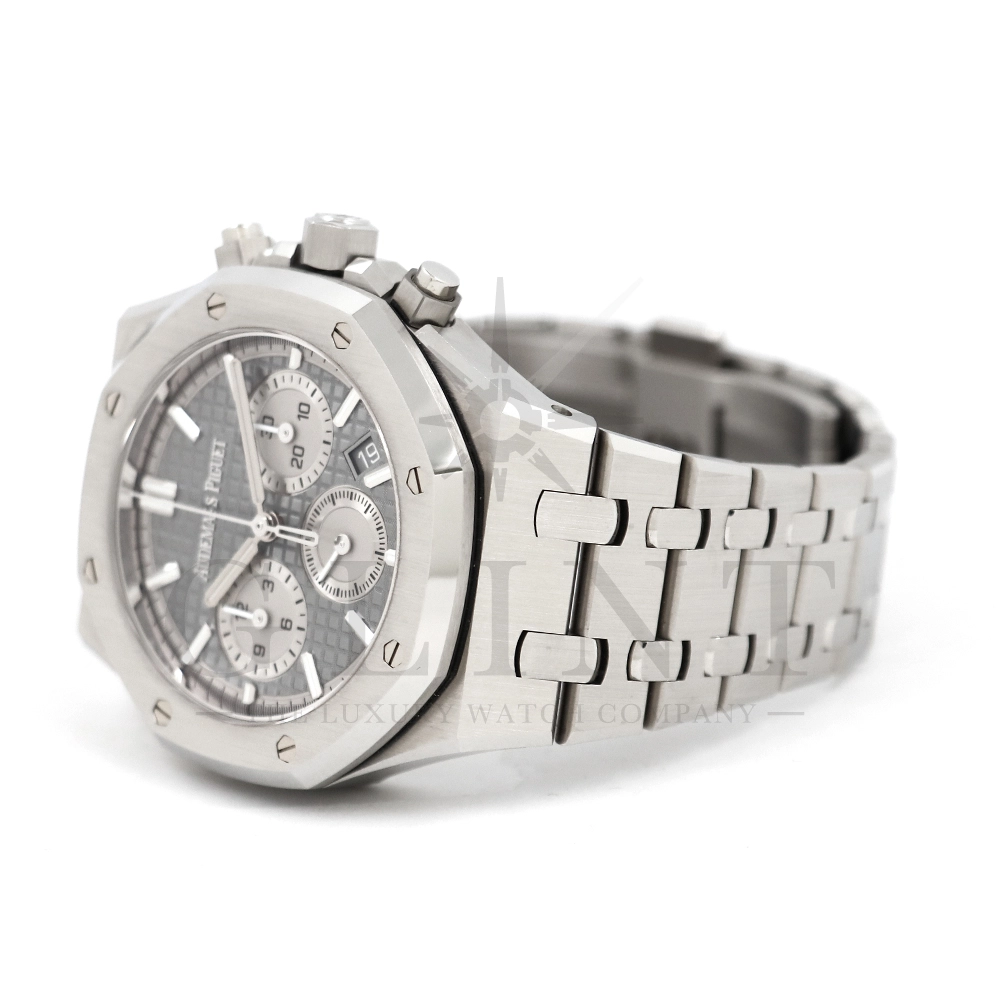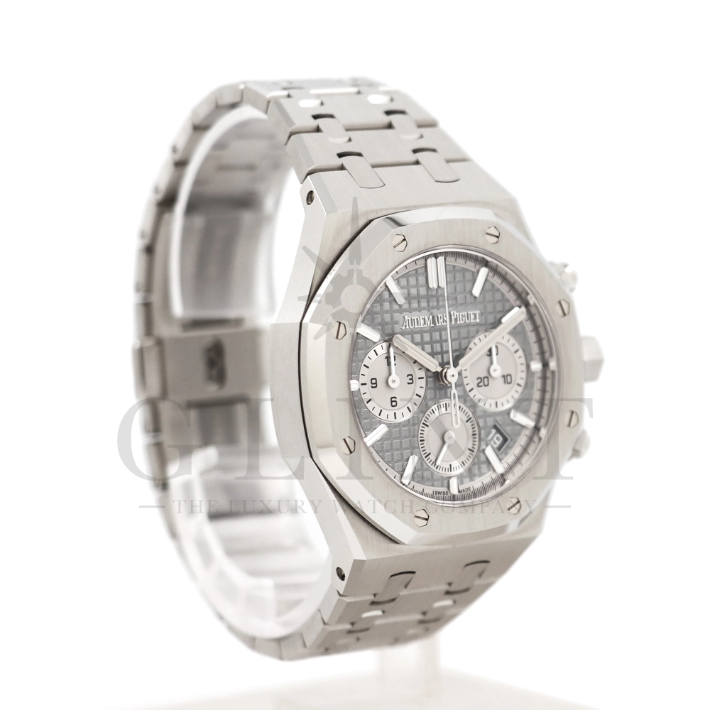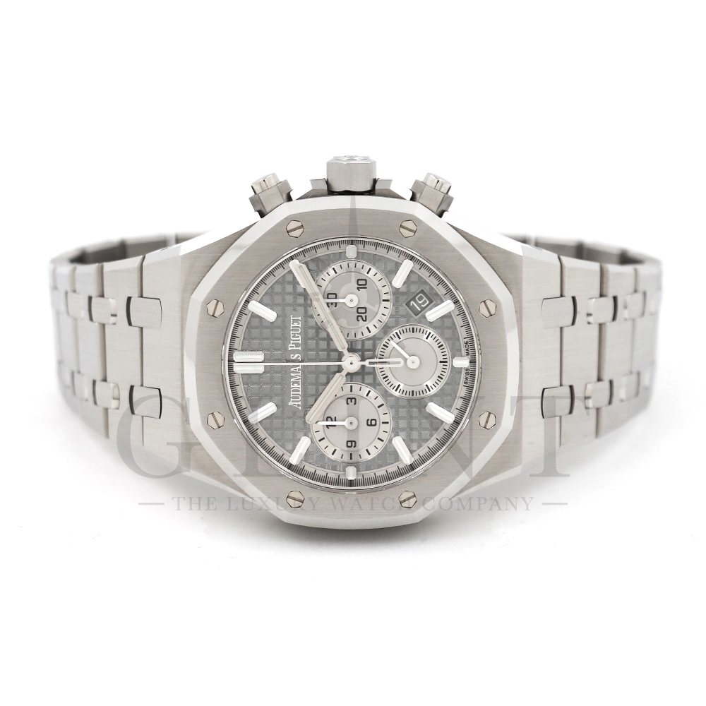 文字盤:「グランドタペストリー」模様のグレーダイヤル、シルバーカラーのカウンター、蓄光処理を施したホワイトゴールドのアプライドアワーマーカーとロイヤルオーク針