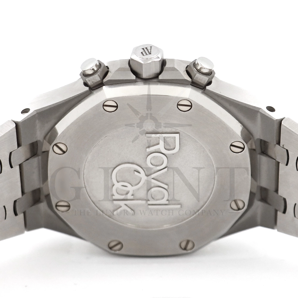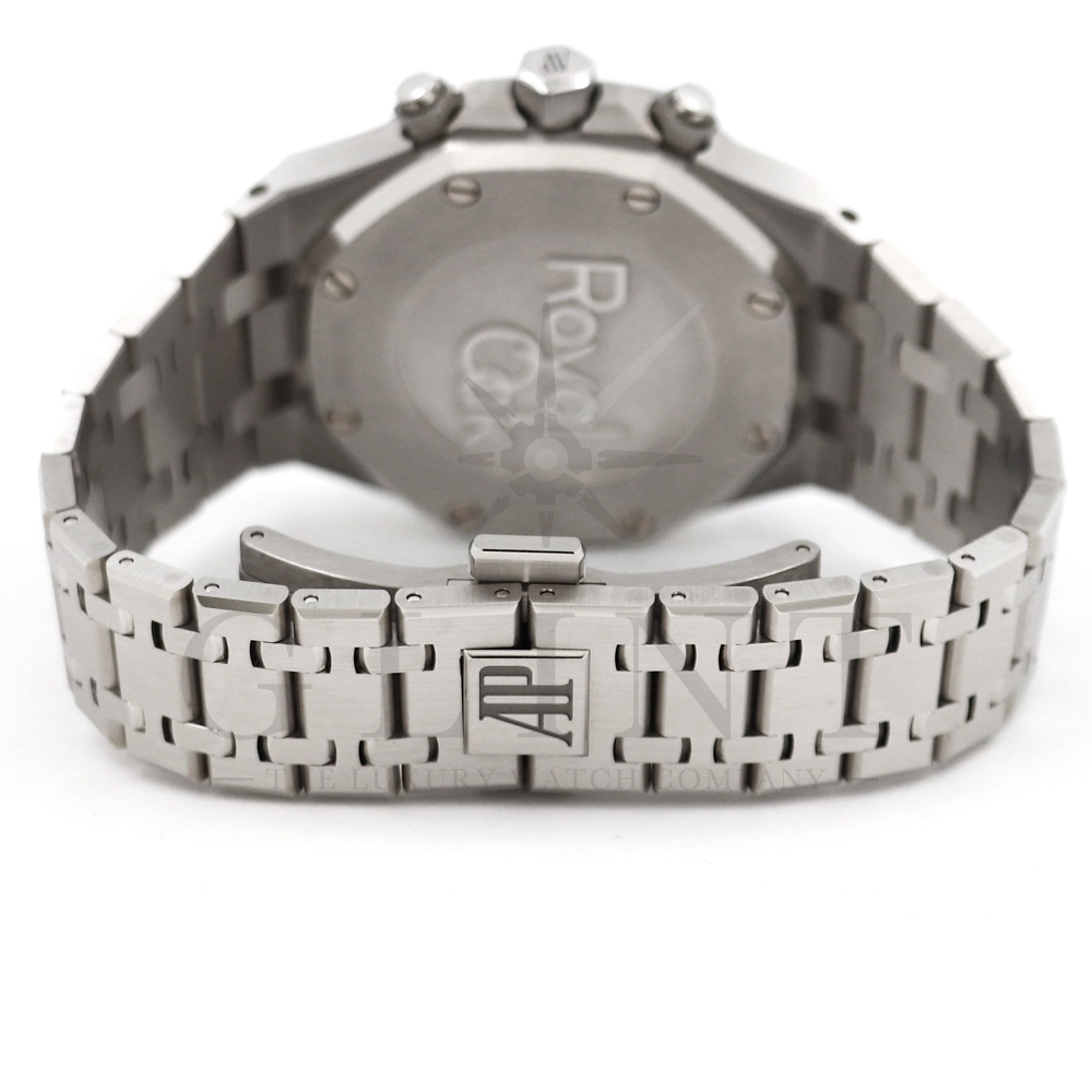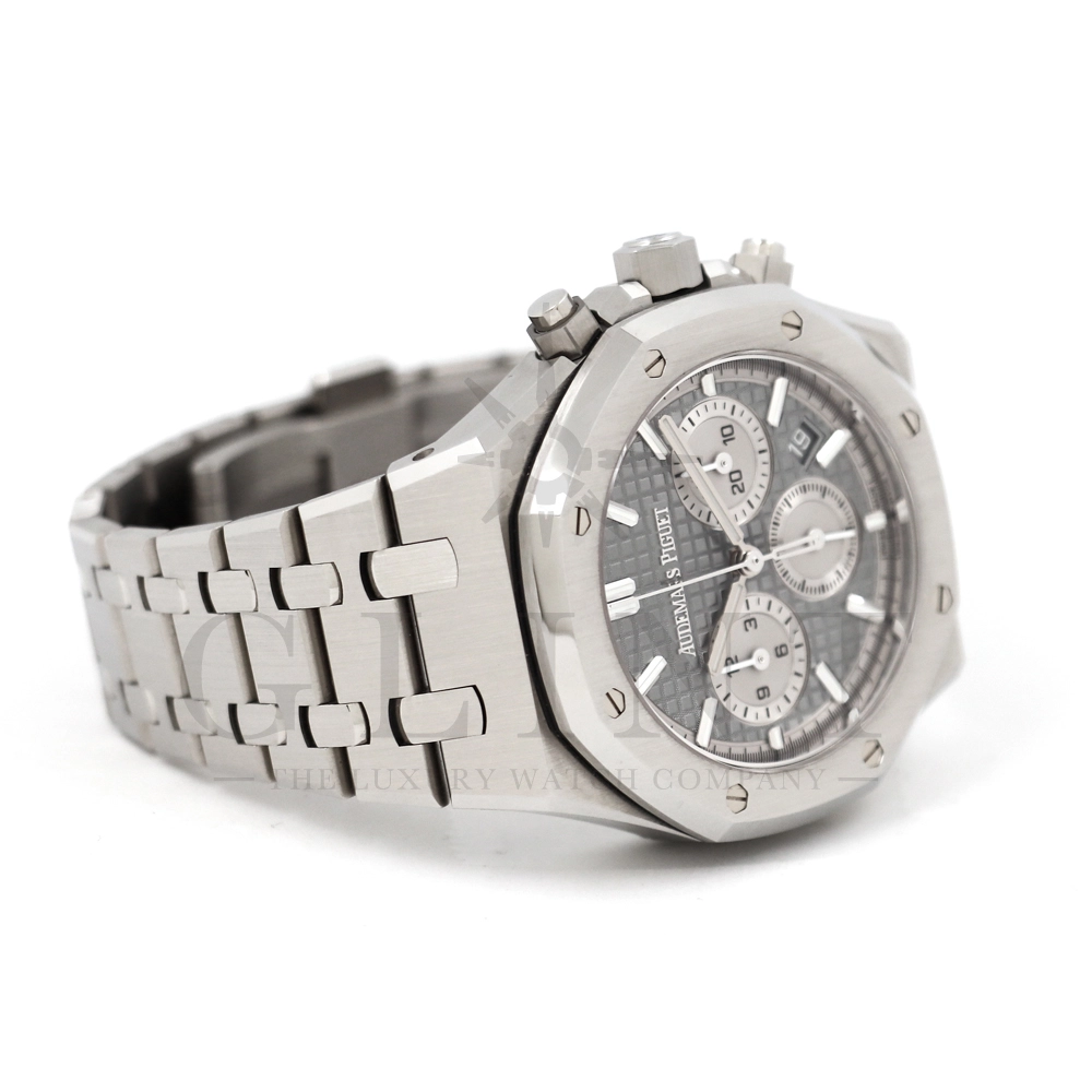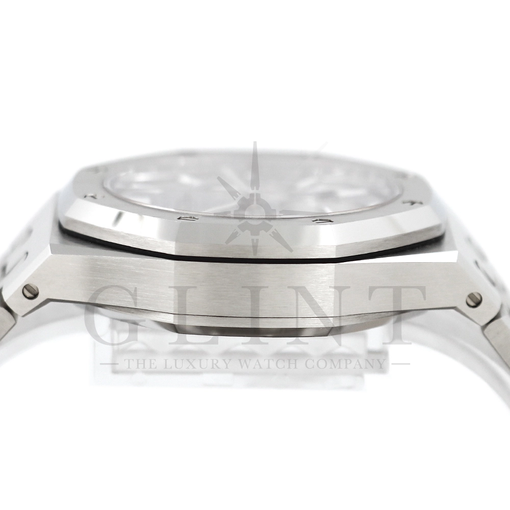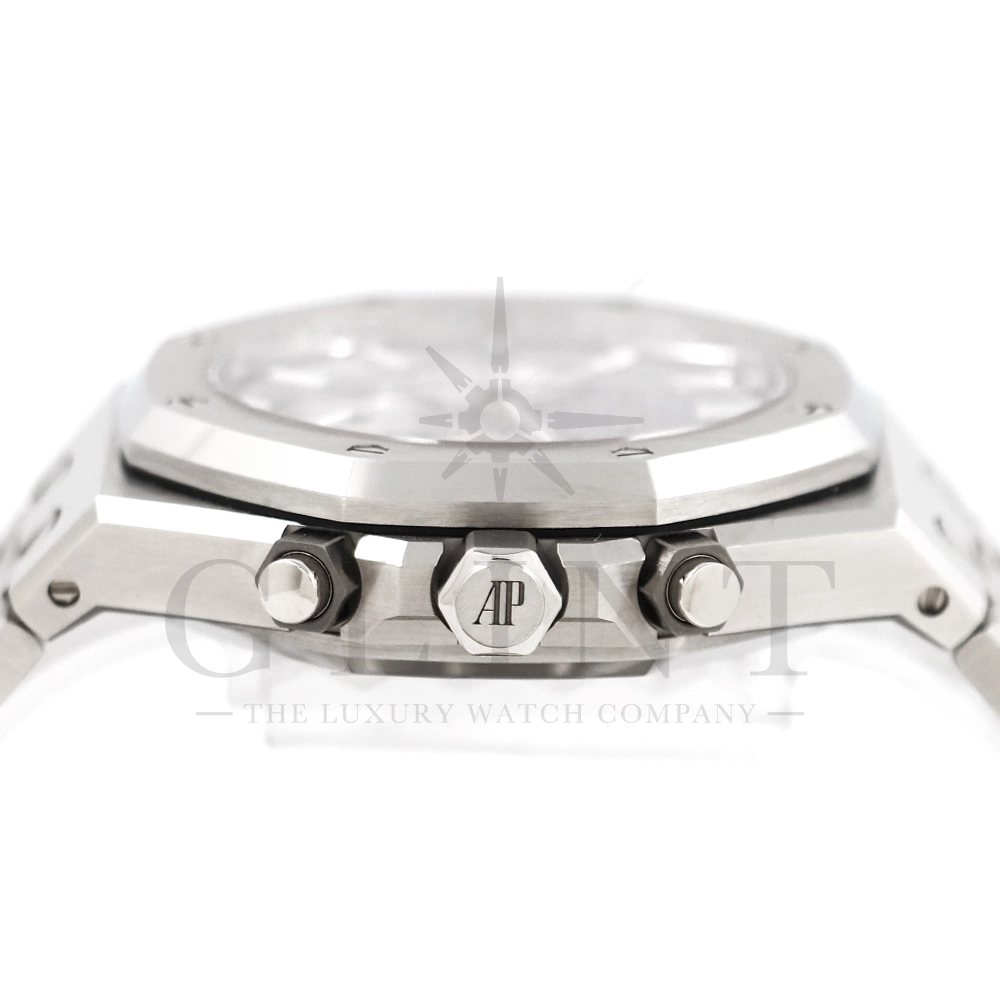 文字盤:「グランドタペストリー」模様のグレーダイヤル、シルバーカラーのカウンター、蓄光処理を施したホワイトゴールドのアプライドアワーマーカーとロイヤルオーク針