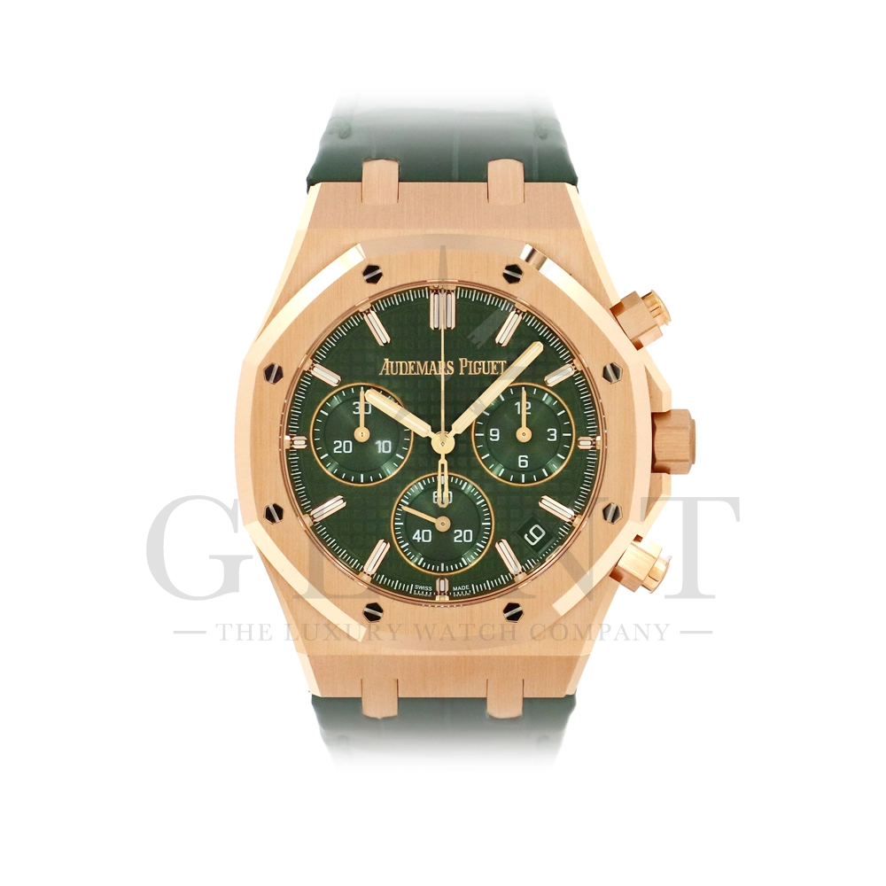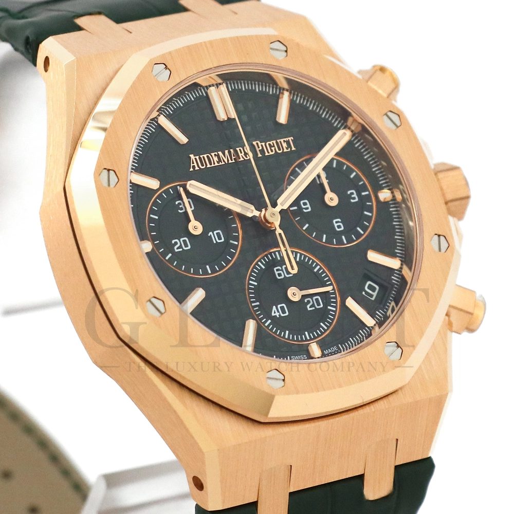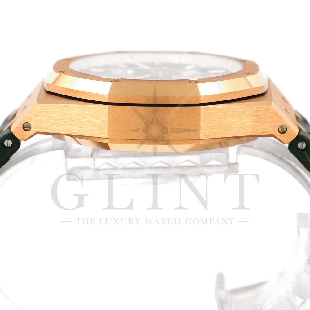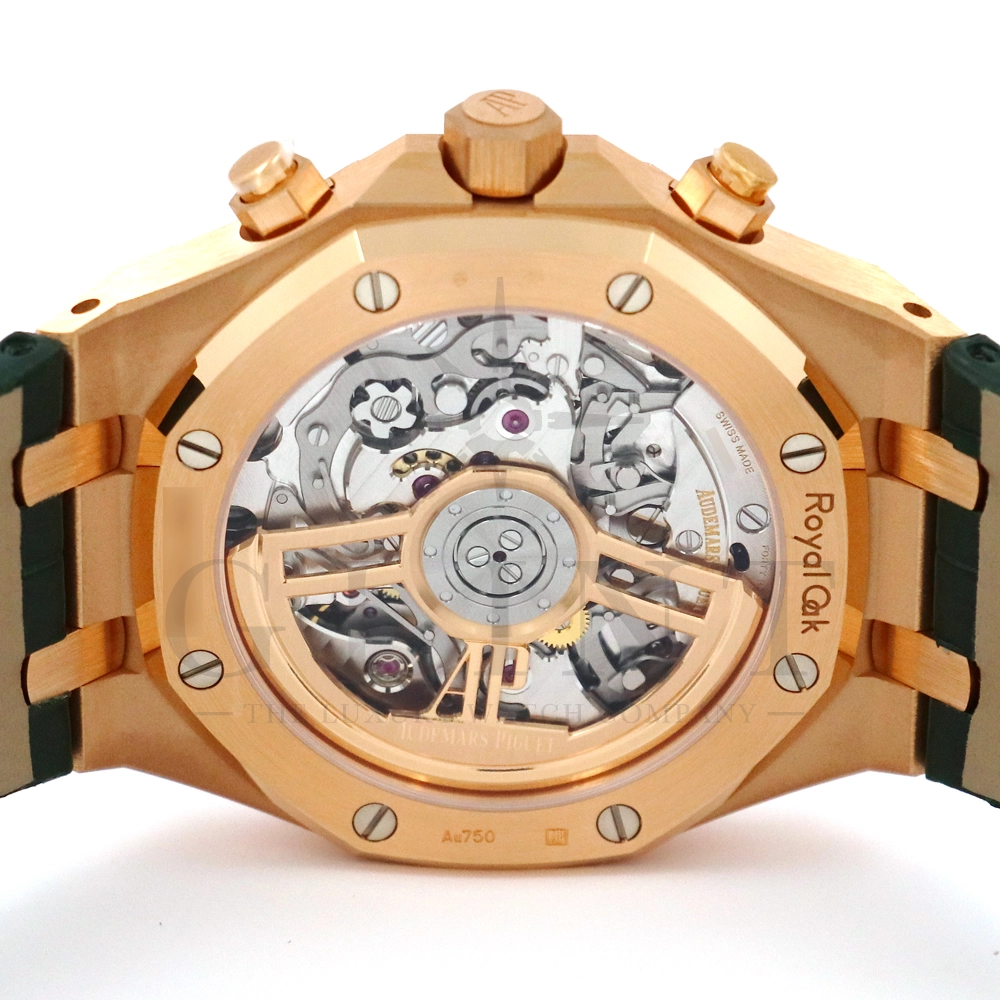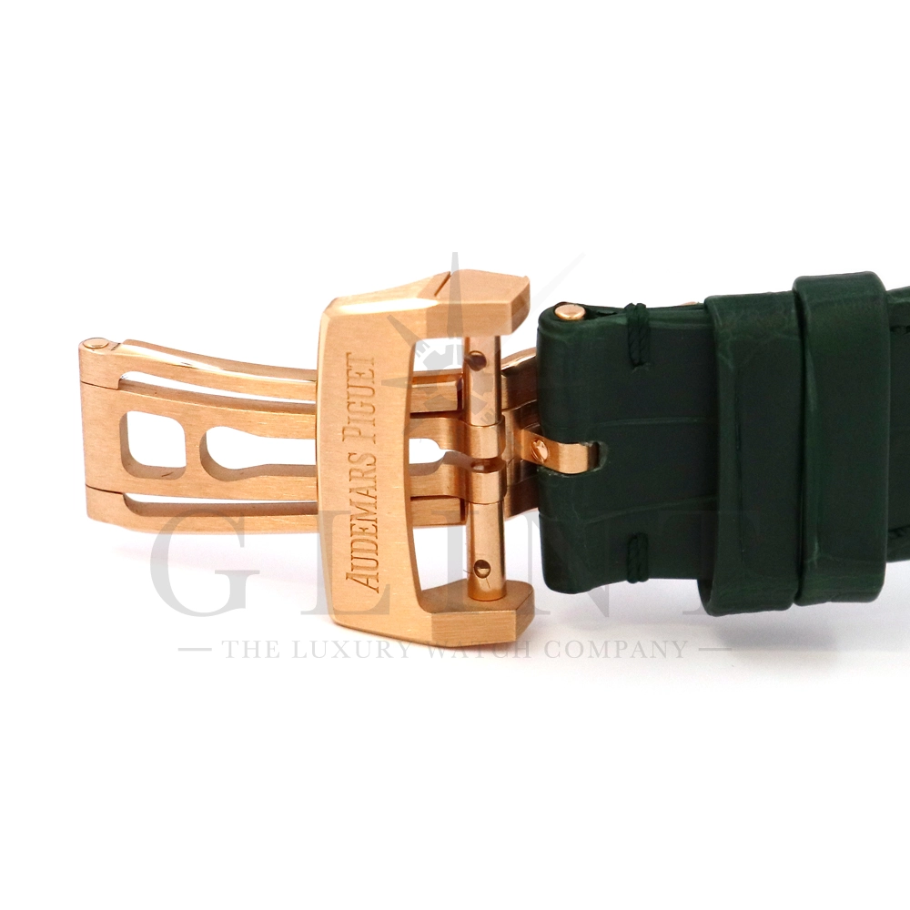 文字盤:「グランドタペストリー」模様のカーキグリーンダイヤル、グリーンカウンター、蓄光処理を施したピンクゴールドのアプライドアワーマーカーとロイヤルオーク針