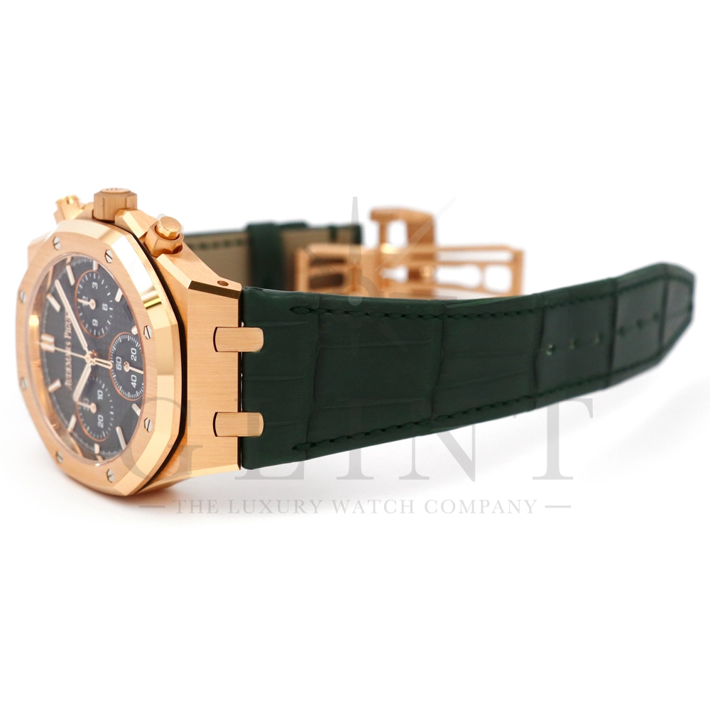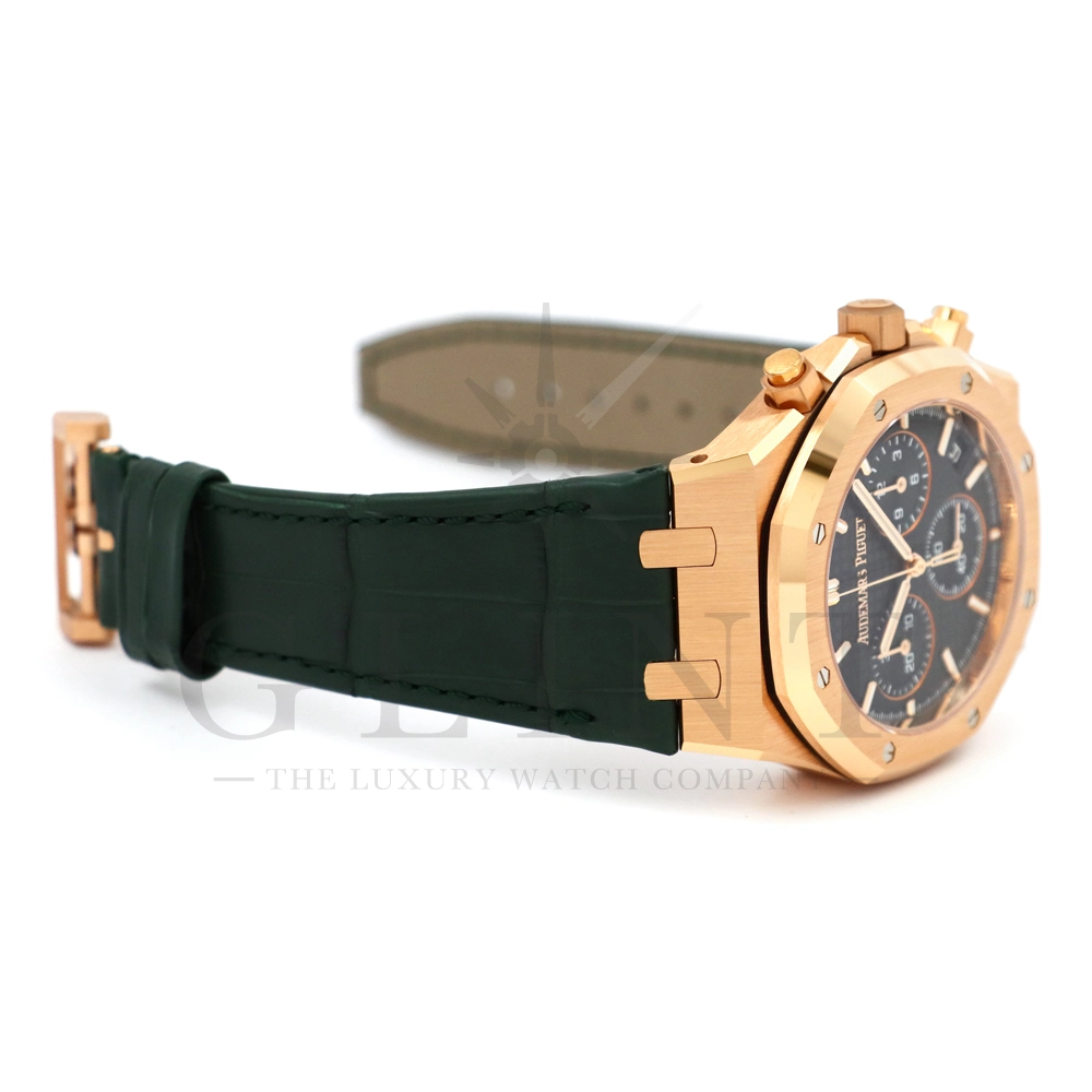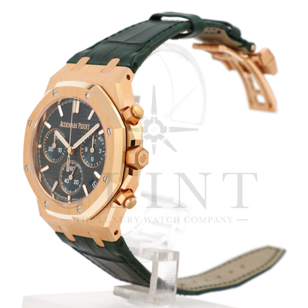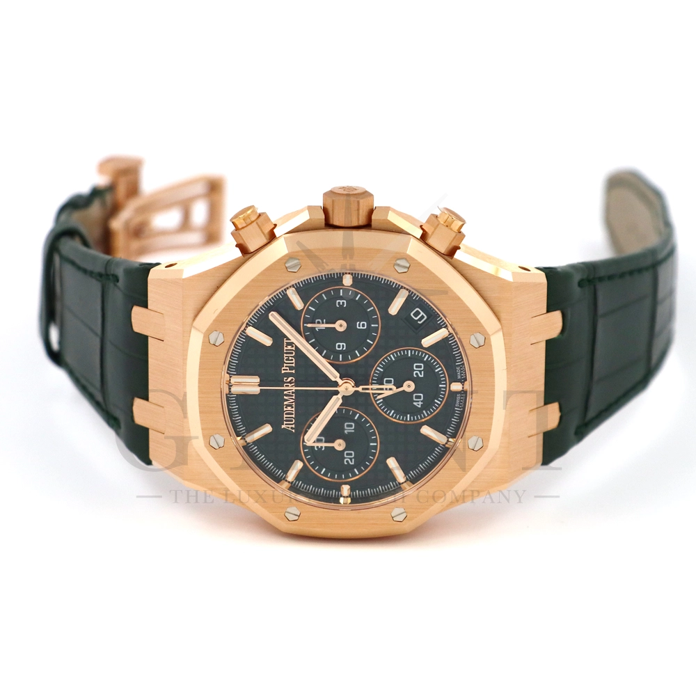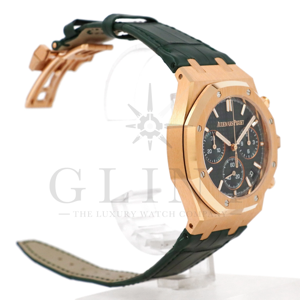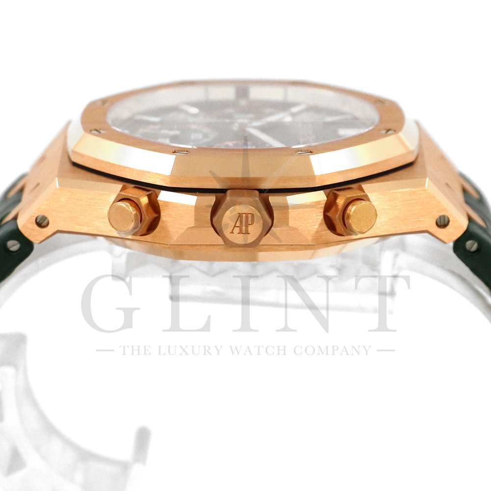 文字盤:「グランドタペストリー」模様のカーキグリーンダイヤル、グリーンカウンター、蓄光処理を施したピンクゴールドのアプライドアワーマーカーとロイヤルオーク針