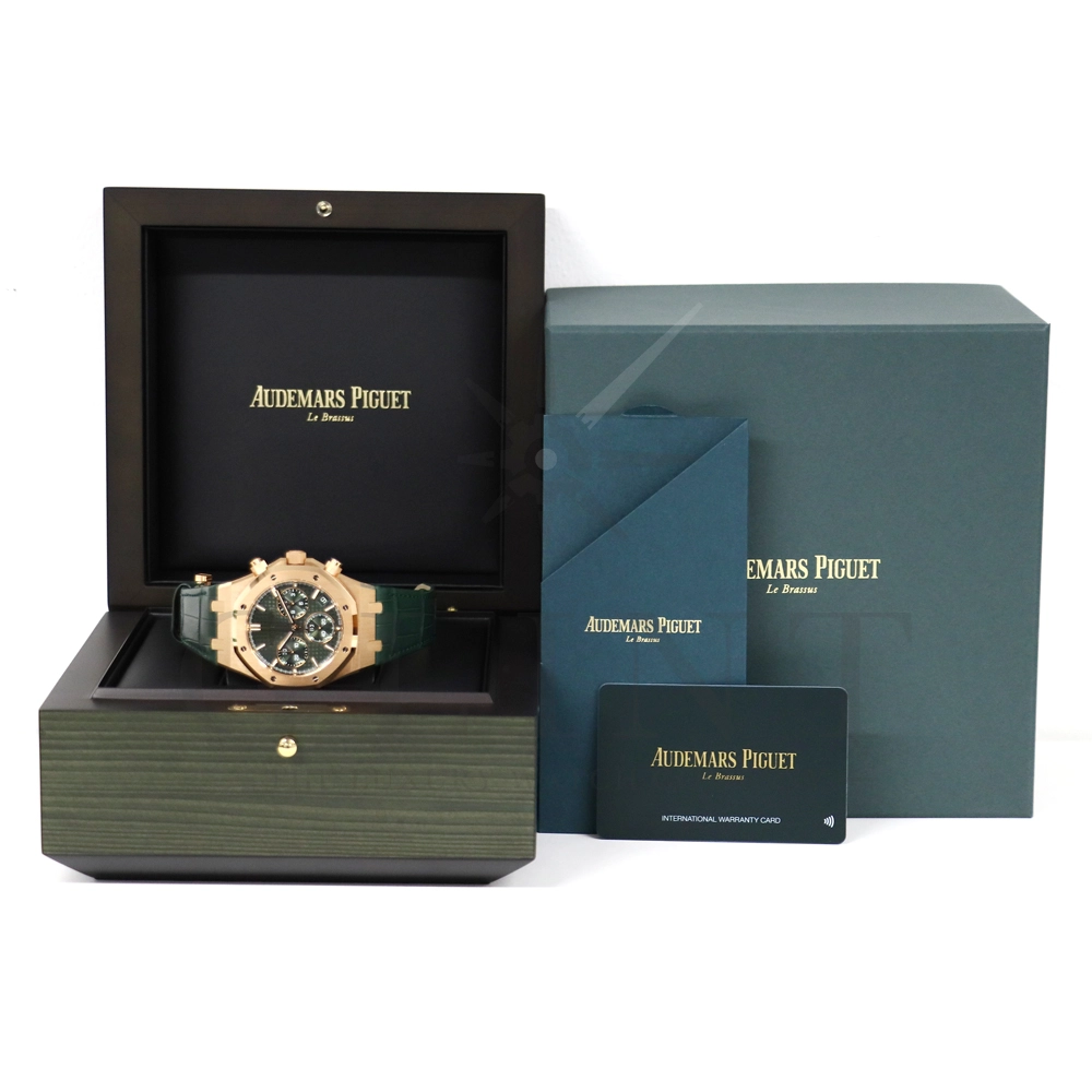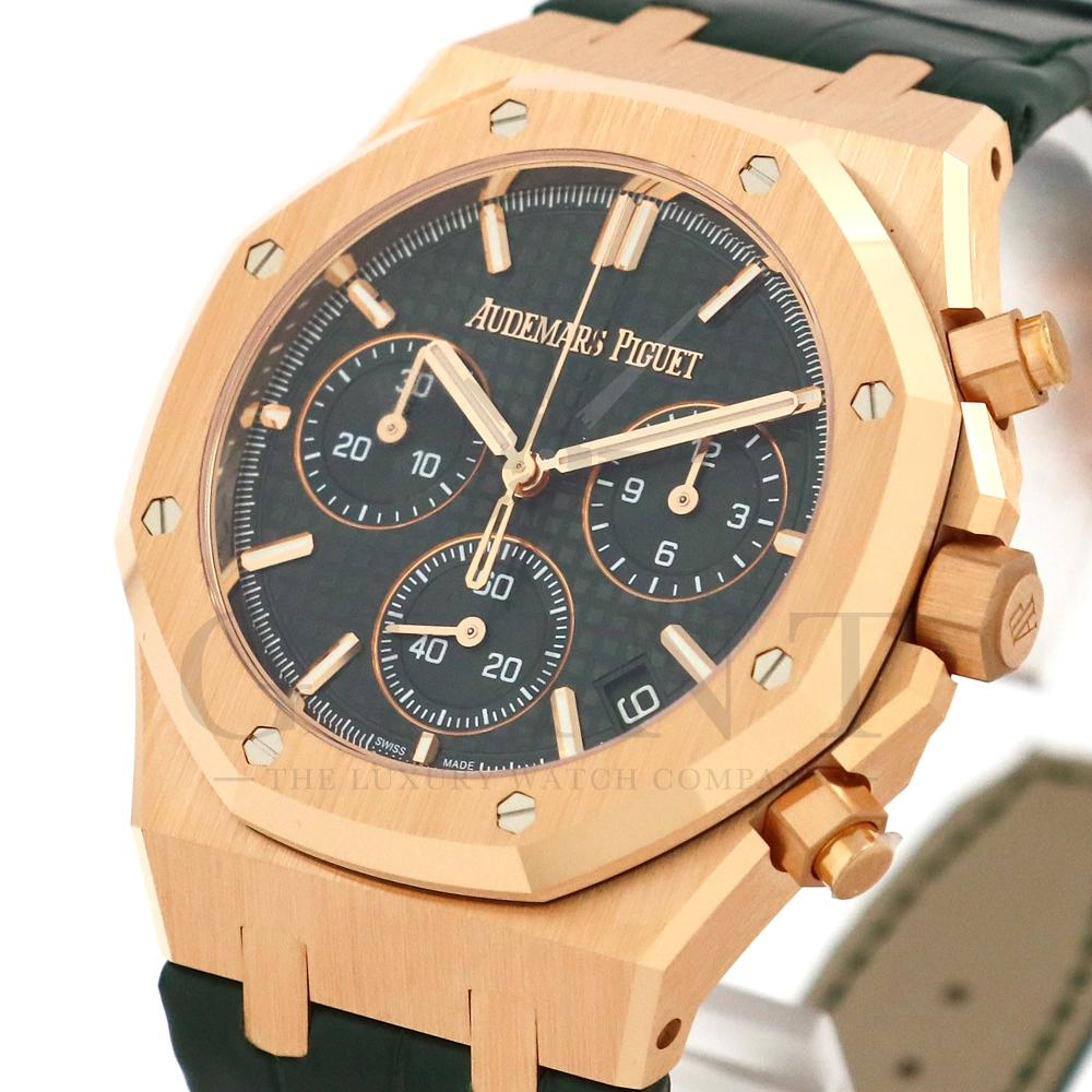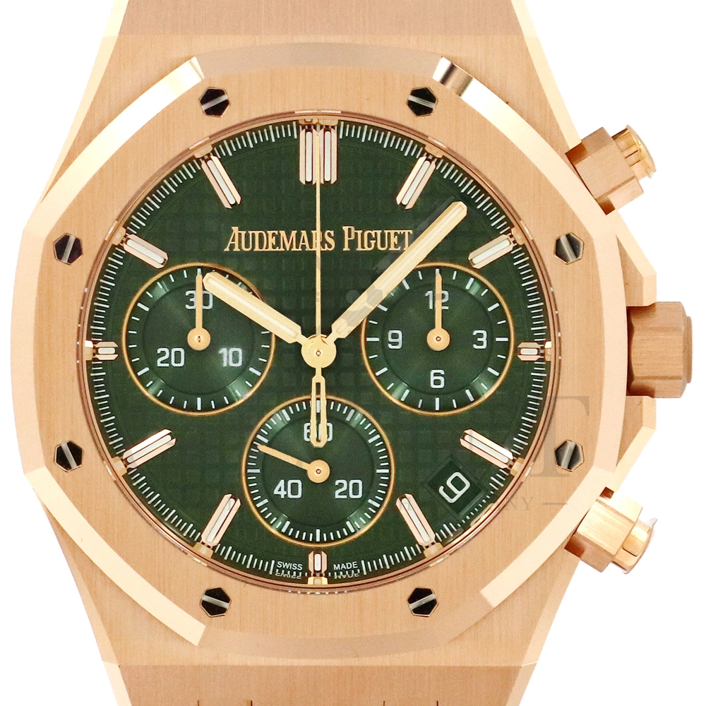 こちらはロイヤルオーク クロノグラフ 26240OR.OO.D404CR.02です。完全自社製Cal.4401を搭載し、70時間のパワーリザーブを実現。測定精度も向上し操作しやすいジャンピングデイトを備え、一体型クロノグラフのフライバック機能、垂直クラッチシステム、ゼロリセットメカニズムを装備しております。18Kピンクゴールドケースの、ダイヤルには美しいグリーンの「グランド・タペストリー」模様を採用し、12時位置の〔AP〕ロゴの廃止。ケースバックのサファイアケースバックからは、AUDEMARS PIGUETのシグネチャーが彫られたロゴやケース色と同色に揃えられた特性のAPのローターをお楽しみいただけます。世界三大時計ブランドが誇る人気のロイヤルオーク・クロノグラフは所有者を格別な気持ちにさせてくれるステータス性が高い極上の一本です。