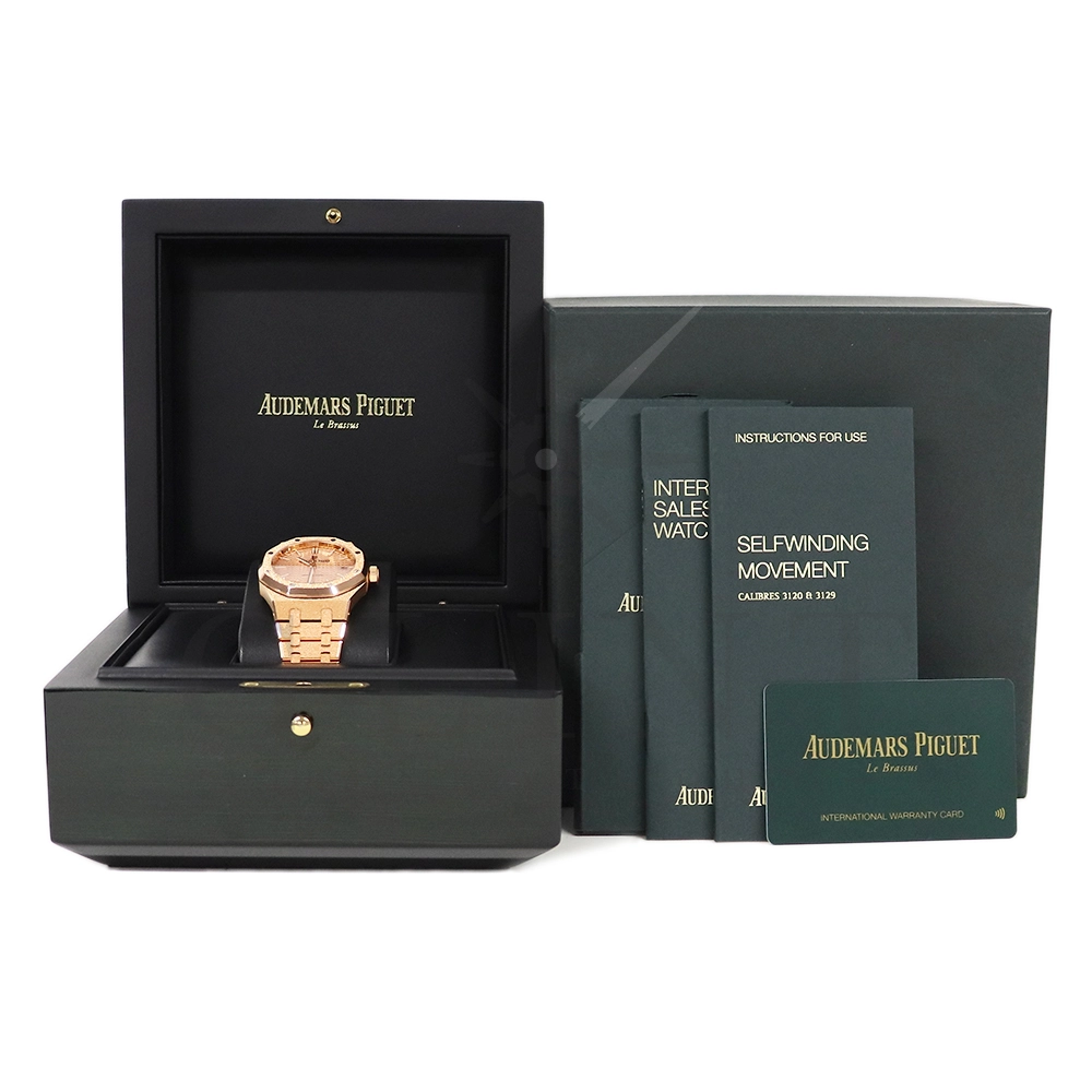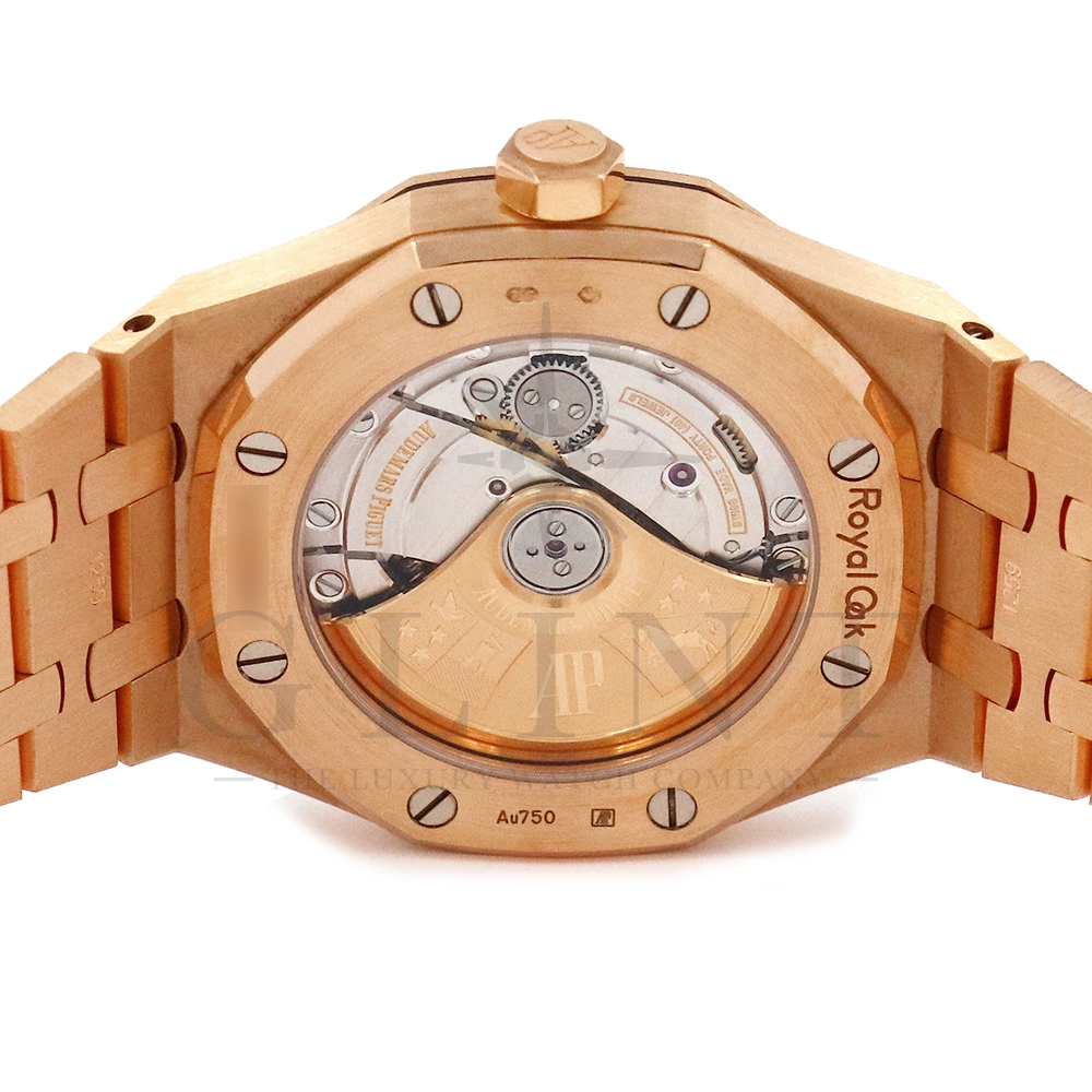 文字盤:「グランド・タペストリー」模様のピンクゴールドカラーのダイヤル、蓄光処理を施したピンクゴールド製のアプライドアワーマーカーとロイヤルオーク針