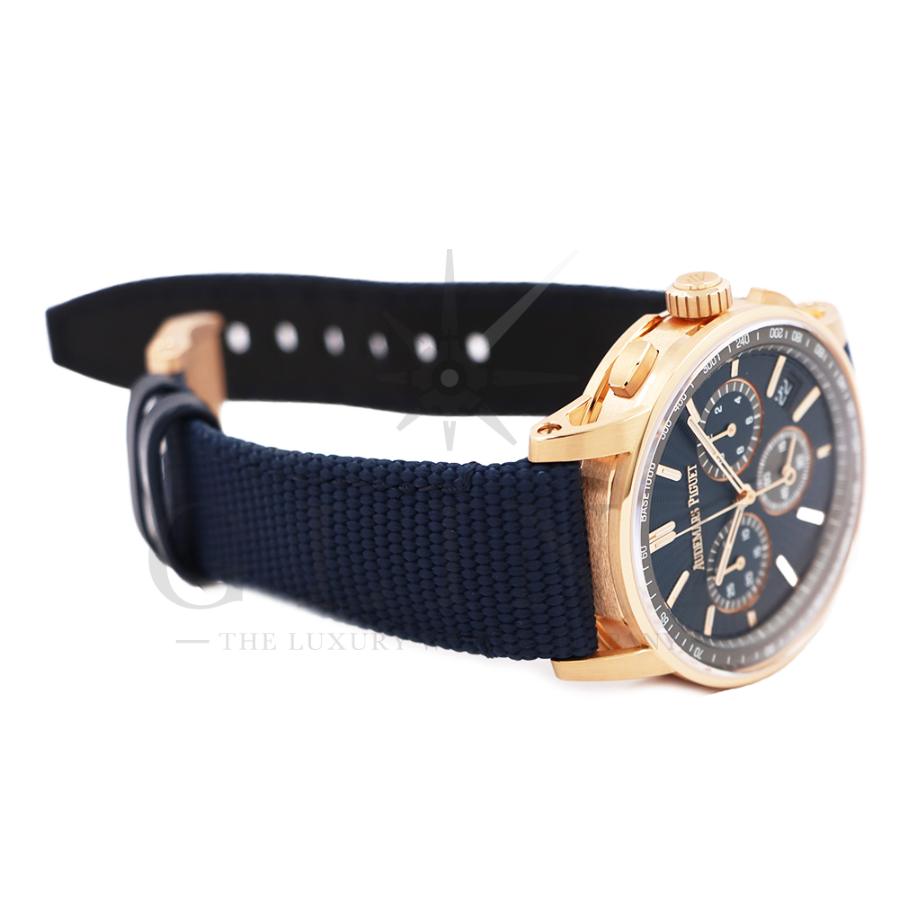 ストラップ:ブルーラバー加工ストラップ、18Kピンクゴールドのピンバックル