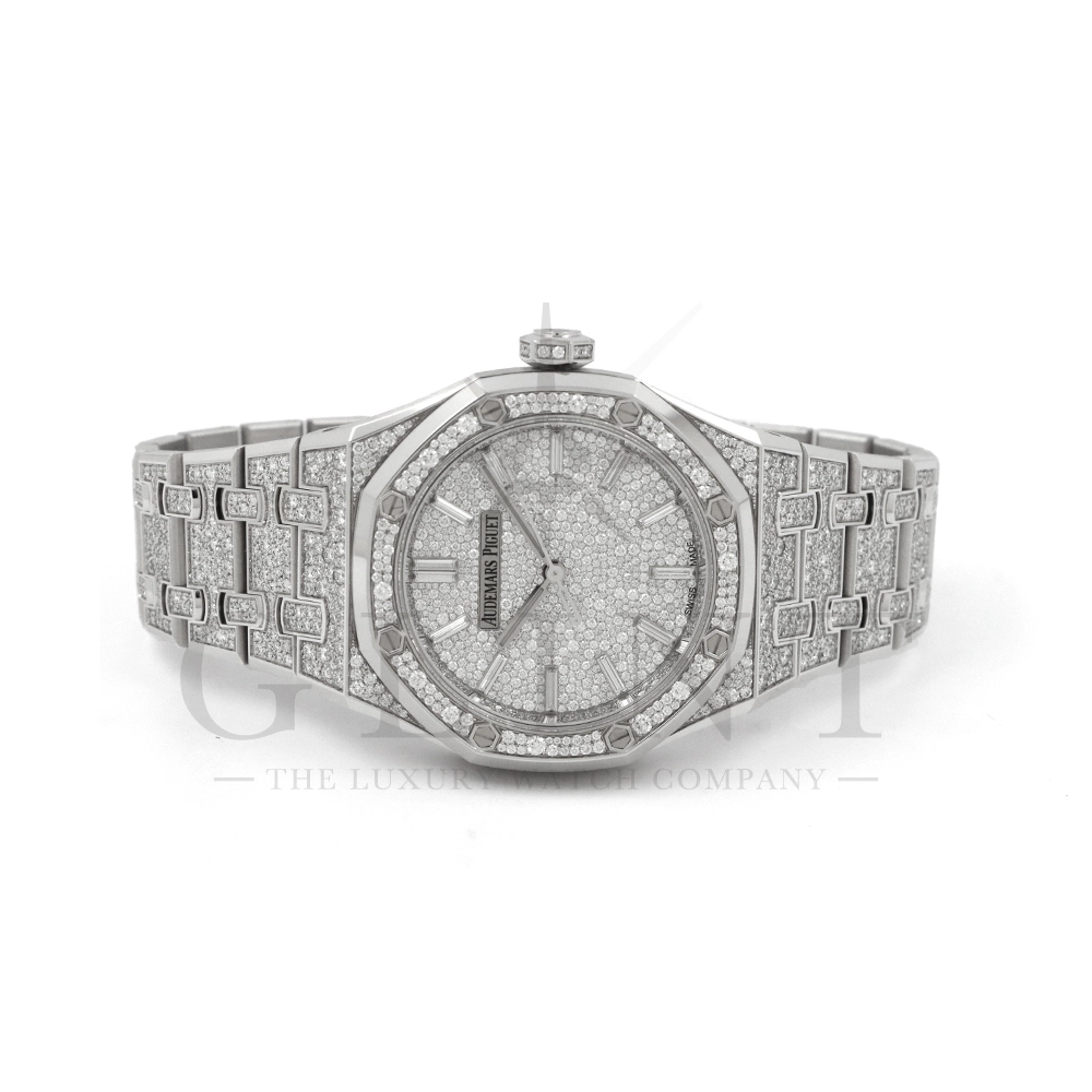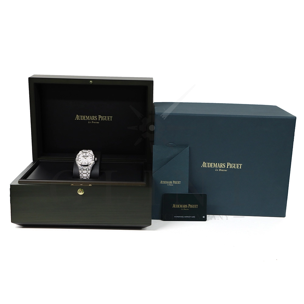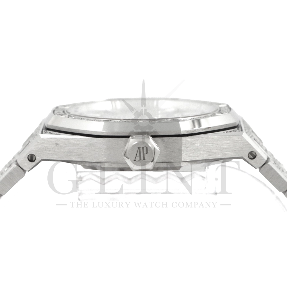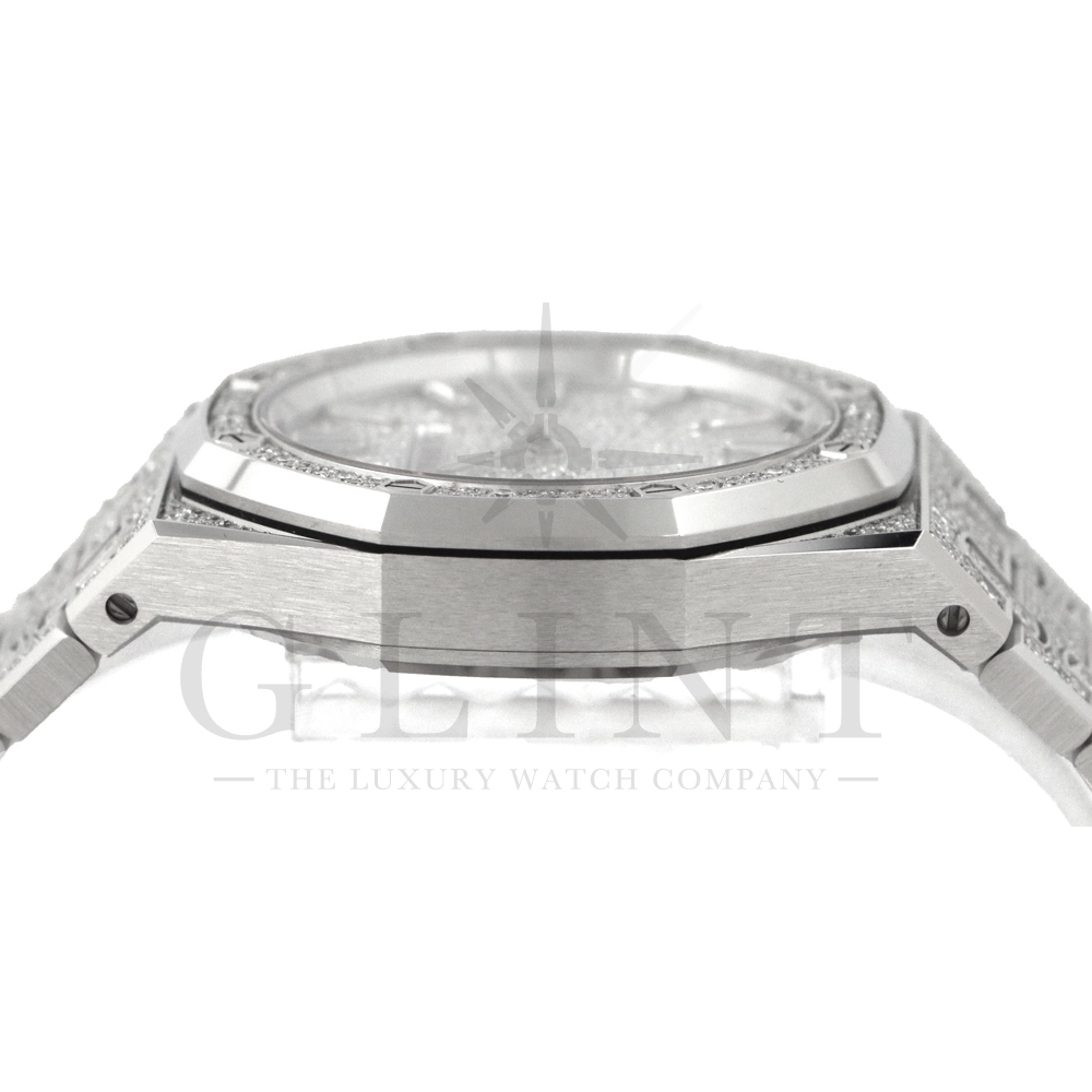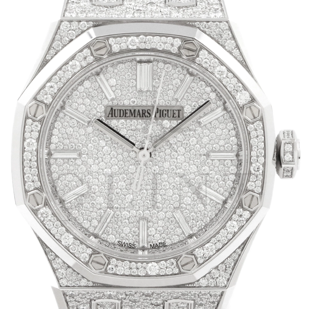 文字盤:18Kホワイトゴールドダイヤルにブリリアントカットダイヤモンドをスノーセット、バゲットカットダイヤモンドのアワーマーカー、蓄光処理を施したホワイトゴールドのロイヤルオーク針