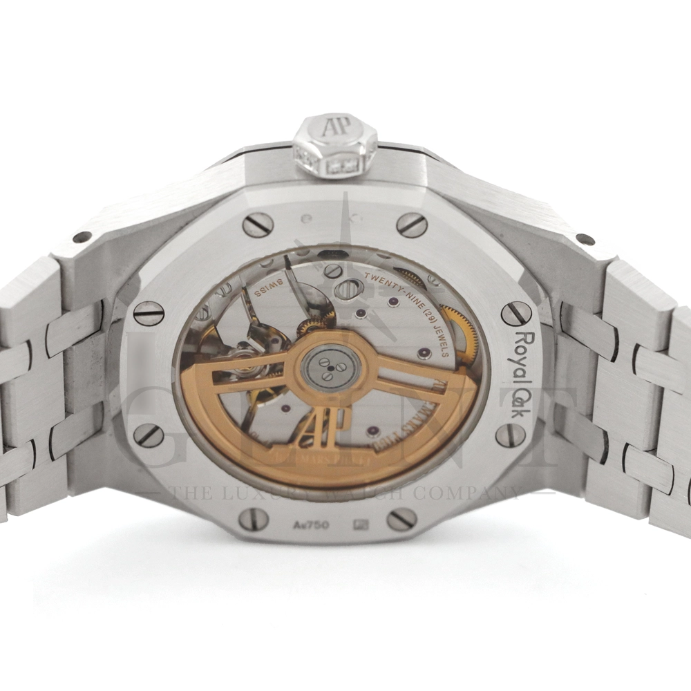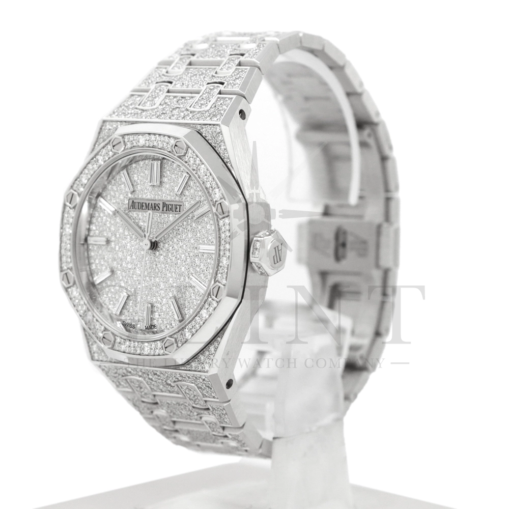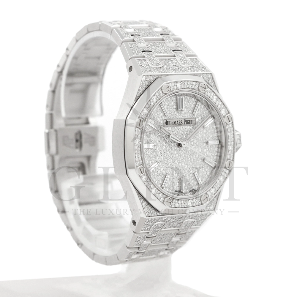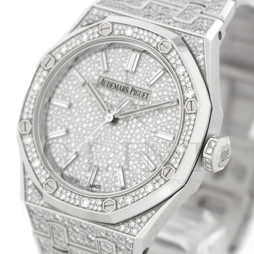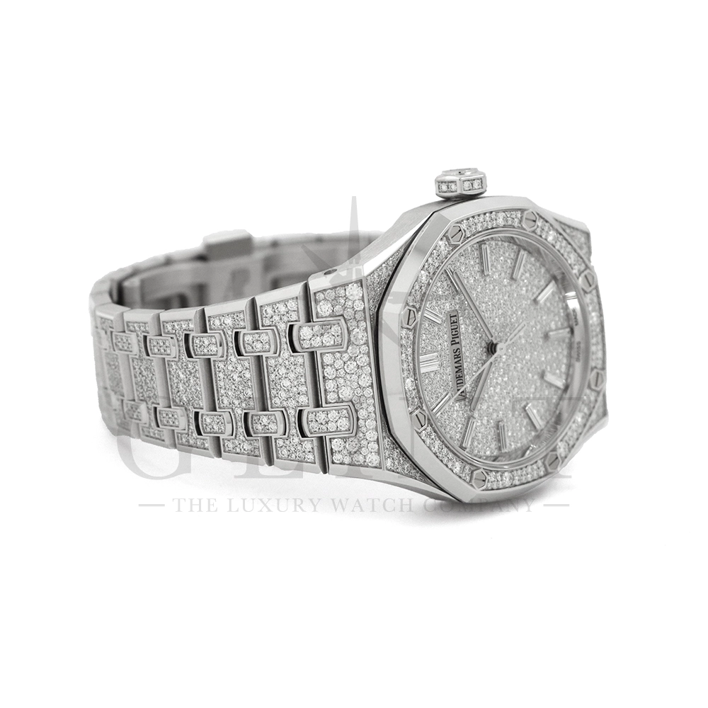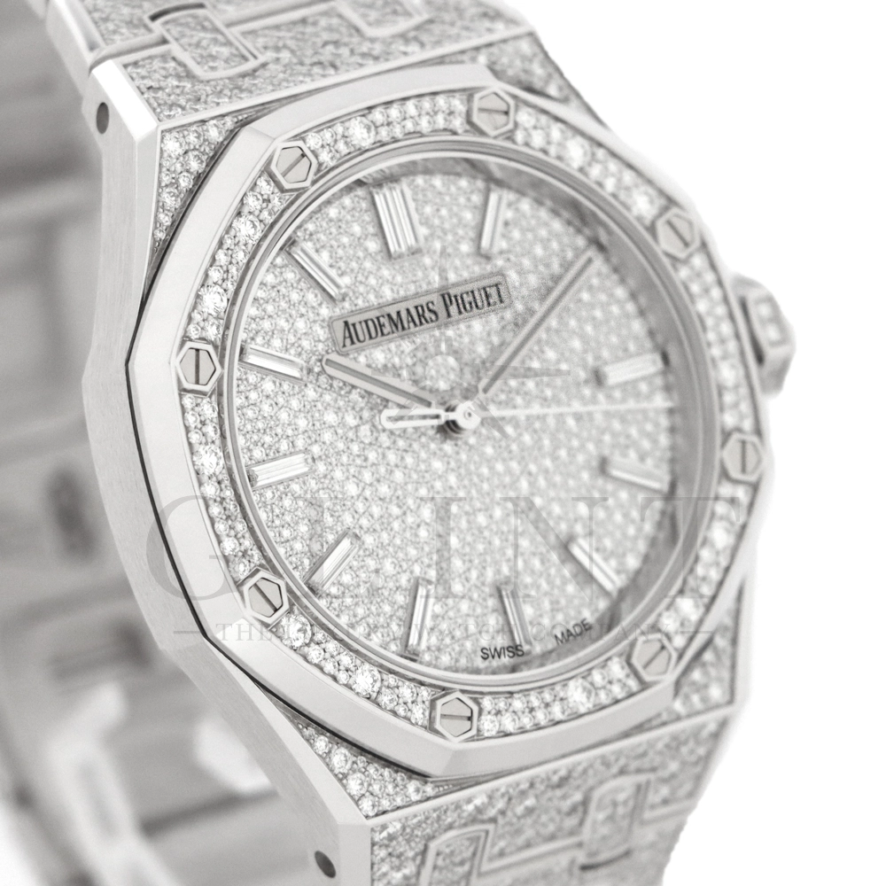 文字盤:18Kホワイトゴールドダイヤルにブリリアントカットダイヤモンドをスノーセット、バゲットカットダイヤモンドのアワーマーカー、蓄光処理を施したホワイトゴールドのロイヤルオーク針