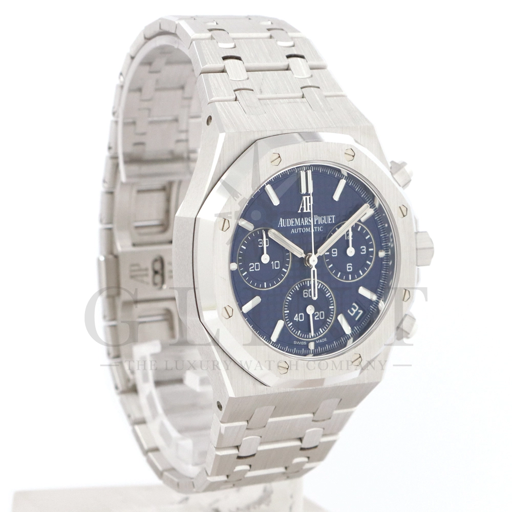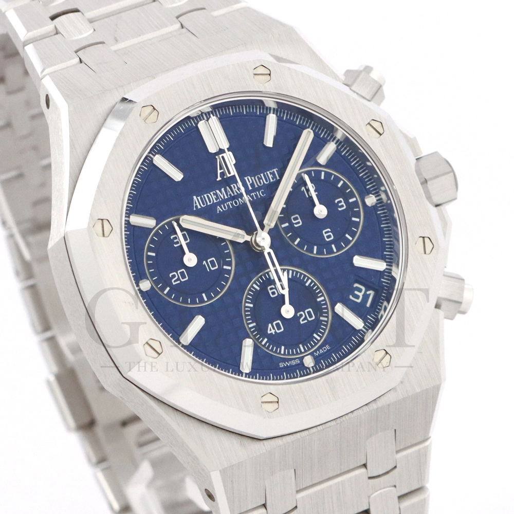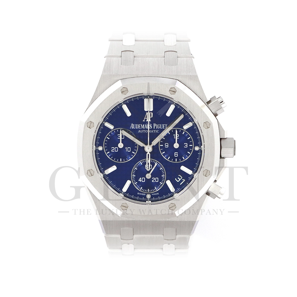 文字盤:「グランド・タペストリー」模様のブルーダイヤル、ロジウムカラーのカウンター、ホワイトゴールド製アプライドアワーマーカーと蓄光処理を施したロイヤルオーク針