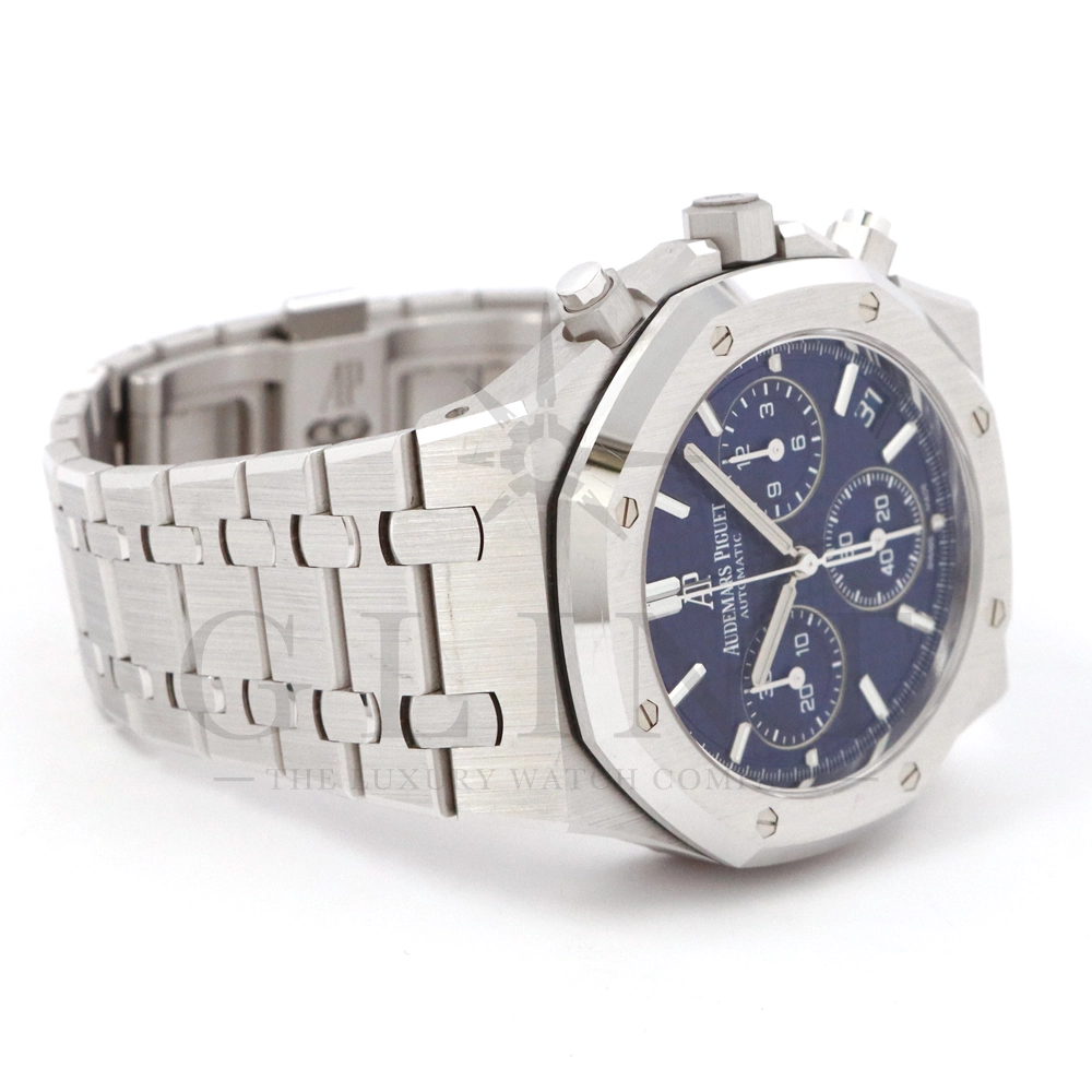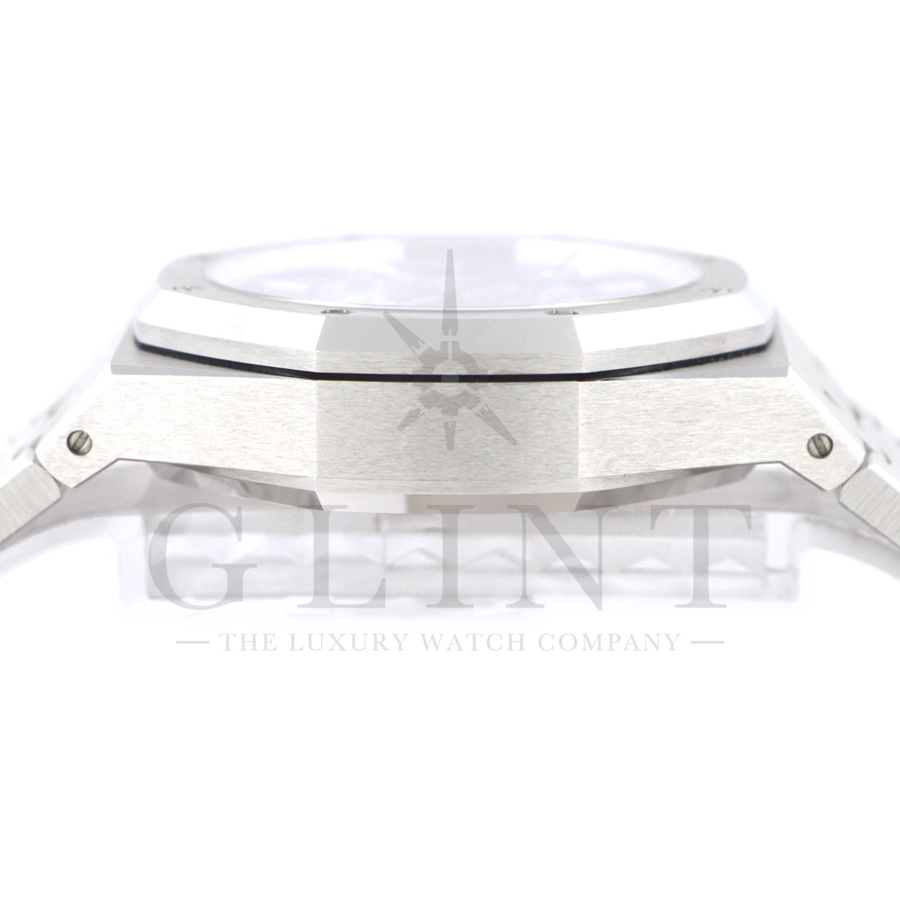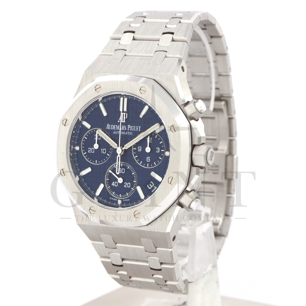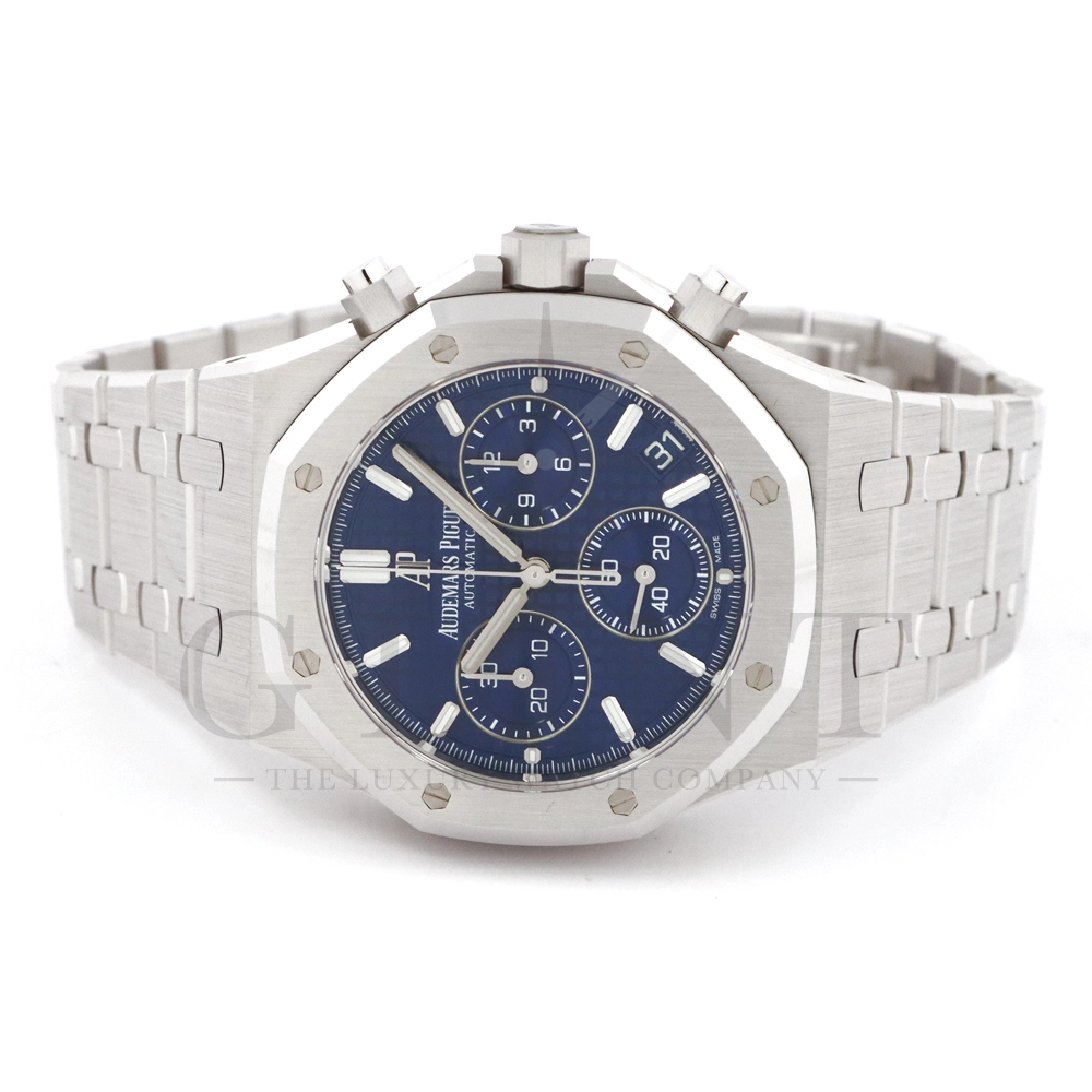 文字盤:「グランド・タペストリー」模様のブルーダイヤル、ロジウムカラーのカウンター、ホワイトゴールド製アプライドアワーマーカーと蓄光処理を施したロイヤルオーク針