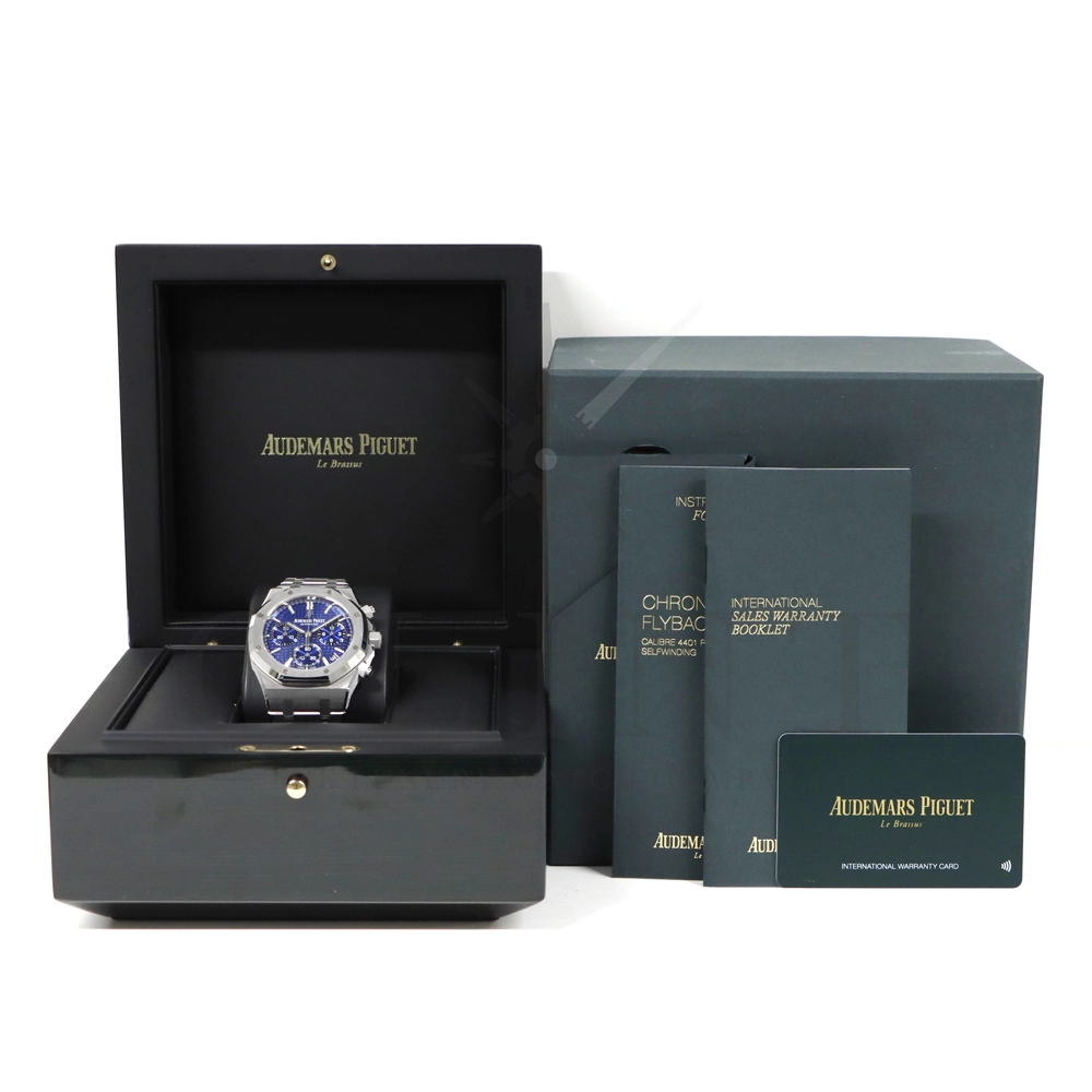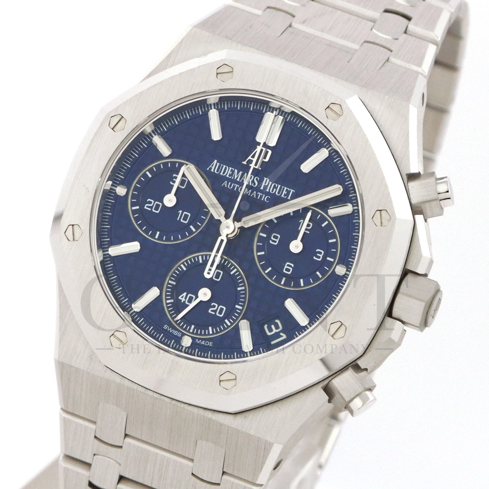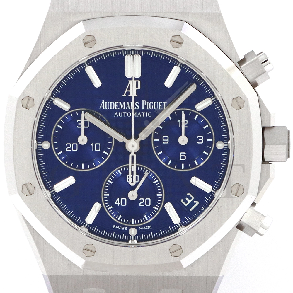 こちらはオーデマピゲ ロイヤルオーク クロノグラフです。2021年よりモデルチェンジを果たしたロイヤルオーククロノグラフ。CODE.11.59でも使用されている最新世代のクロノグラフムーブメントCal.4401を搭載しており、振動数28,800に増え、パワーリザーブも70時間に長くなり、実用性が格段に上がりました。前モデルでは採用されていなかったサファイアクリスタルバックからは、美しいムーブメントの動きを堪能できます。18Kホワイトゴールドを素材にしたこちらのモデルは世界でわずか222本しか生産されておらず、採用されたダイアルは、非常に美しい色合いのブルーカラーでより洗練された高級感を感じさせてくれるでしょう。スポーツラグジュアリーのフラッグシップモデルとしての風格を漂わせる至極の一本です。