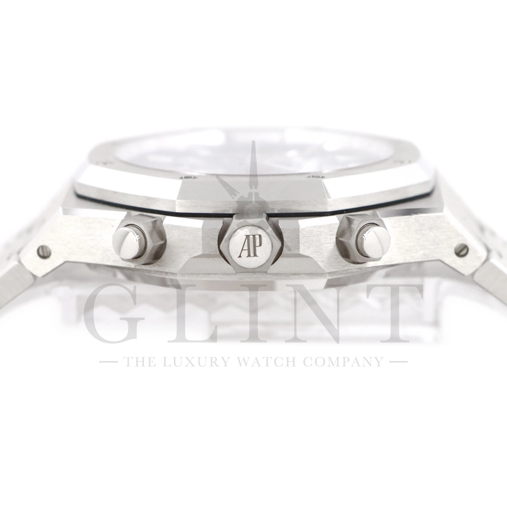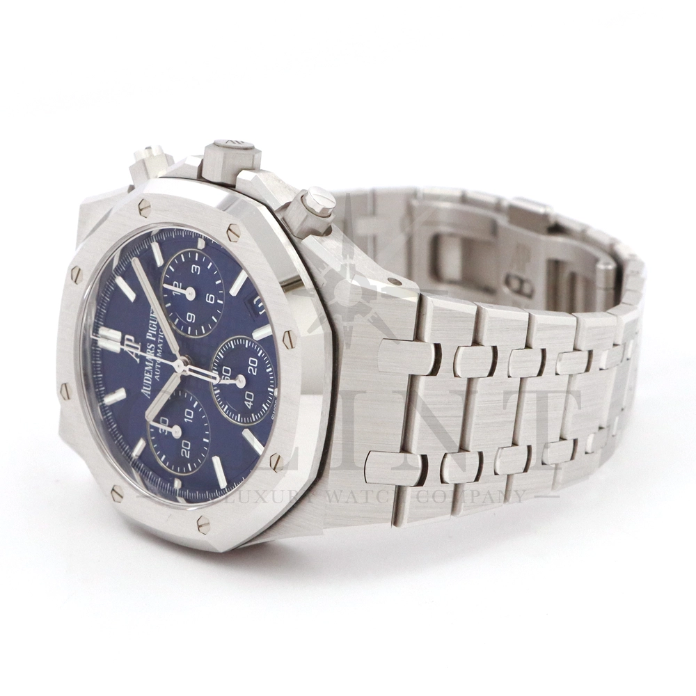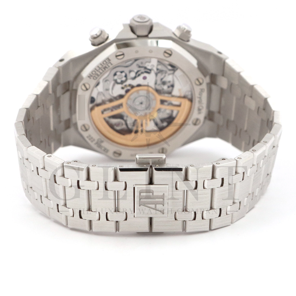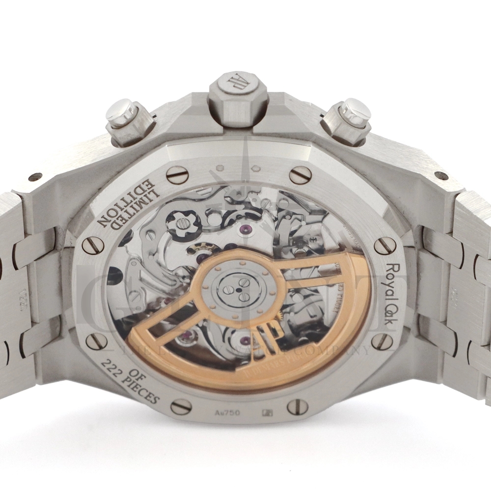 こちらはオーデマピゲ ロイヤルオーク クロノグラフです。2021年よりモデルチェンジを果たしたロイヤルオーククロノグラフ。CODE.11.59でも使用されている最新世代のクロノグラフムーブメントCal.4401を搭載しており、振動数28,800に増え、パワーリザーブも70時間に長くなり、実用性が格段に上がりました。前モデルでは採用されていなかったサファイアクリスタルバックからは、美しいムーブメントの動きを堪能できます。18Kホワイトゴールドを素材にしたこちらのモデルは世界でわずか222本しか生産されておらず、採用されたダイアルは、非常に美しい色合いのブルーカラーでより洗練された高級感を感じさせてくれるでしょう。スポーツラグジュアリーのフラッグシップモデルとしての風格を漂わせる至極の一本です。