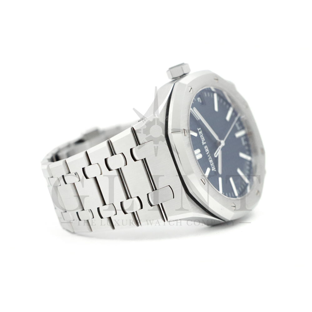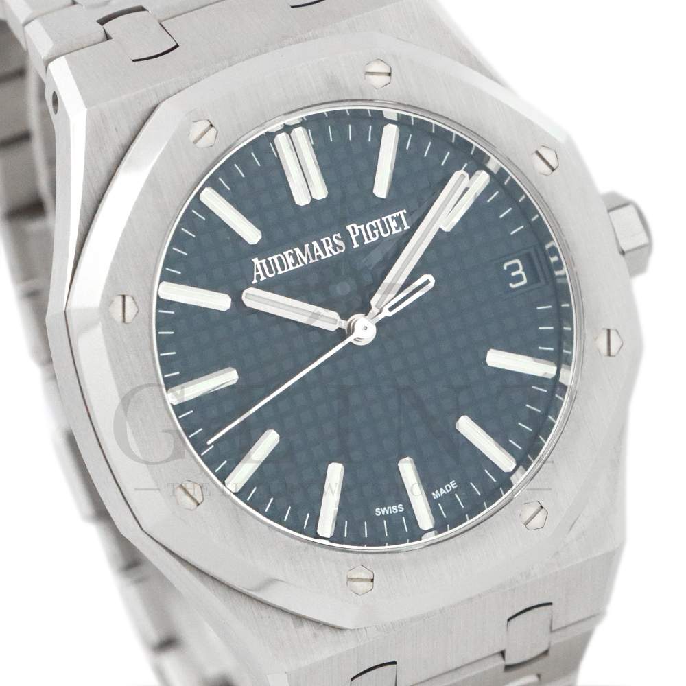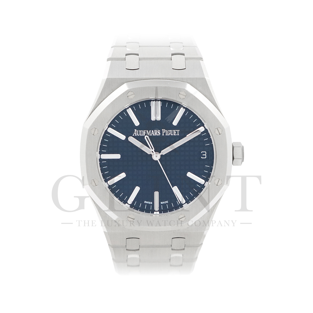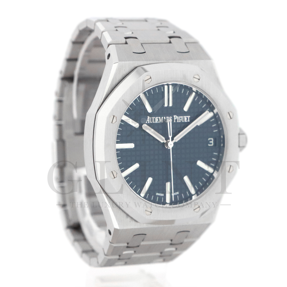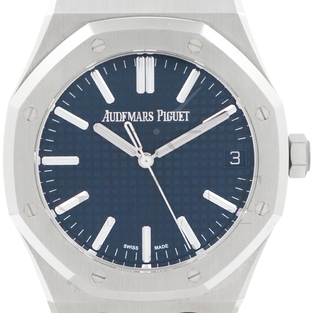 文字盤:「グランドタペストリー」模様の「ナイトブルー、クラウド50」ダイヤル、蓄光処理を施したホワイトゴールドのアプライドアワーマーカーとロイヤルオーク針