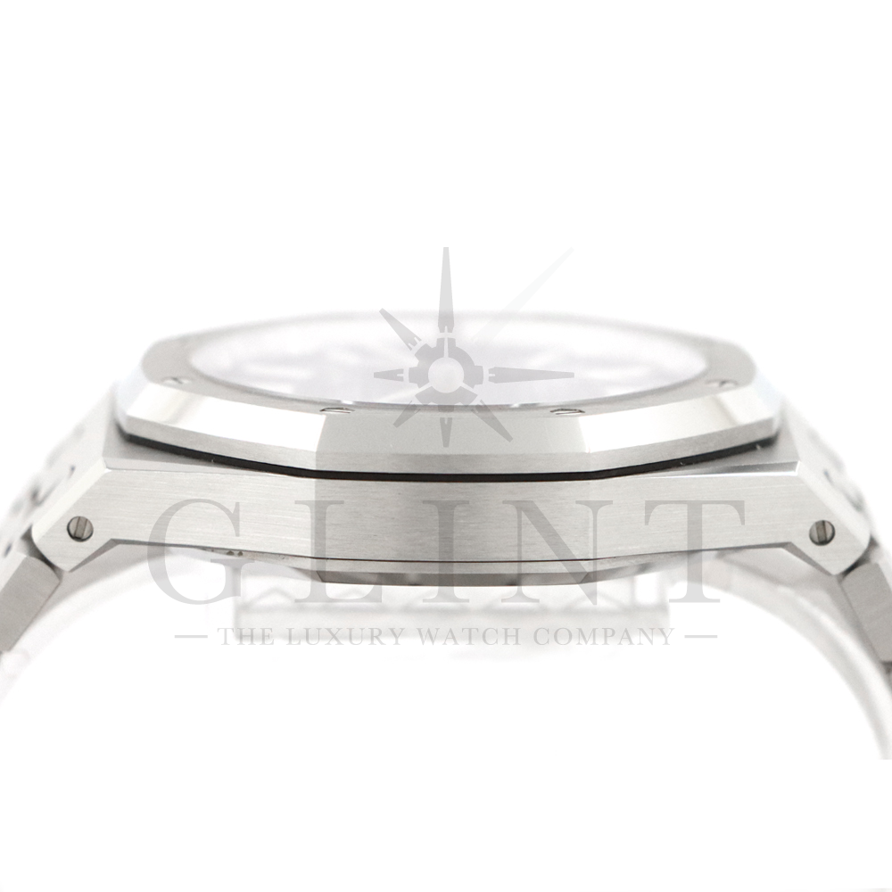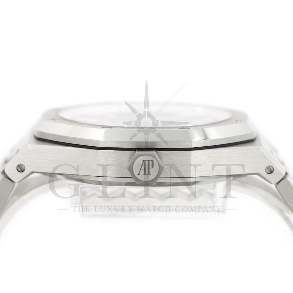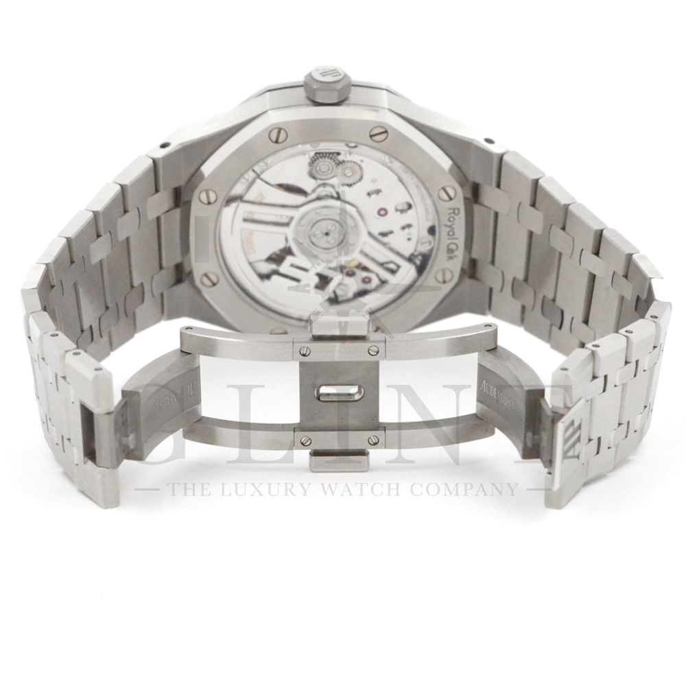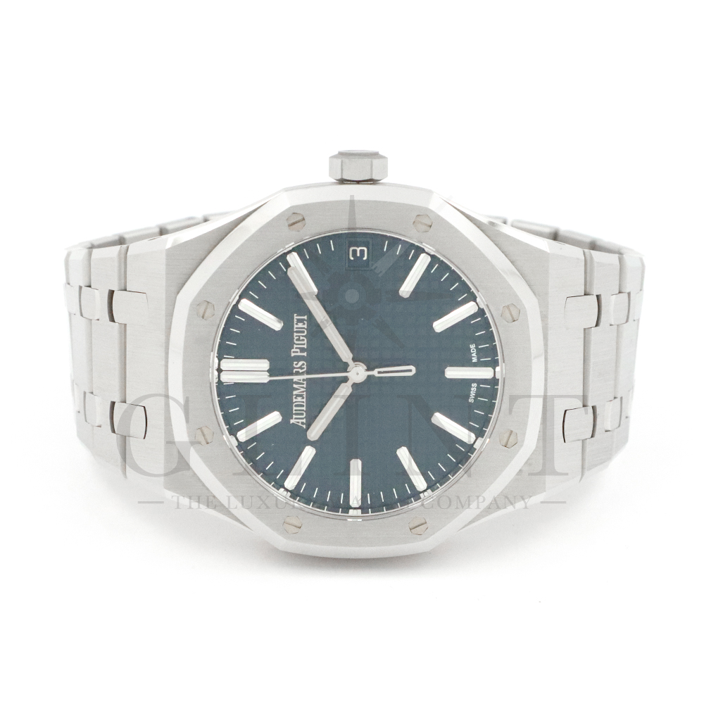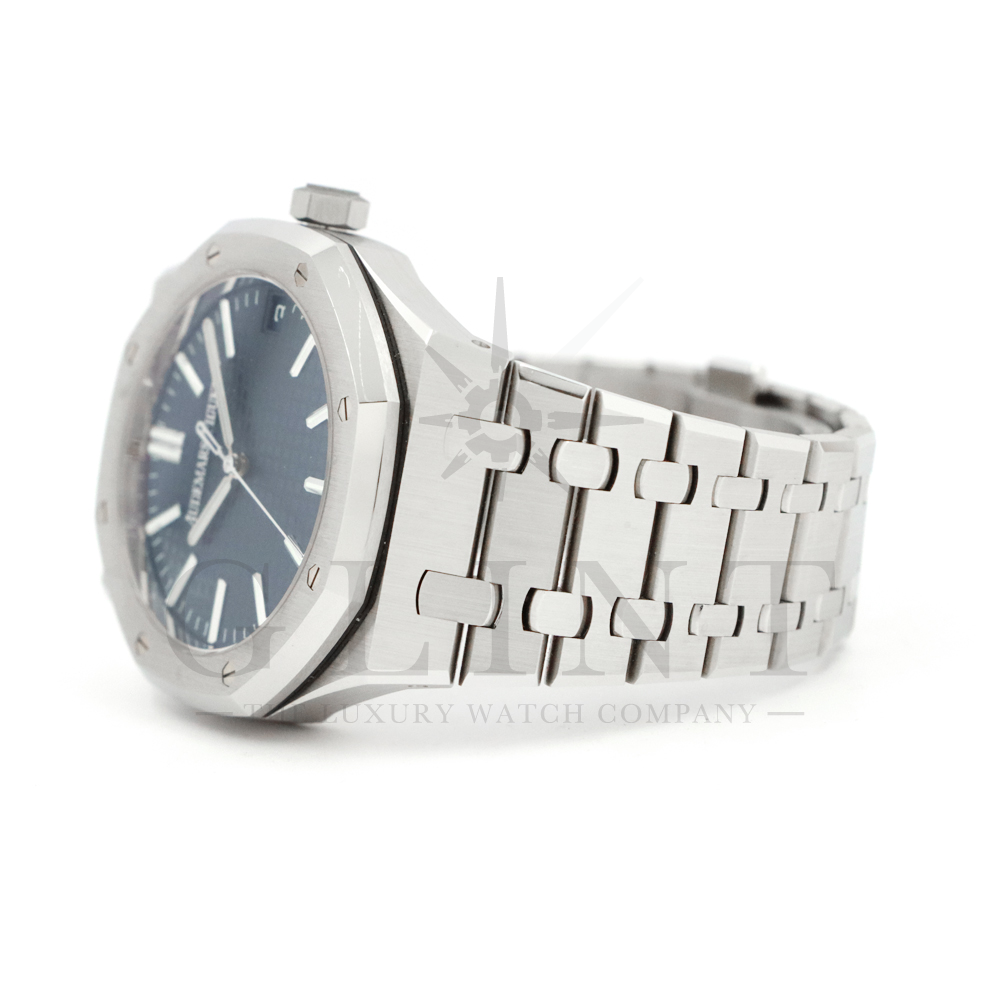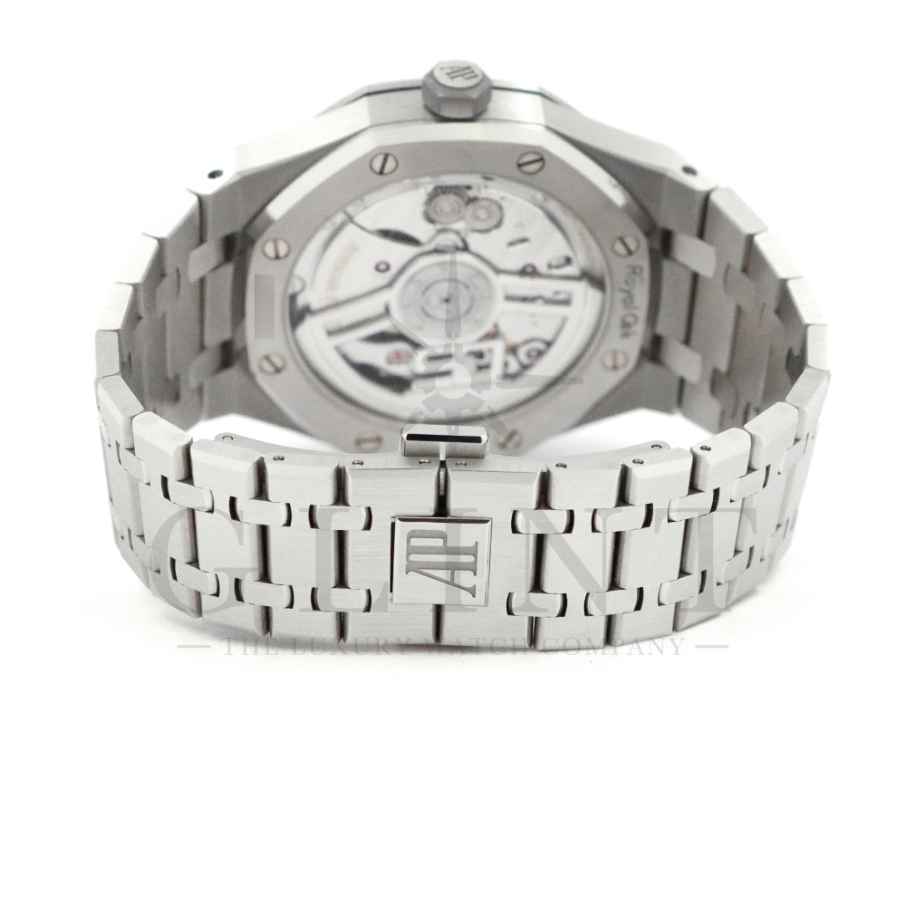 文字盤:「グランドタペストリー」模様の「ナイトブルー、クラウド50」ダイヤル、蓄光処理を施したホワイトゴールドのアプライドアワーマーカーとロイヤルオーク針