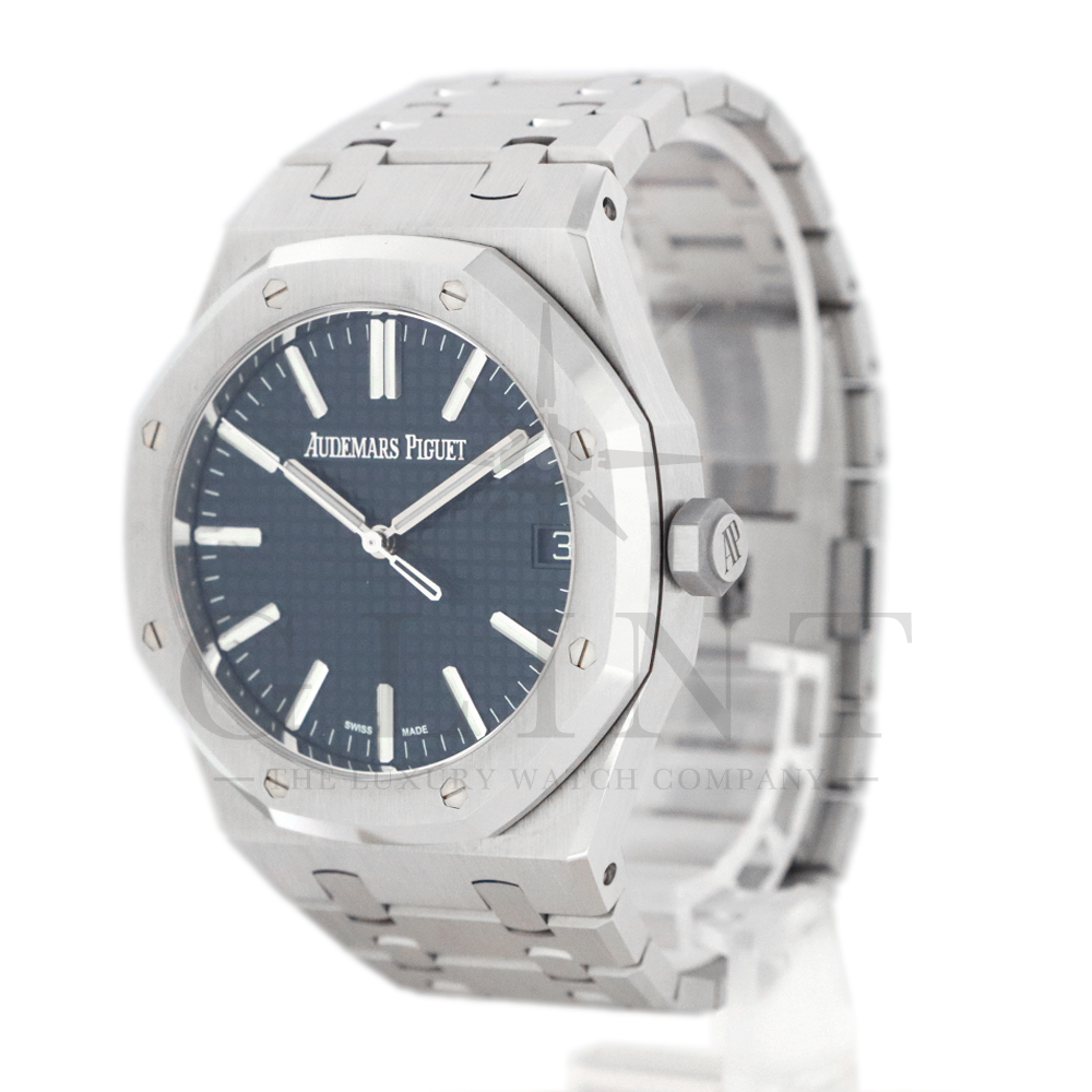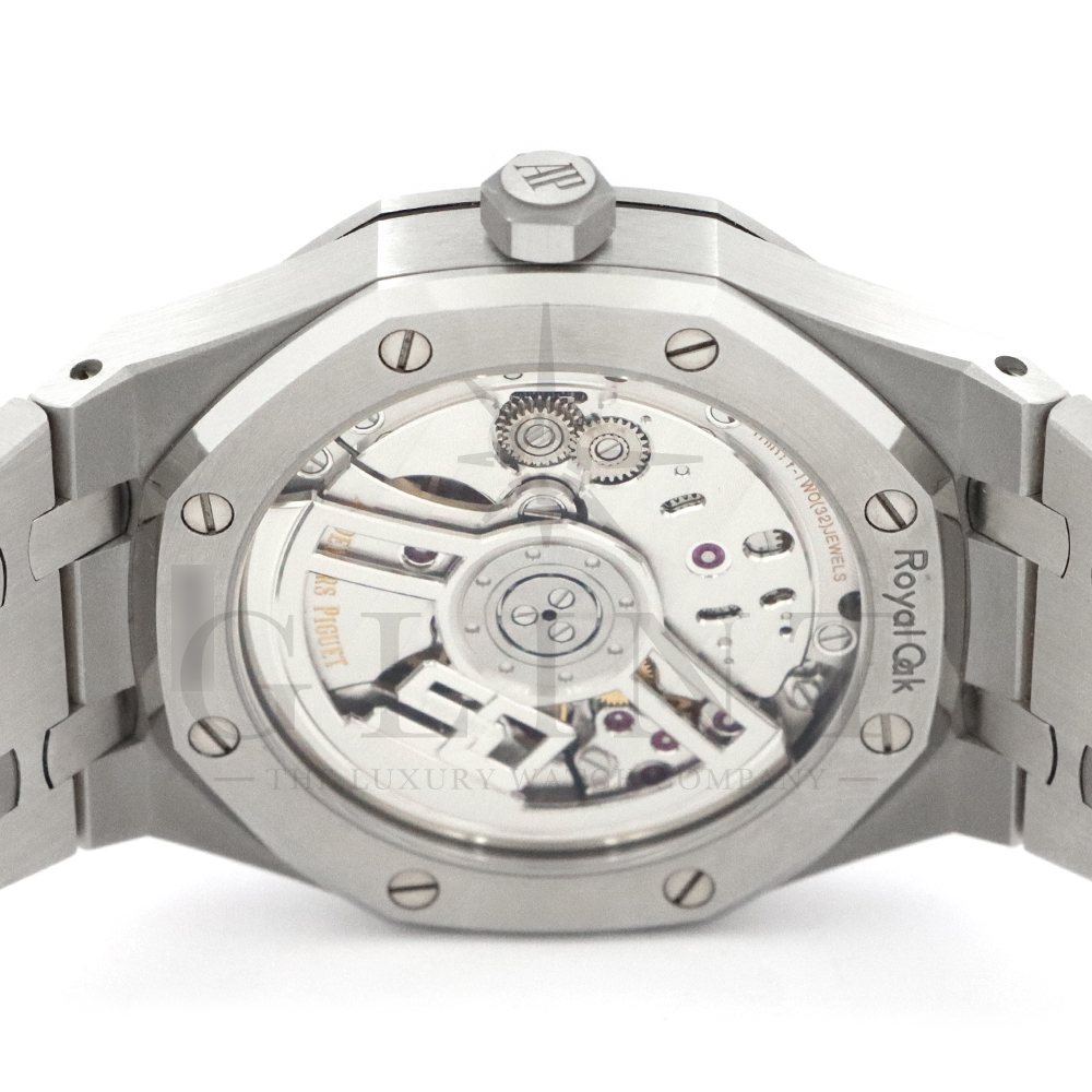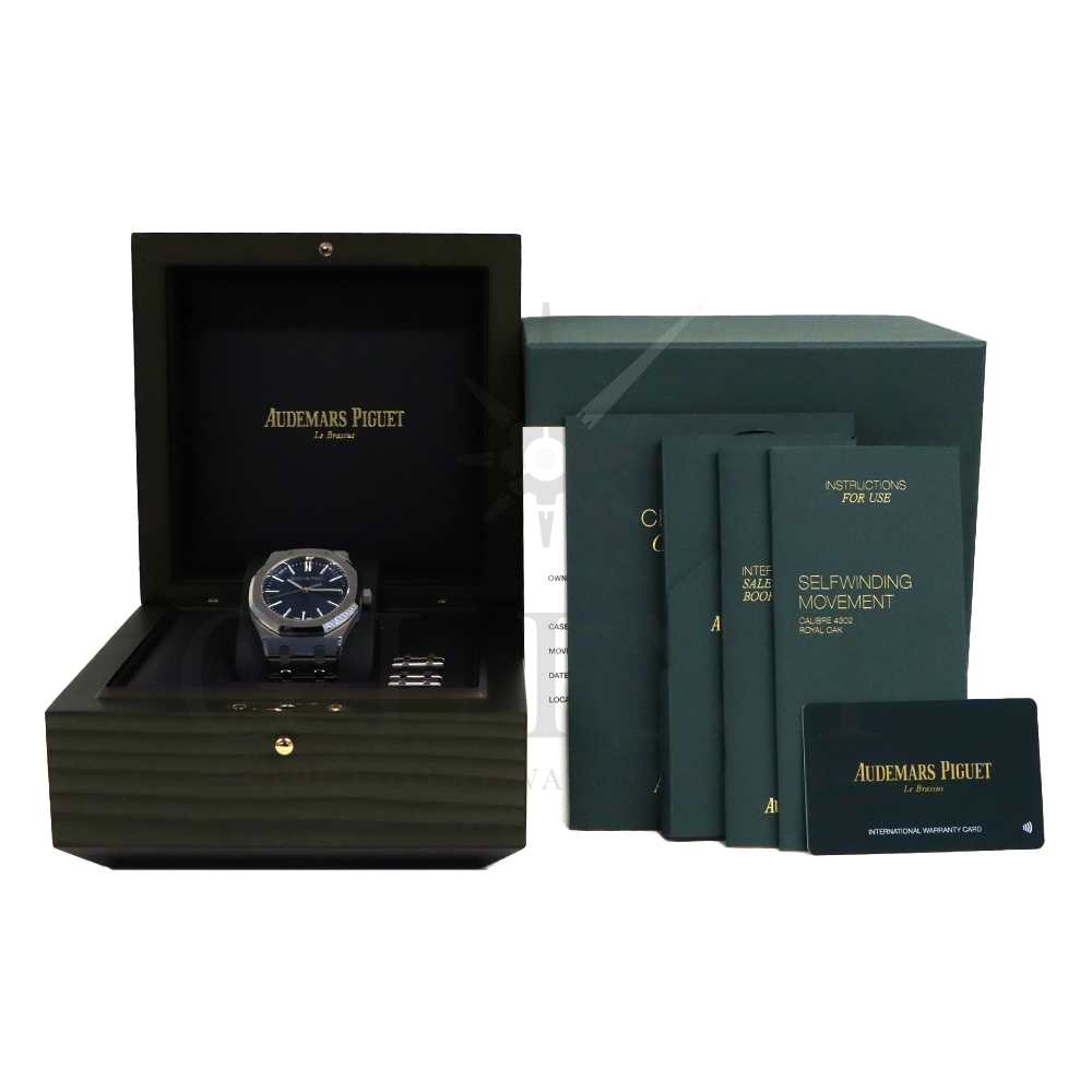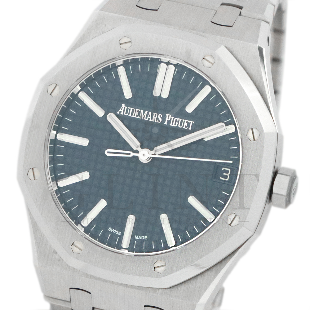 こちらはオーデマピゲ ロイヤルオーク オートマティックです。2022年ロイヤルオーク50周年記念として発表された新作モデル。ムーブメントは自社製キャリバー4302を搭載。ケースバックのサファイアケースバックからは、AUDEMARS PIGUETのシグネチャーが彫られたロゴやケース色と同色に揃えられた特性の50周年のローターをお楽しみいただけます。絶大な人気を誇るナイトブルーダイアルは鮮やかな印象で美しく、他のダイヤルカラーでは味わうことのできない存在感を放ちます。洗練されたデザインで飽きの来ない完成された一本です。