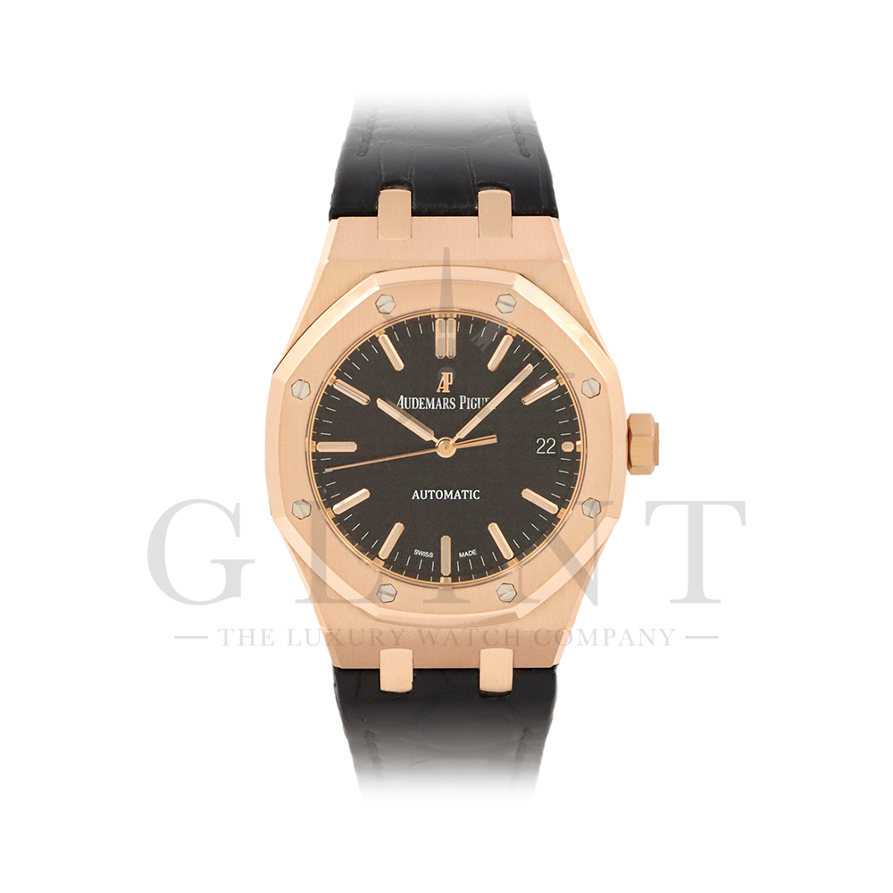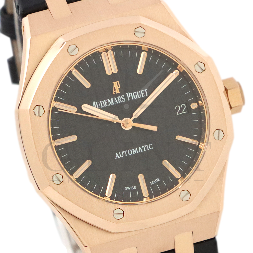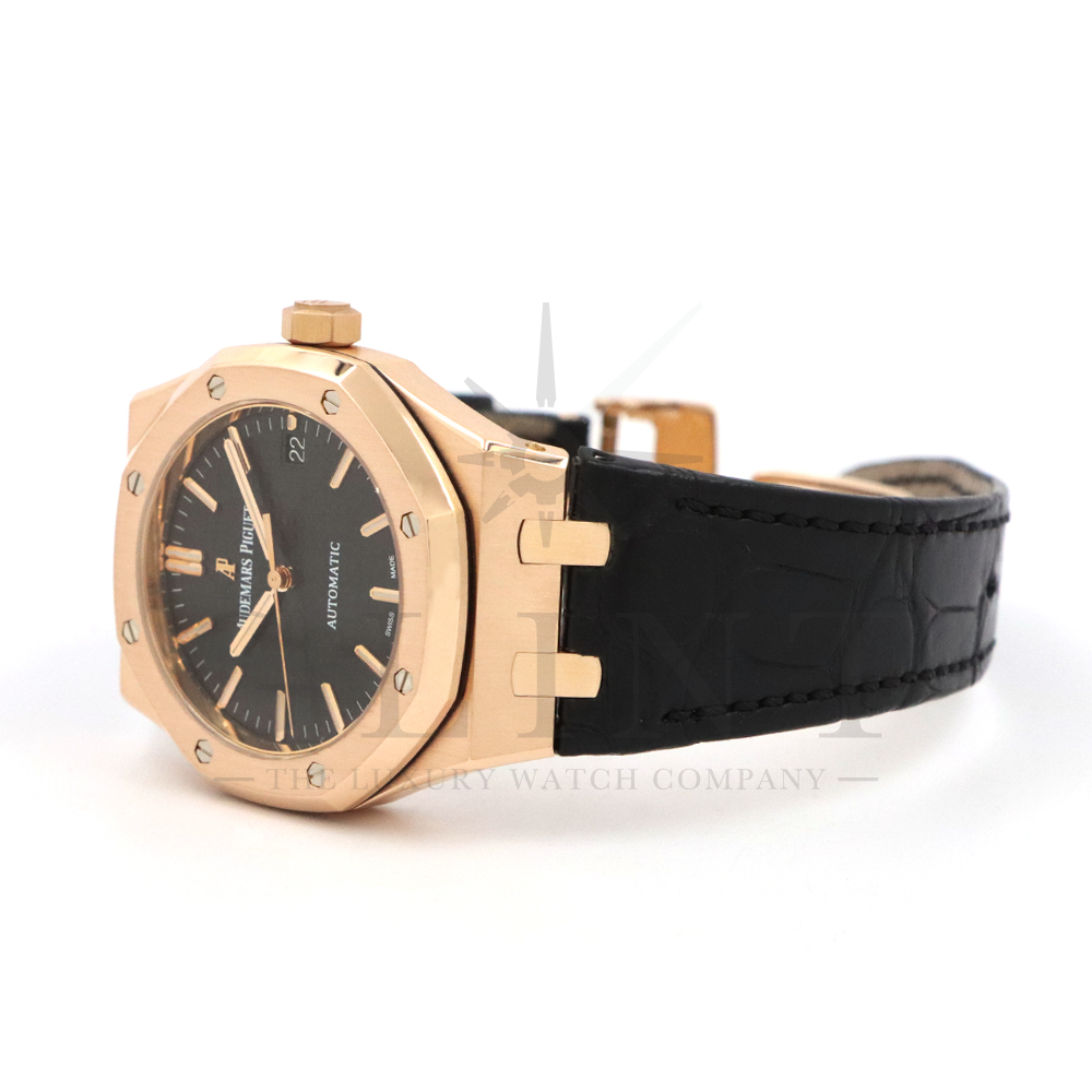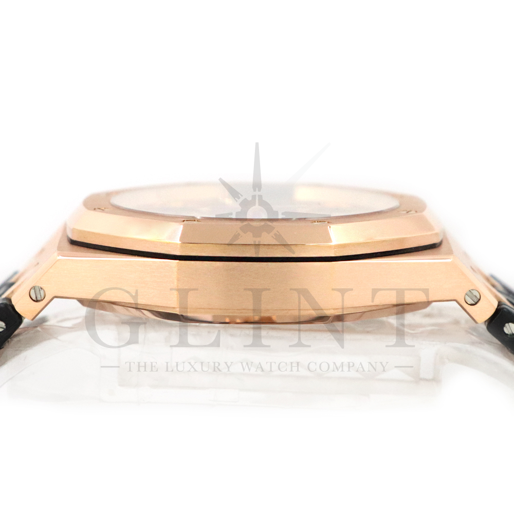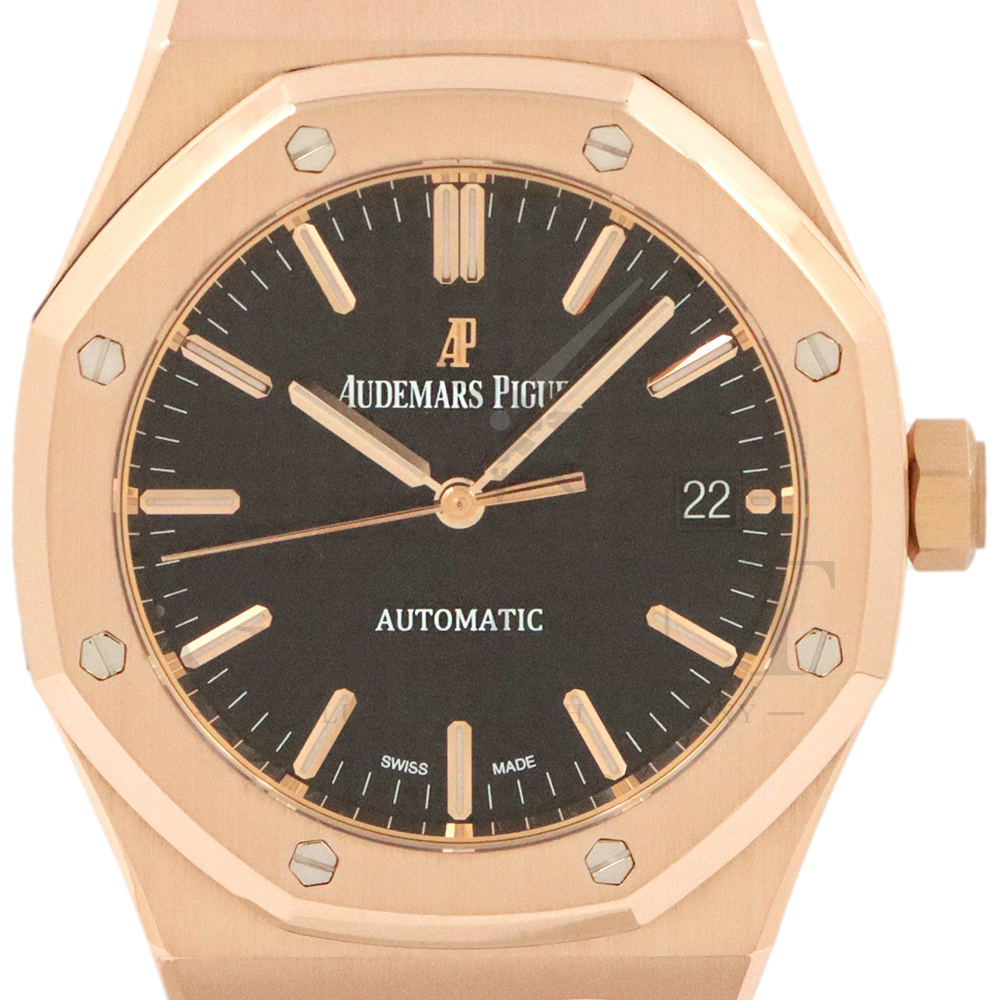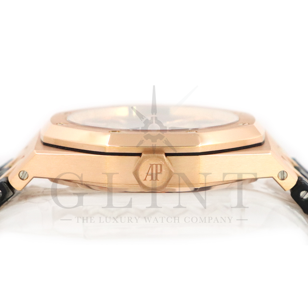 こちらはロイヤルオーク オートマティックです。ケースサイズが37mmと男性でも女性でもお楽しみいただけるユニセックスモデル。小ぶりながらも、視認性は高く、文字盤にはロイヤルオークの代名詞でもあるグランド・タペストリーが施されています。光加減によって見え方が変化し、ロイヤルオーク特有の雰囲気を堪能する事ができるでしょう。またシースルーバックから眺める事ができる自社製自動巻キャリバー3120は、21,600振動のロービートを刻み、パワーリザーブは60時間と十分な実用性を誇ります。シースルーバックからはオーデマピゲのロゴと創業者の紋章が彫られた22金製のローターが輝き、ムーブメントの美しい仕上げをご堪能いただけます。18Kピンクゴールドにレザーベルトを組み合わせた大変エレガントなモデルで大人の雰囲気を演出してくれる事は間違いありません。洗練されたデザインで飽きの来ない完成された一本です。