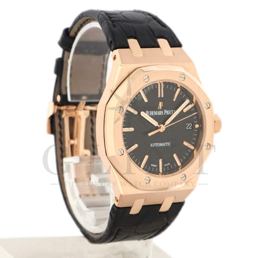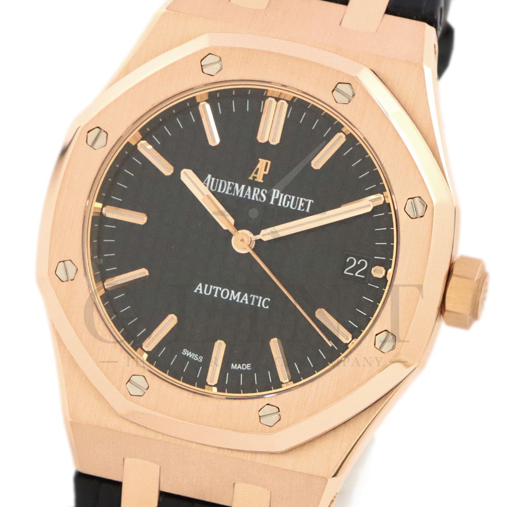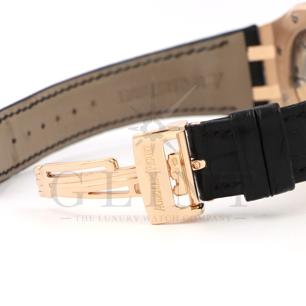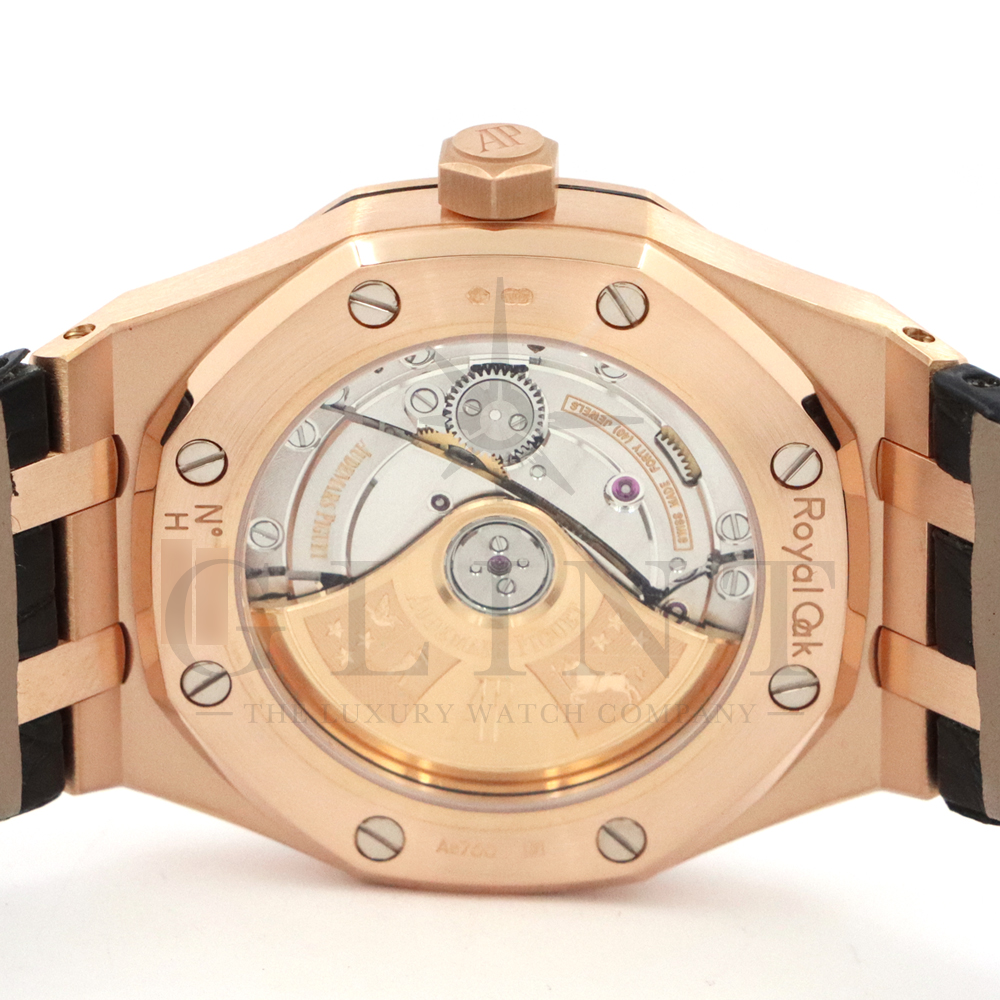 文字盤:「グランド・タペストリー」パターンのブラックダイヤル、ピンクゴールドのアプライドアワーマーカーとロイヤルオーク針、ルミネサント加工
