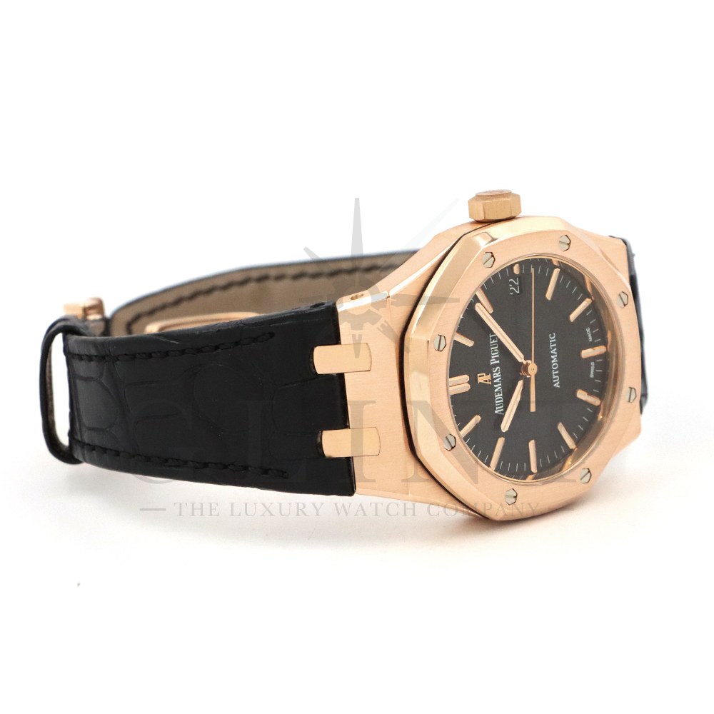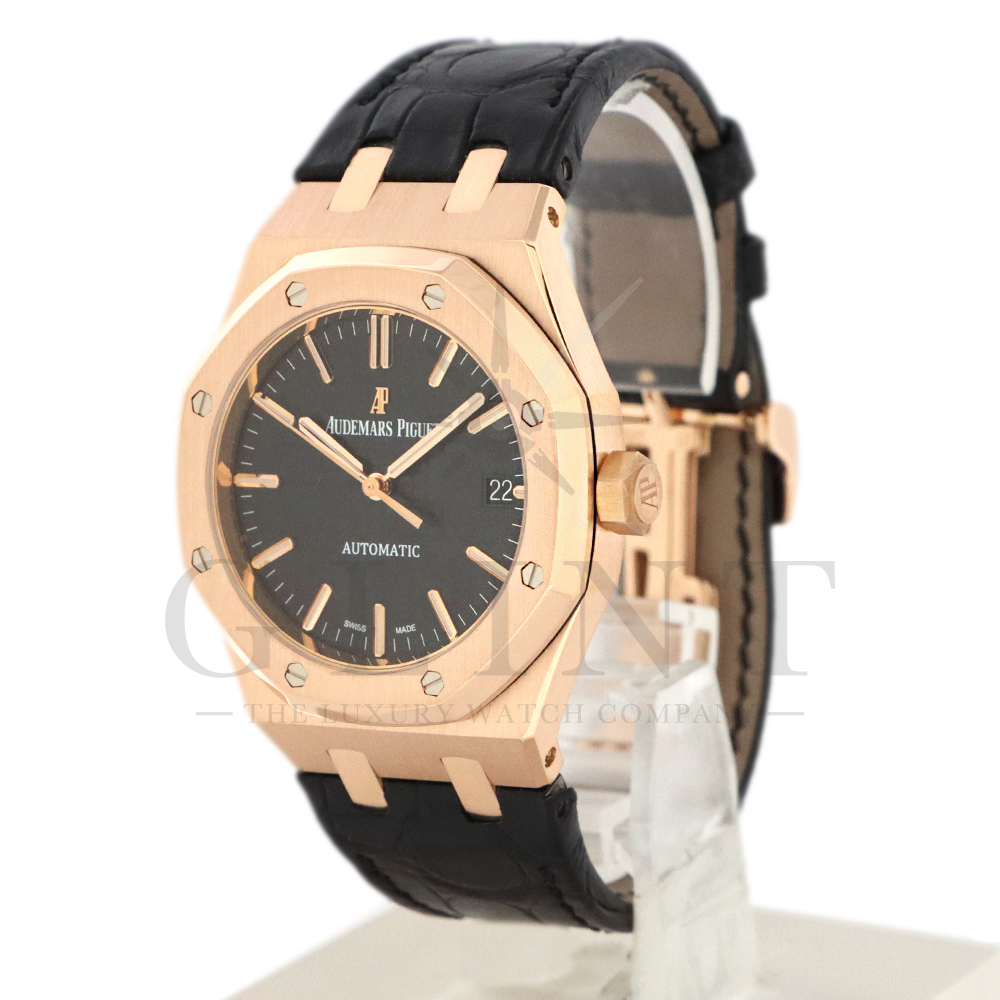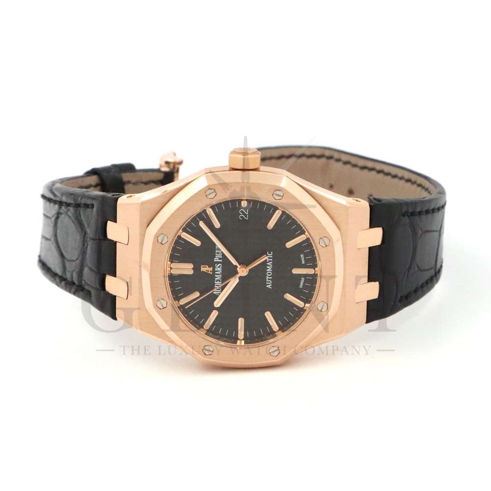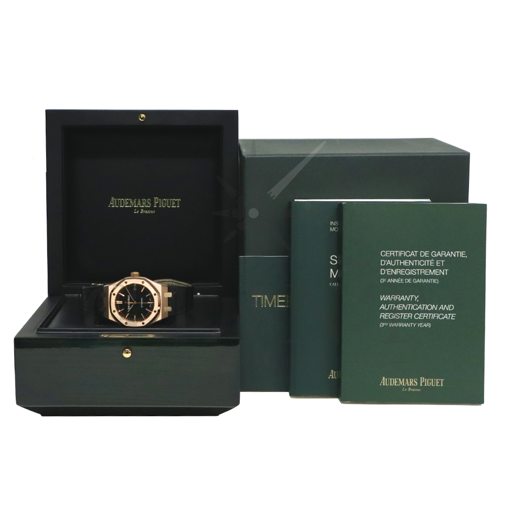 文字盤:「グランド・タペストリー」パターンのブラックダイヤル、ピンクゴールドのアプライドアワーマーカーとロイヤルオーク針、ルミネサント加工