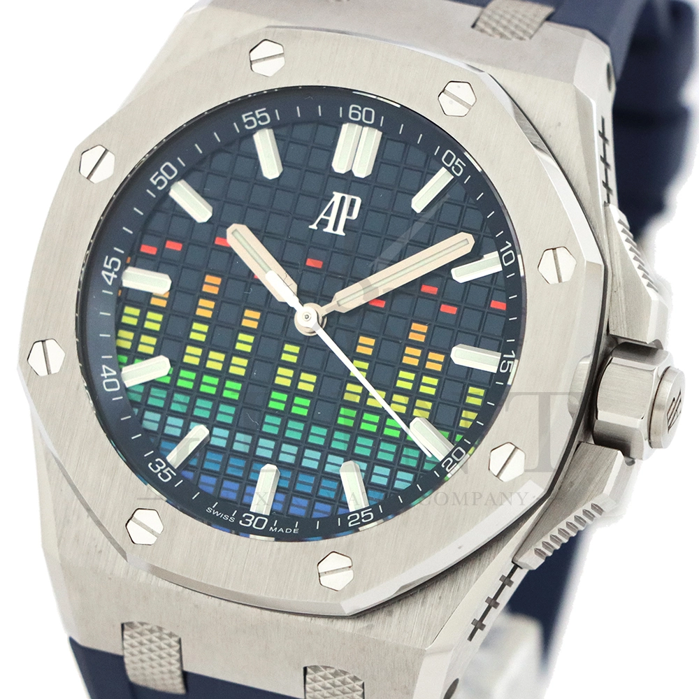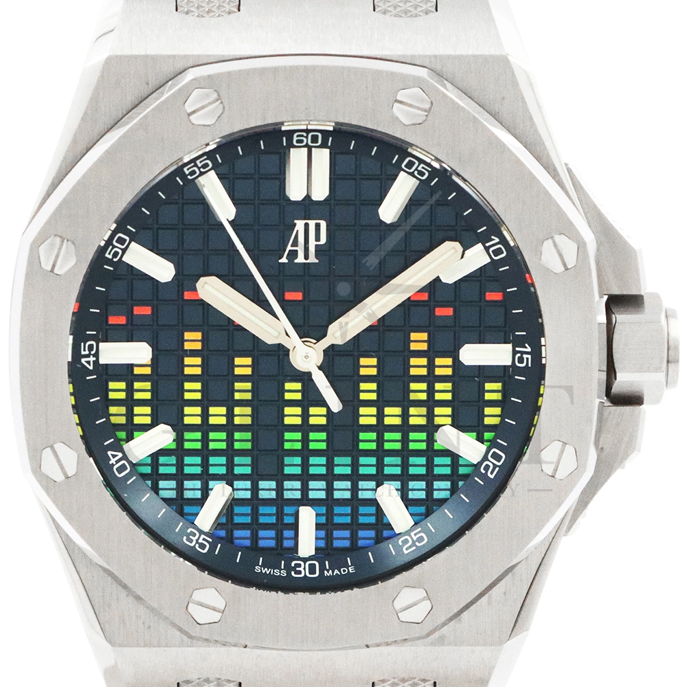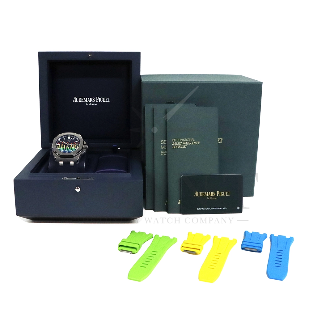 こちらはオーデマピゲ ロイヤル オーク オフショア ミュージックエディションです。ベゼルとケースにチタンを採用した大変希少なモデル。500本限定のこちらのモデルは音楽にインスパイアされており、ダイヤルはVUメーターを、プッシュピースガードはミキサーフェーダーを思わせます。ストラップにはラバーベルトを採用し、ブルーラバーストラップ、チタンのAPピンバックルと交換可能ストラップシステムを搭載。 シーンに合わせて交換可能なターコイズブルー、イエロー、グリーンのラバーストラップが付属致します。