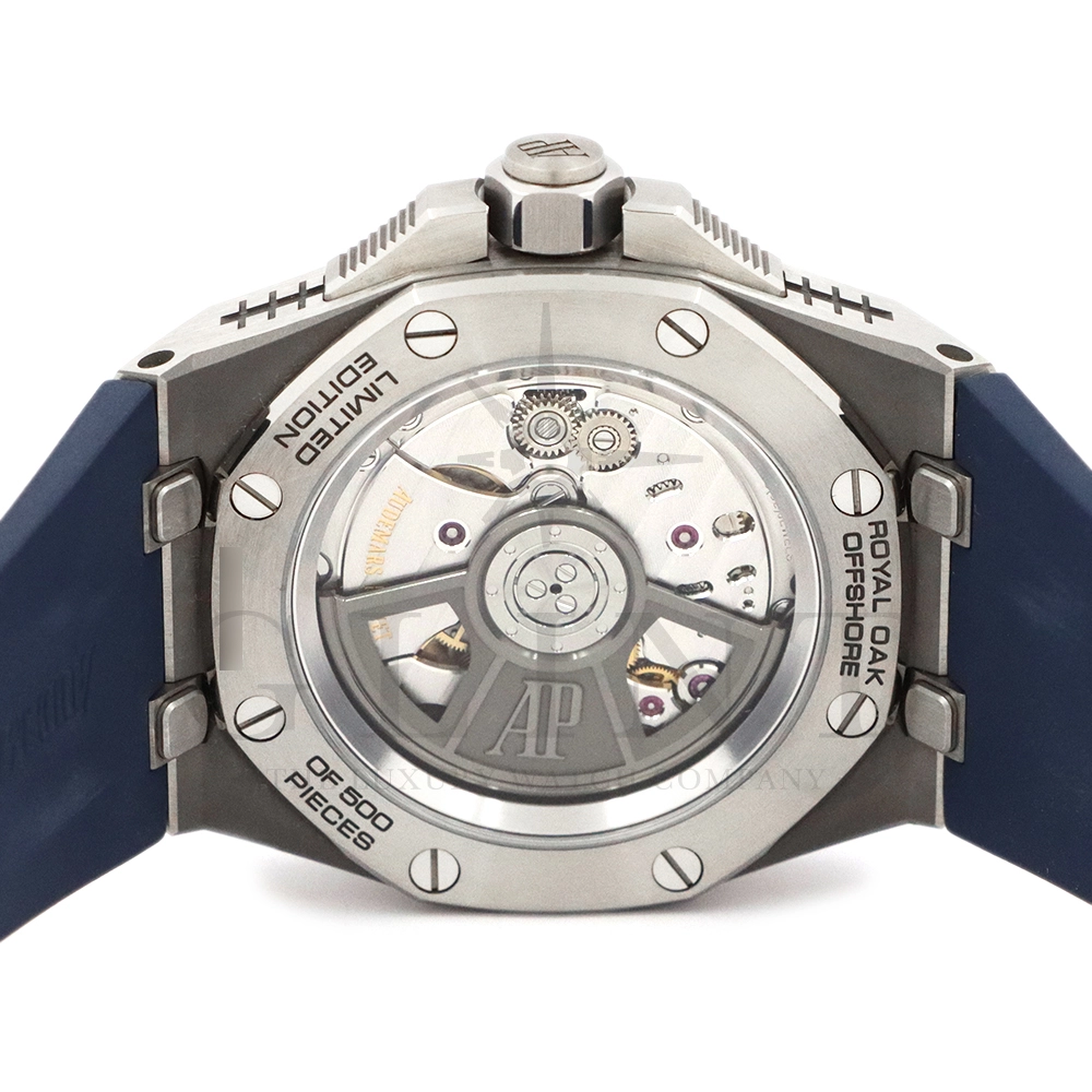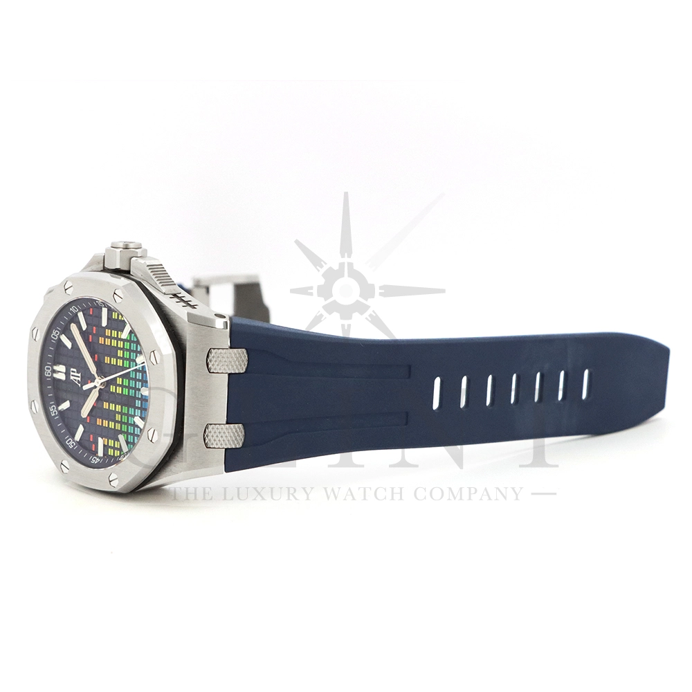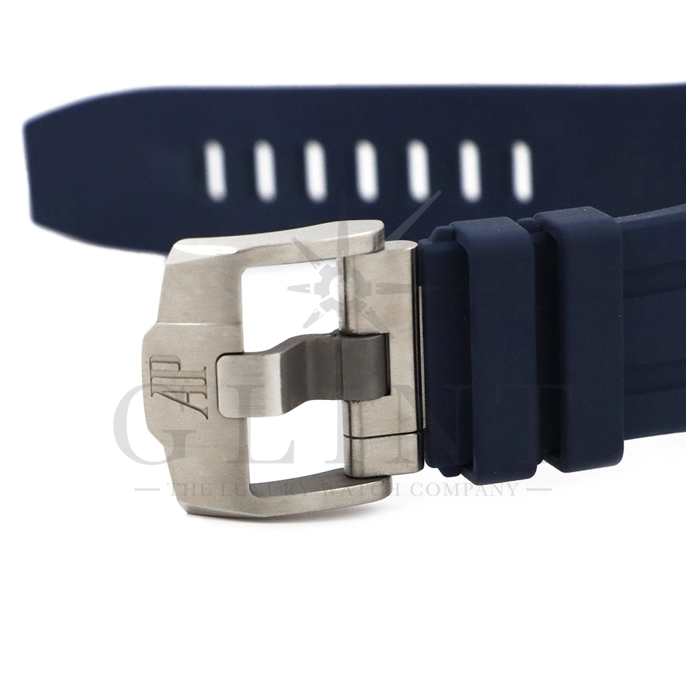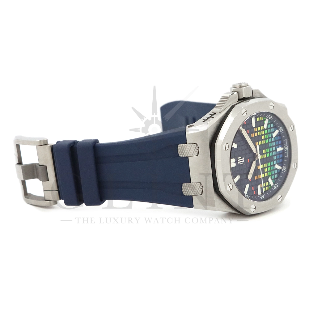 こちらはオーデマピゲ ロイヤル オーク オフショア ミュージックエディションです。ベゼルとケースにチタンを採用した大変希少なモデル。500本限定のこちらのモデルは音楽にインスパイアされており、ダイヤルはVUメーターを、プッシュピースガードはミキサーフェーダーを思わせます。ストラップにはラバーベルトを採用し、ブルーラバーストラップ、チタンのAPピンバックルと交換可能ストラップシステムを搭載。 シーンに合わせて交換可能なターコイズブルー、イエロー、グリーンのラバーストラップが付属致します。