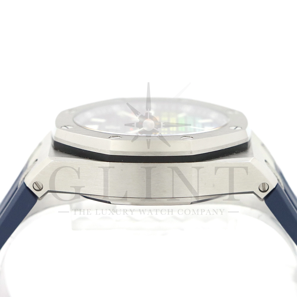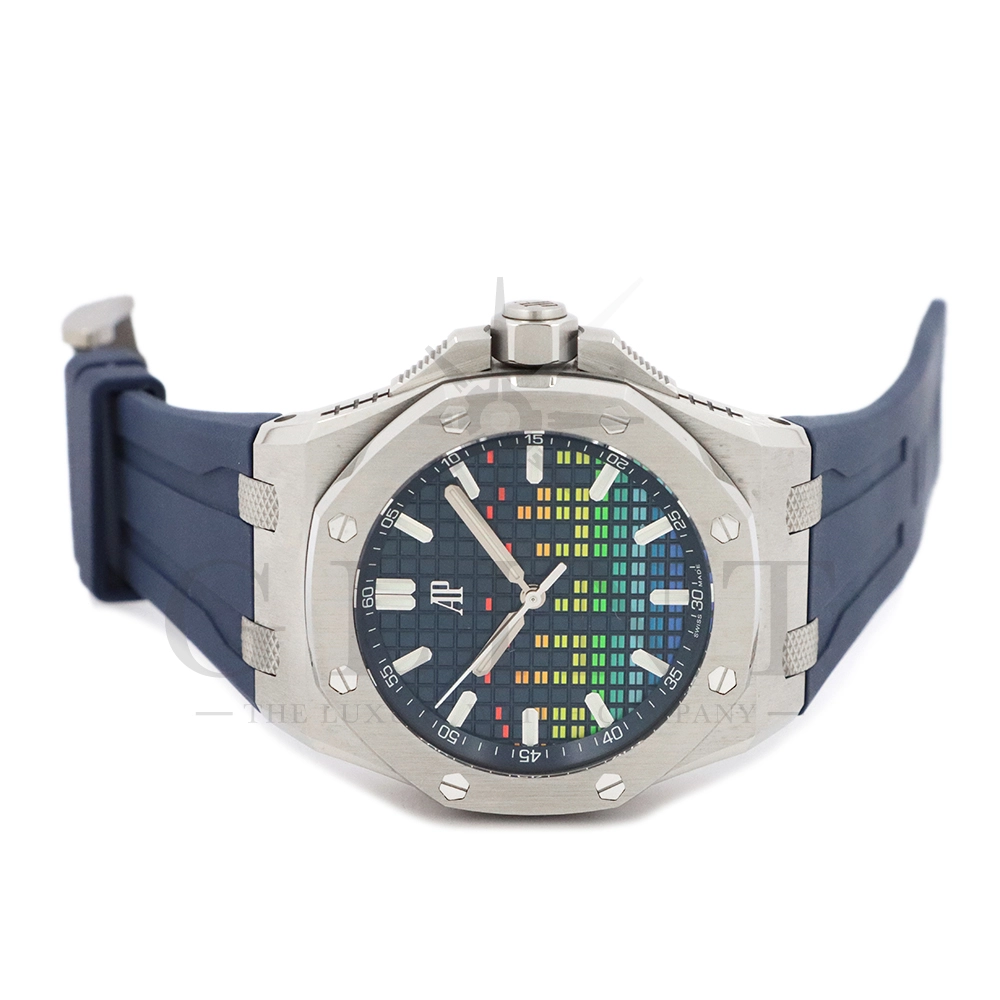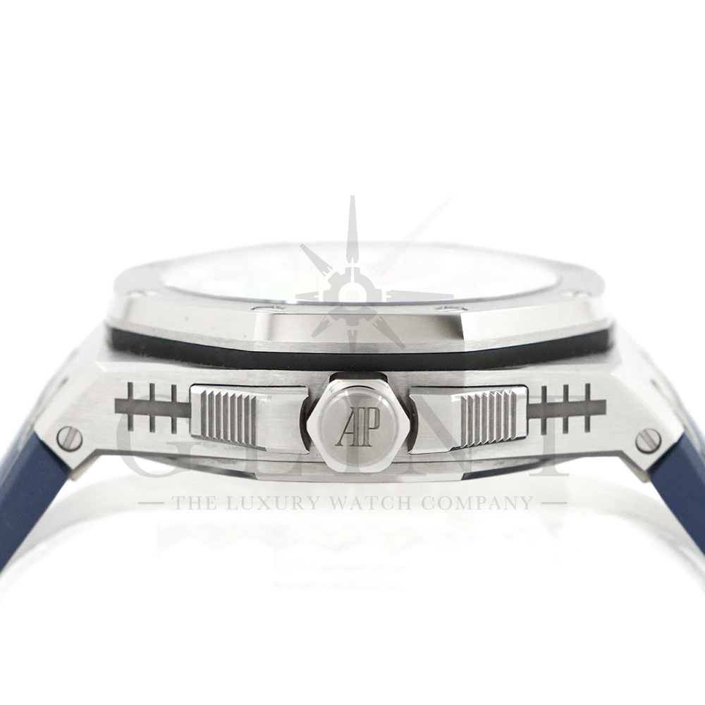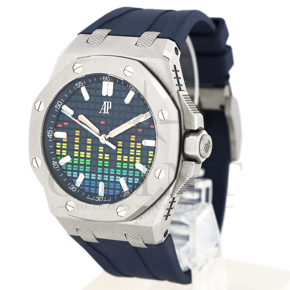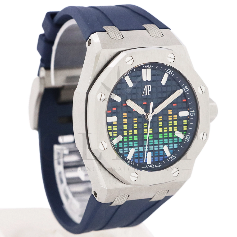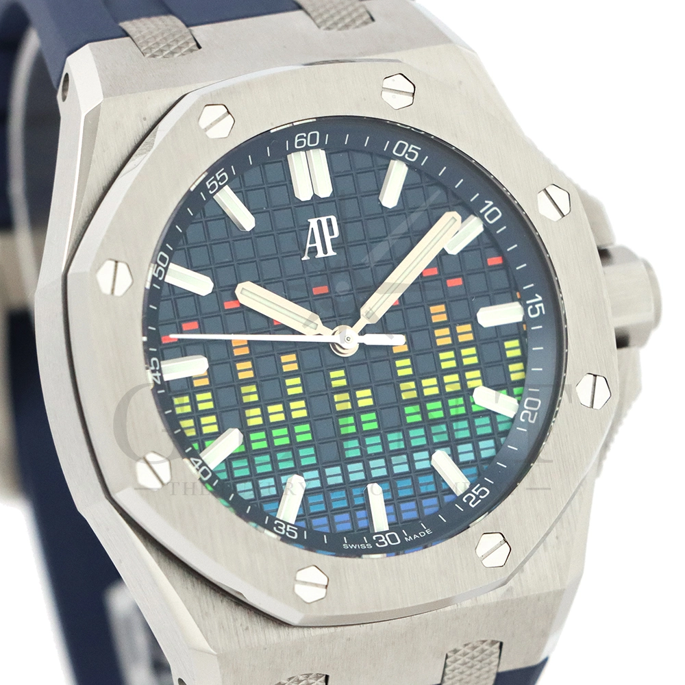 文字盤:印刷VUメーター付のブルーダイヤル、蓄光処理を施したホワイトゴールドのアプライドアワーマーカーとロイヤルオーク針