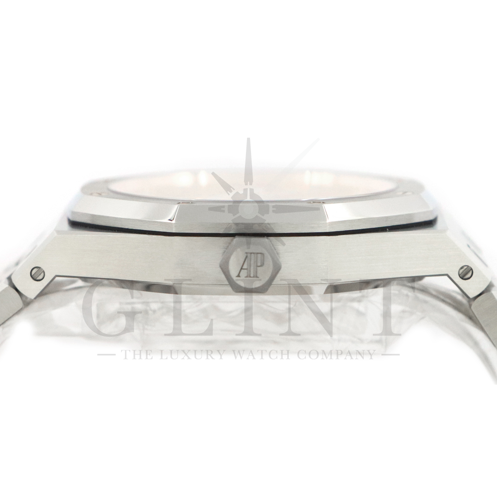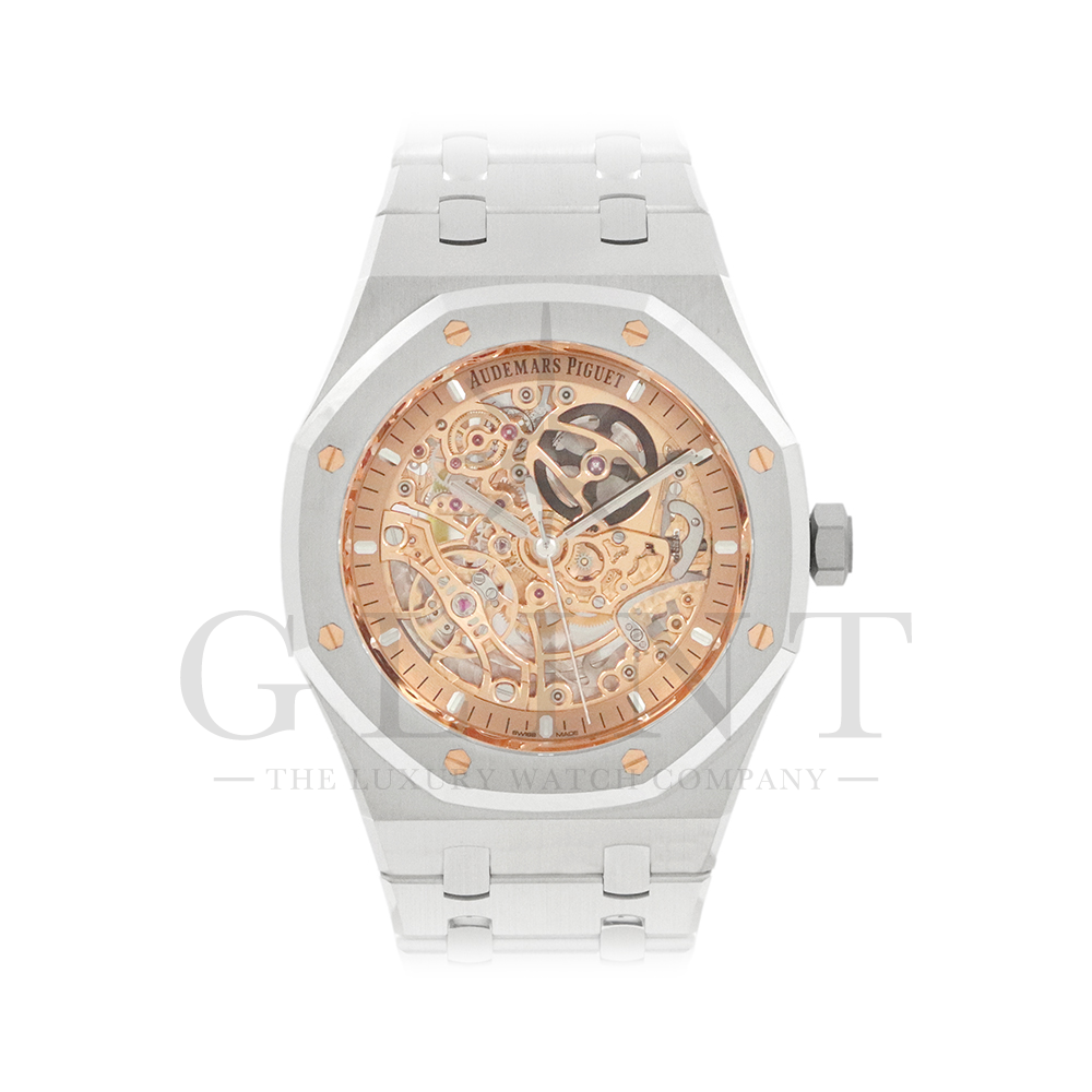 文字盤:ピンクゴールドカラーのインナーベゼル、蓄光処理を施したホワイトゴールドのアプライドアワーマーカーとロイヤル オーク針