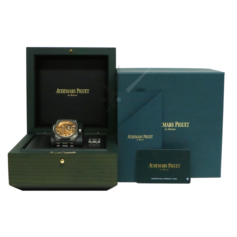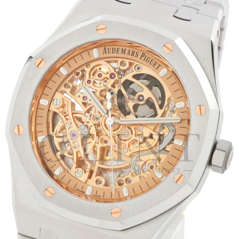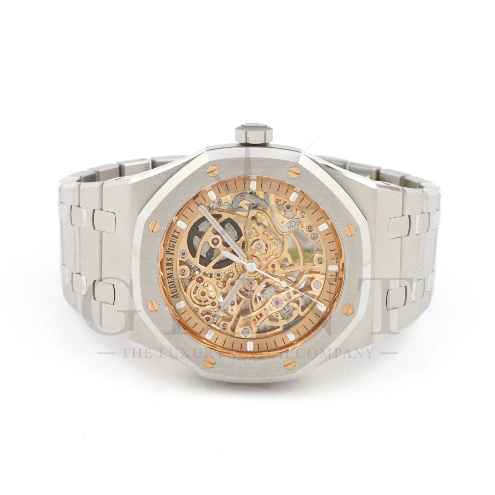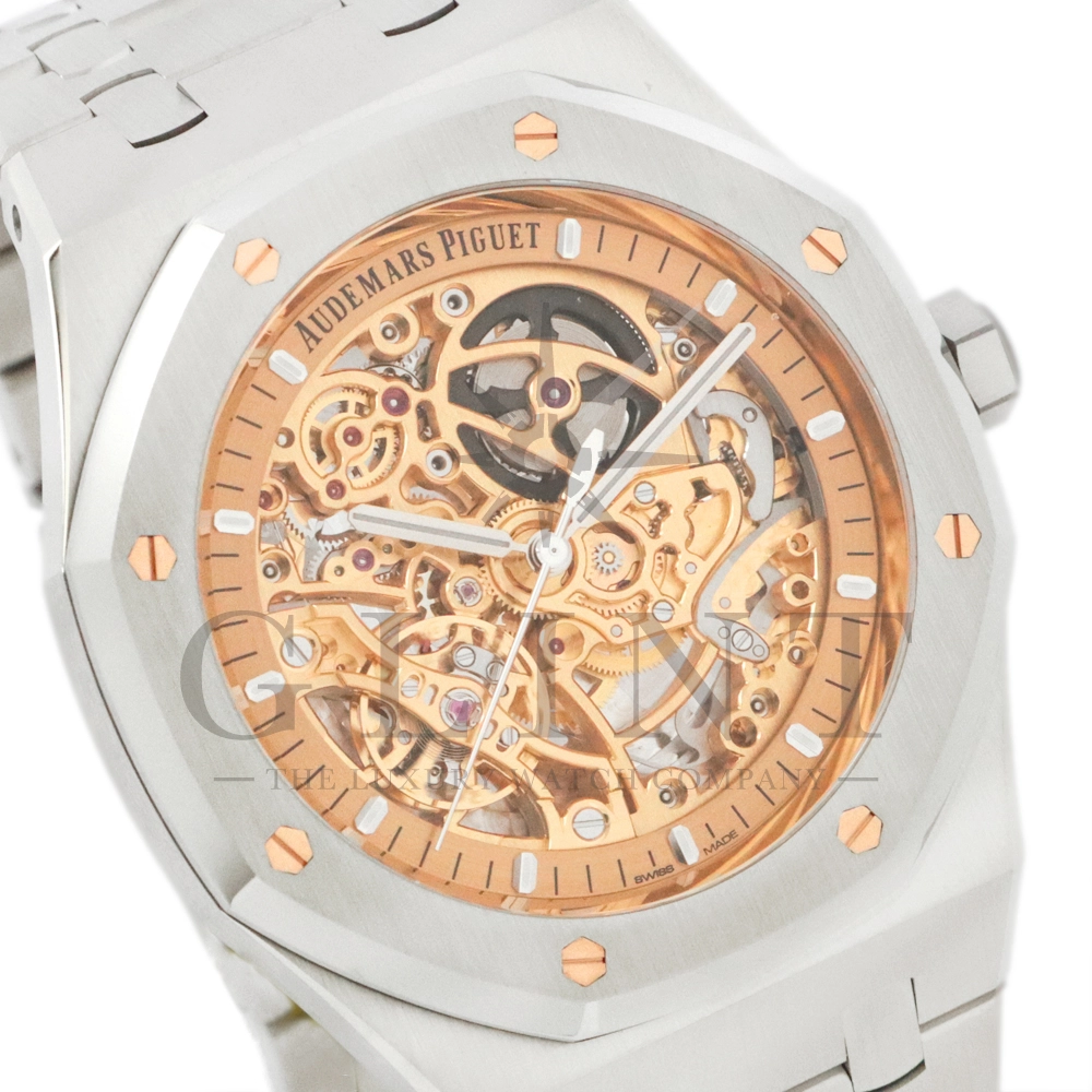 こちらはロイヤルオーク ダブルバランスホイール オープンワークです。2024年に登場したピンクゴールドカラーのダイヤルが印象的なモデル。高級感とモダンさが融合した独特な美しさを放っています。オーデマピゲが特許を取得した2つのテンプとヒゲゼンマイを一体化させることでムーブメントの安定性と精度を高める事を実現したダブルバランスホイール機構。オープンワークの文字盤からこの精緻な機構を眺める事ができます。オーデマピゲの時計製造における卓越した技術力と芸術的な仕上げと機械美を堪能できるラグジュアリーウォッチです。
