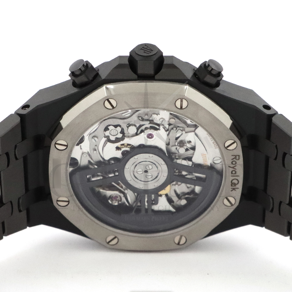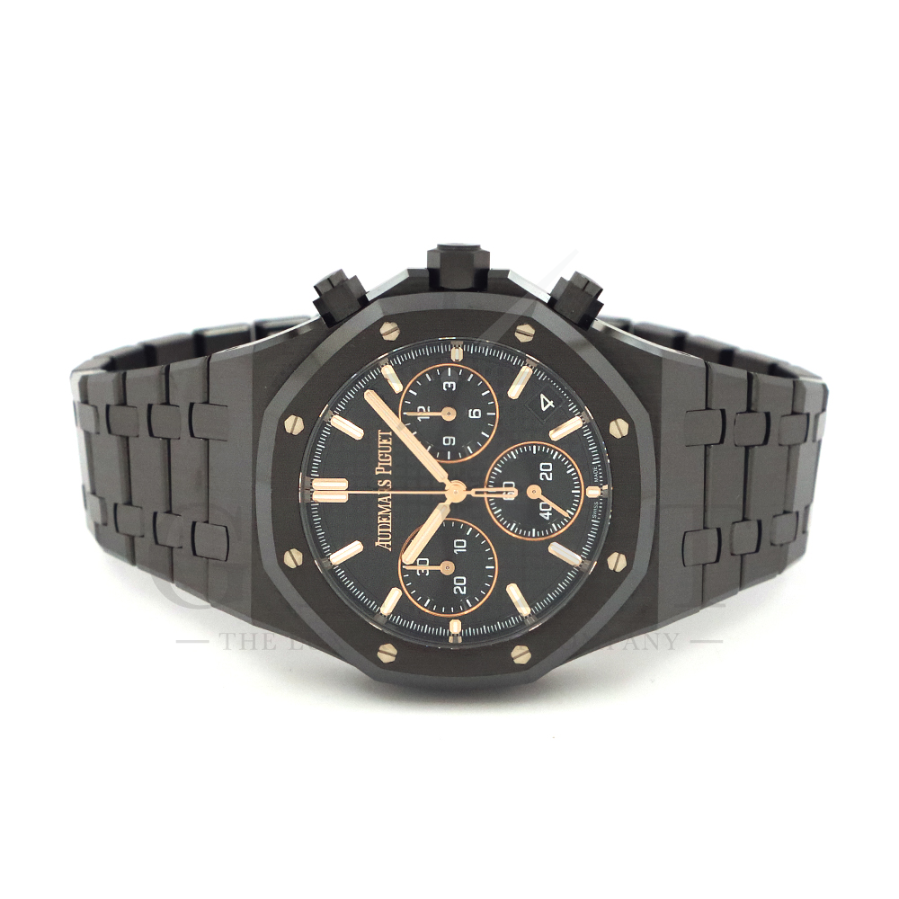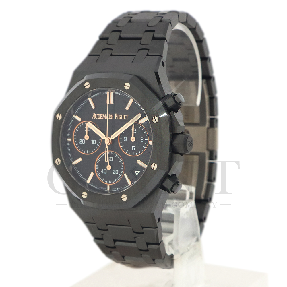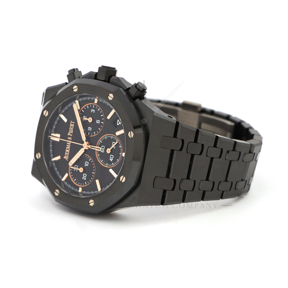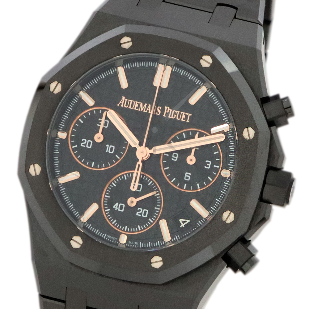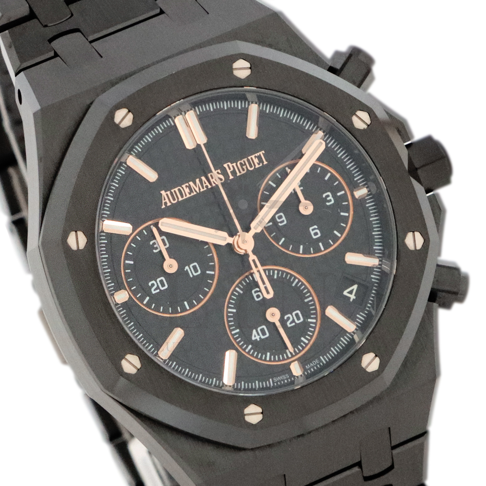 こちらは2022年に発表されたロイヤルオーク クロノグラフです。41mmのロイヤルオーク クロノグラフではオーデマピゲ初となるブラックセラミックモデル。プレポリッシュ、プレサテンブラッシュで準備された一つ一つのセラミックの部品を、手作業でポリッシュ面取りやオーデマピゲのトレードマークでもあるサテンブラッシュとポリッシュを組み合わせながら仕上げ、非常に高い耐久性と耐傷性、美しい光の反射を実現します。ブラックダイヤルにはピンクゴールドをアクセントとして組み合わせ、緻密な深みを放つブラックセラミックとのバイカラーが洗練されたコントラストを強調。ムーブメントには、CODE.11.59でも使用されている最新世代のCal.4401を搭載しており、約70時間のパワーリザーブやフライバッククロノグラフを備え、高い実用性を誇ります。シースルーバックからはコート・ド・ジュネーブなど美しい仕上げが施されたムーブメントやブラックカラーに統一されたローターを堪能いただけます。伝統の技術をコンテンポラリーなデザインで包んだタイムレスなエレガンスさを感じられる至極の一本です。