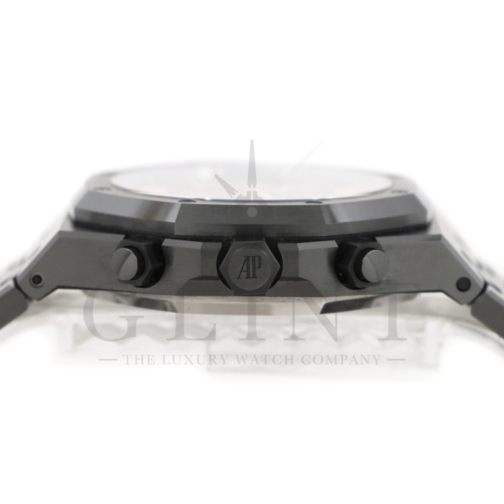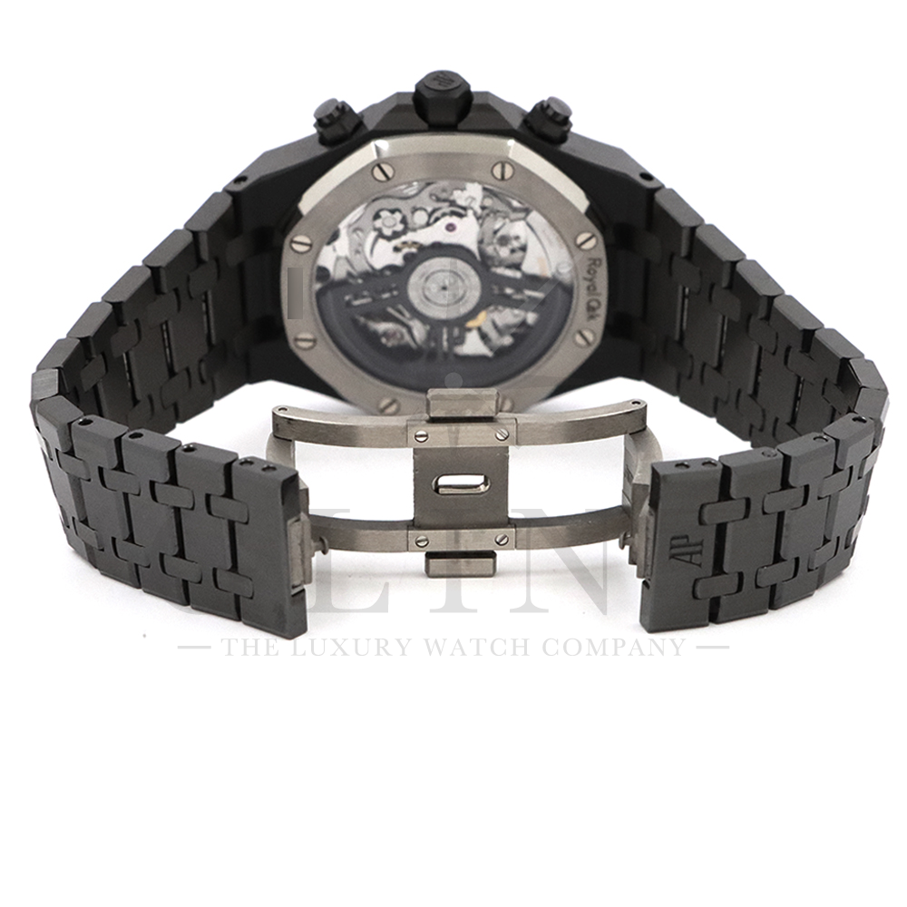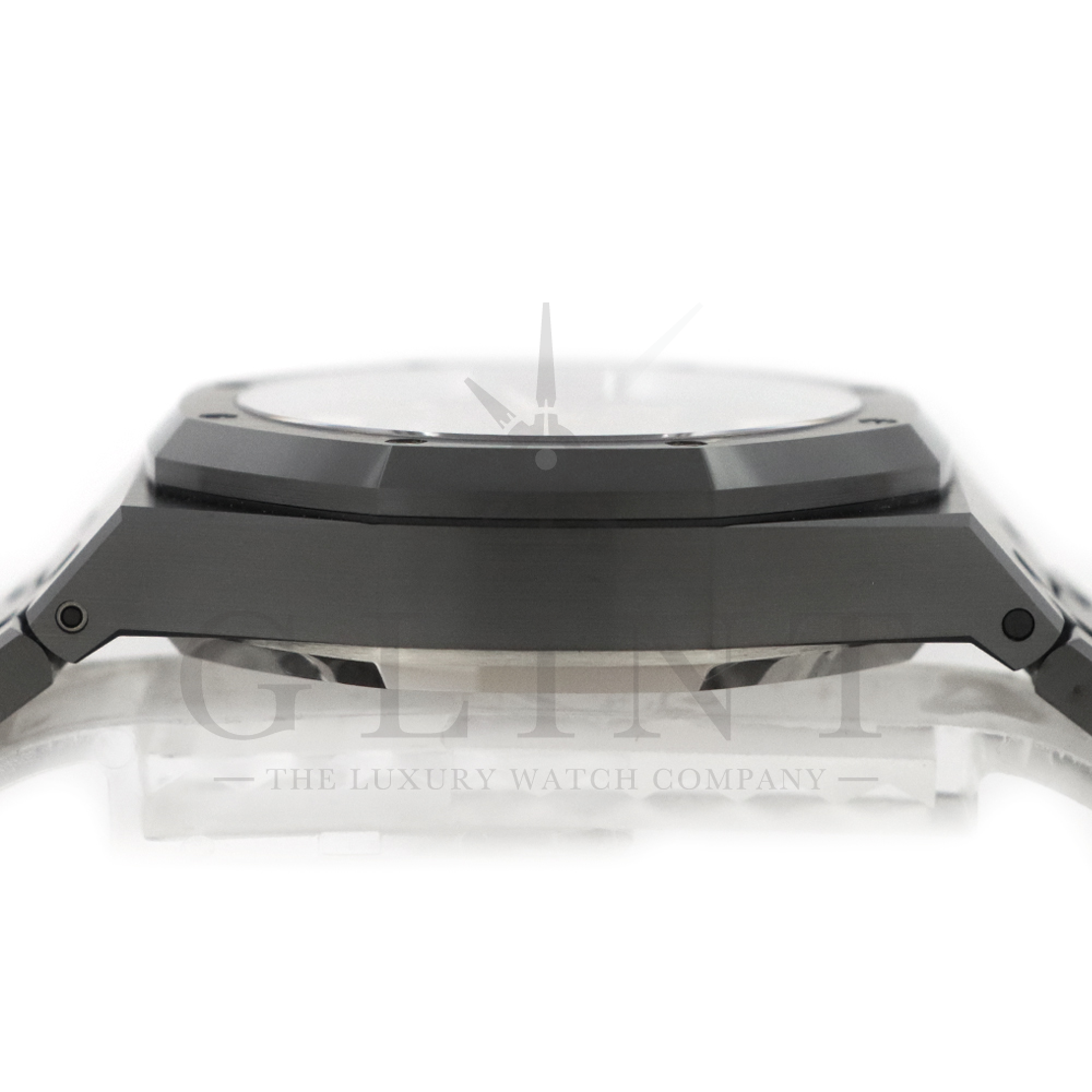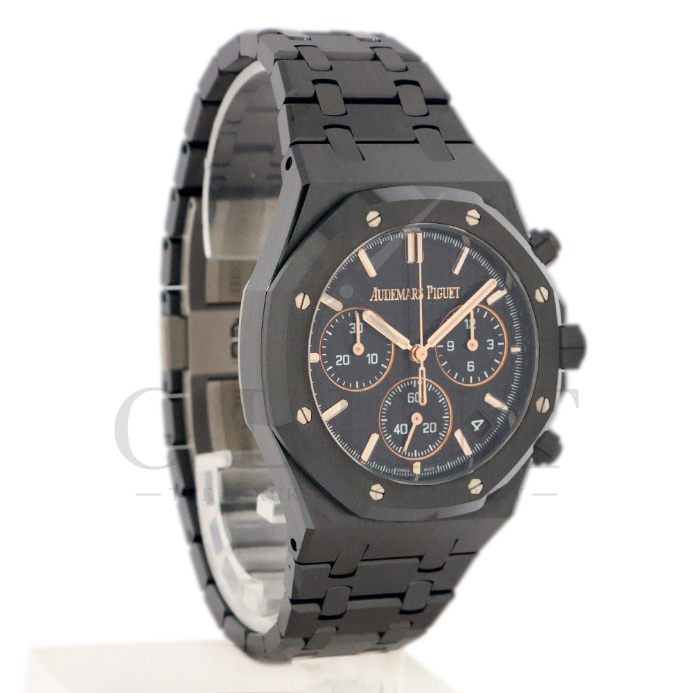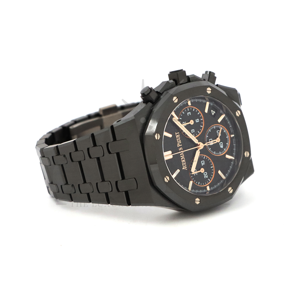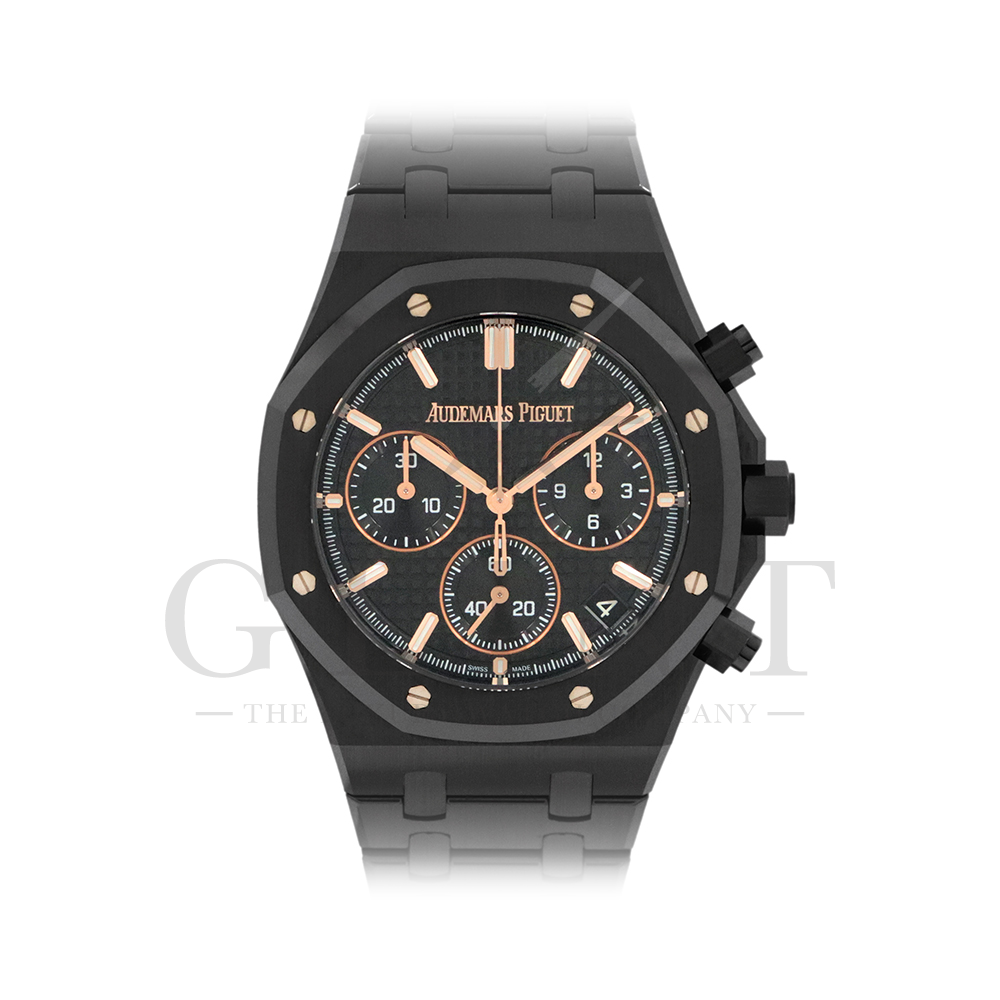 こちらは2022年に発表されたロイヤルオーク クロノグラフです。41mmのロイヤルオーク クロノグラフではオーデマピゲ初となるブラックセラミックモデル。プレポリッシュ、プレサテンブラッシュで準備された一つ一つのセラミックの部品を、手作業でポリッシュ面取りやオーデマピゲのトレードマークでもあるサテンブラッシュとポリッシュを組み合わせながら仕上げ、非常に高い耐久性と耐傷性、美しい光の反射を実現します。ブラックダイヤルにはピンクゴールドをアクセントとして組み合わせ、緻密な深みを放つブラックセラミックとのバイカラーが洗練されたコントラストを強調。ムーブメントには、CODE.11.59でも使用されている最新世代のCal.4401を搭載しており、約70時間のパワーリザーブやフライバッククロノグラフを備え、高い実用性を誇ります。シースルーバックからはコート・ド・ジュネーブなど美しい仕上げが施されたムーブメントやブラックカラーに統一されたローターを堪能いただけます。伝統の技術をコンテンポラリーなデザインで包んだタイムレスなエレガンスさを感じられる至極の一本です。