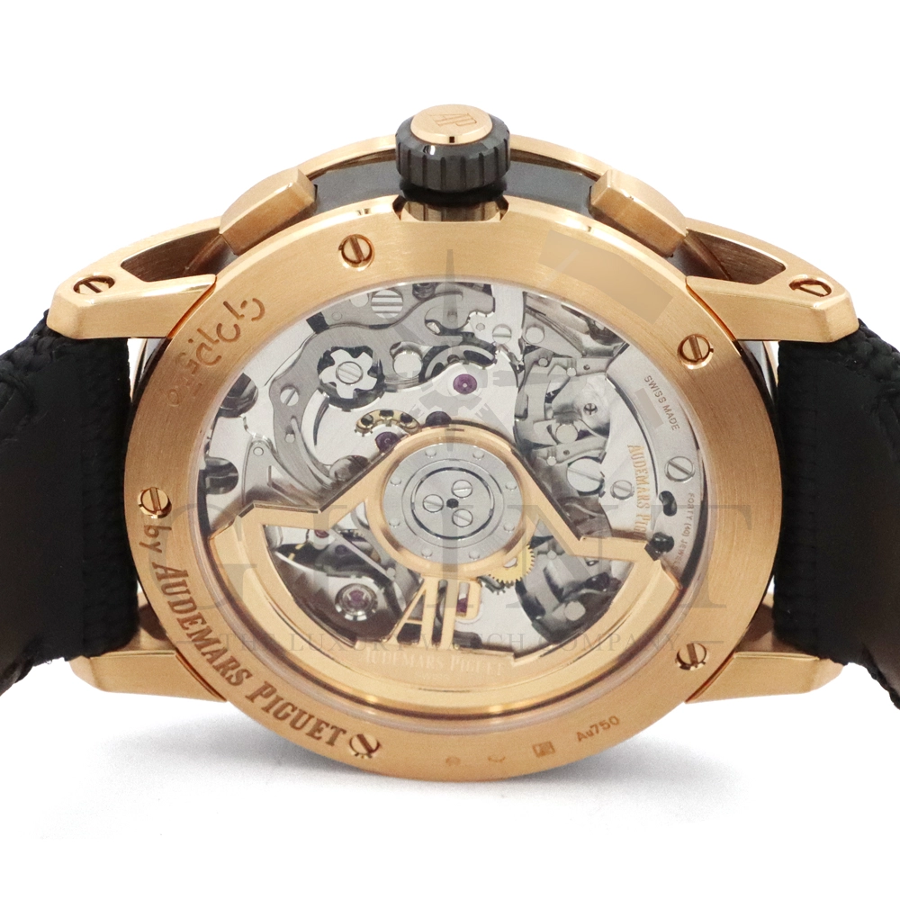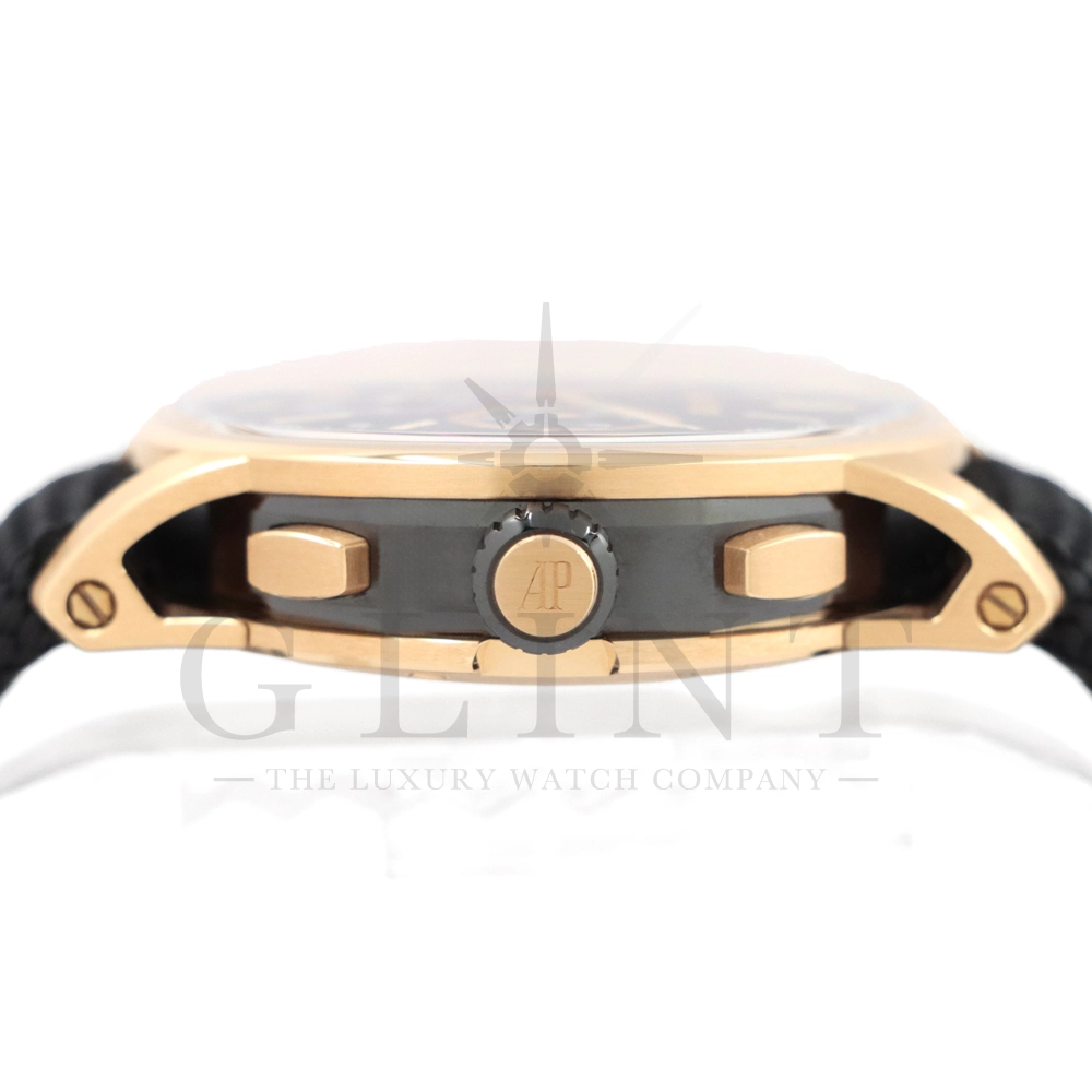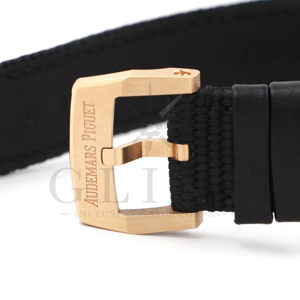 こちらはCODE 11.59 バイ オーデマ ピゲ クロノグラフ 26393NR.OO.A002KB.02です。素材に18Kピンクゴールドとブラックセラミックを使用した高級感溢れるモデルとなります。ダイヤルはスイスのギヨシェ職人ヤン・フォン・ケーネルと共同制作したという文字盤。百以上に及ぶ微小な凹凸が生み出す輝きと陰影はもはや芸術的で、波目模様のスタンプ加工を施しております。CODE 11.59の特徴である風防のダブルカーブサファイアクリスタルガラスが生み出す視覚効果と相まって、これまでのモデルとはまったく違う世界観を演出してくれるでしょう。インデックスがすべて蓄光付きのバータイプとなり、その外周には8Hzの振動数に合わせた緻密なチャプターリングを採用。クロノグラフのカウンターもそれぞれに異なる組み合わせを与えるなど、視認性も向上しております。ムーブメントにはフライバッククロノグラフCal.4401を搭載。シースルーバックからは外観が非常に美しいムーブメントをご覧いただく事ができます。コレクションの最新のデザイン進化を取り入れた至極の一本です。