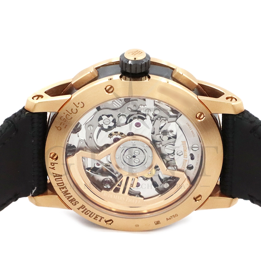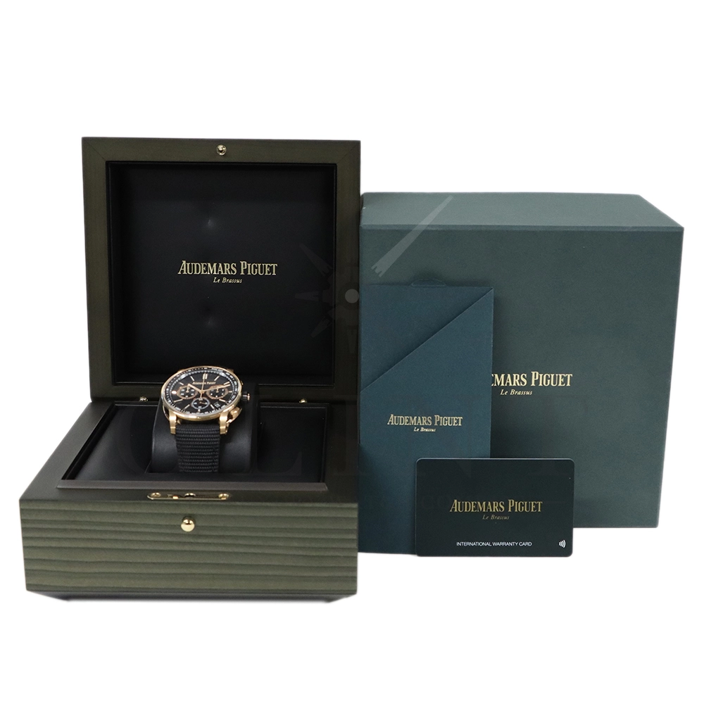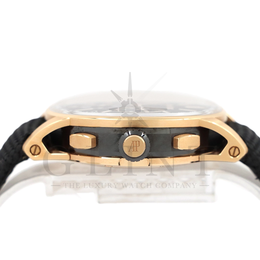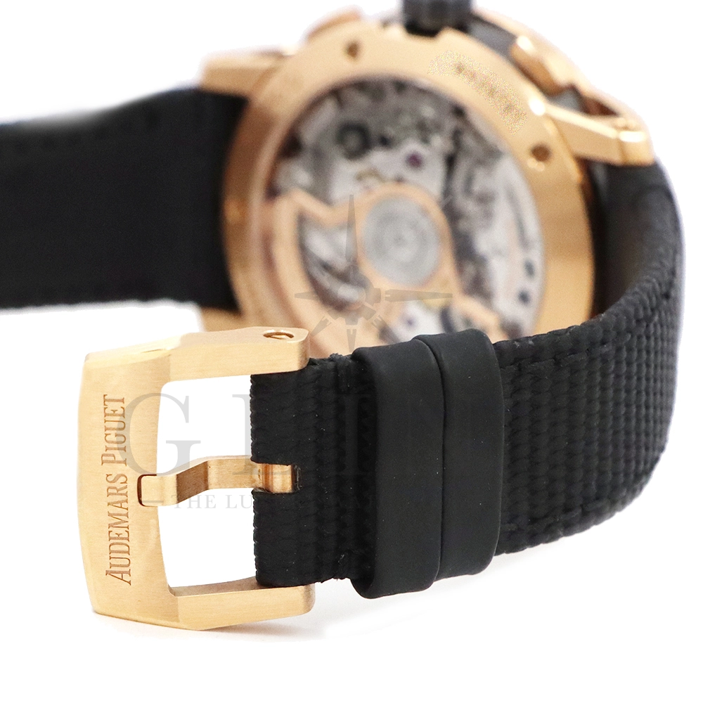 こちらはCODE 11.59 バイ オーデマ ピゲ クロノグラフ 26393NR.OO.A002KB.02です。素材に18Kピンクゴールドとブラックセラミックを使用した高級感溢れるモデルとなります。ダイヤルはスイスのギヨシェ職人ヤン・フォン・ケーネルと共同制作したという文字盤。百以上に及ぶ微小な凹凸が生み出す輝きと陰影はもはや芸術的で、波目模様のスタンプ加工を施しております。CODE 11.59の特徴である風防のダブルカーブサファイアクリスタルガラスが生み出す視覚効果と相まって、これまでのモデルとはまったく違う世界観を演出してくれるでしょう。インデックスがすべて蓄光付きのバータイプとなり、その外周には8Hzの振動数に合わせた緻密なチャプターリングを採用。クロノグラフのカウンターもそれぞれに異なる組み合わせを与えるなど、視認性も向上しております。ムーブメントにはフライバッククロノグラフCal.4401を搭載。シースルーバックからは外観が非常に美しいムーブメントをご覧いただく事ができます。コレクションの最新のデザイン進化を取り入れた至極の一本です。