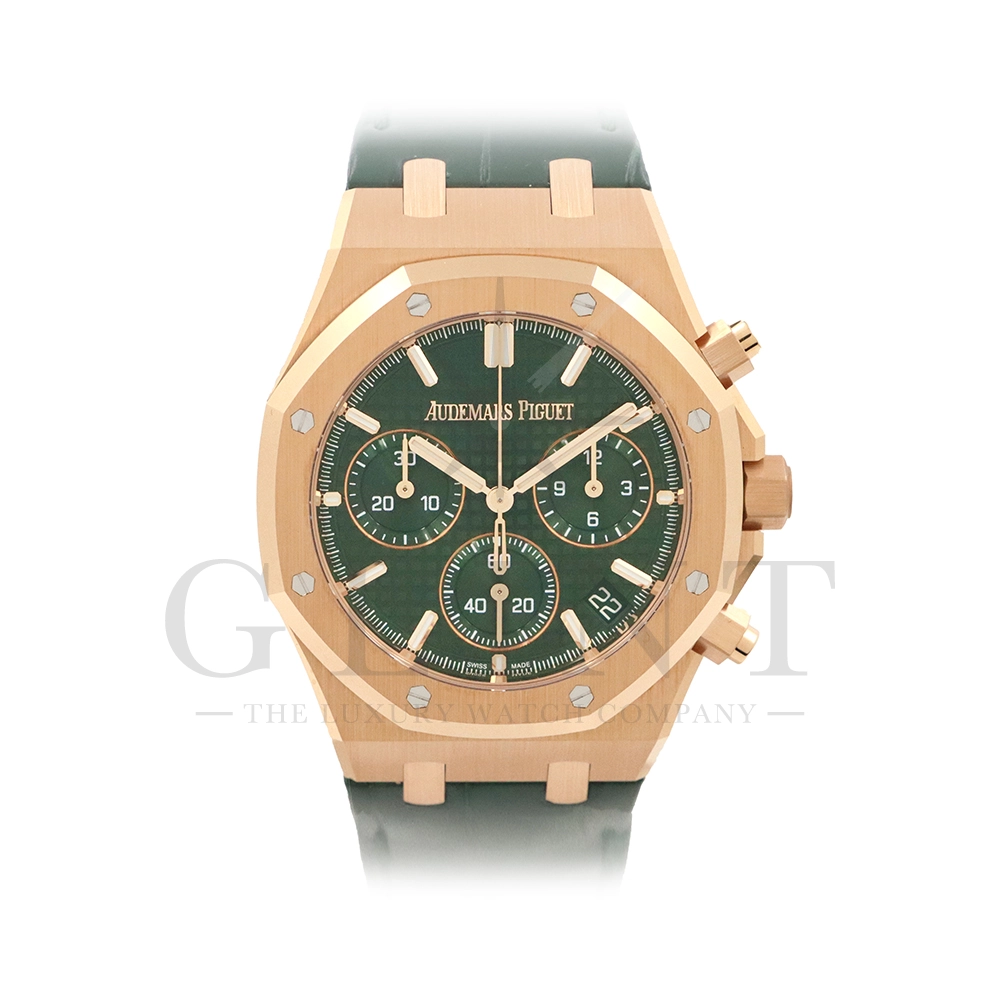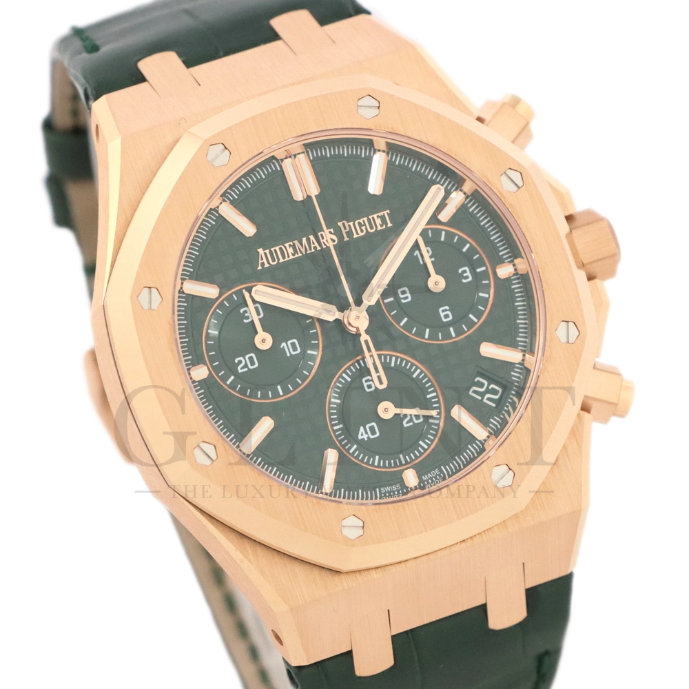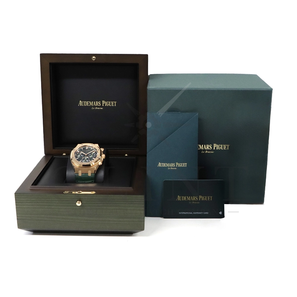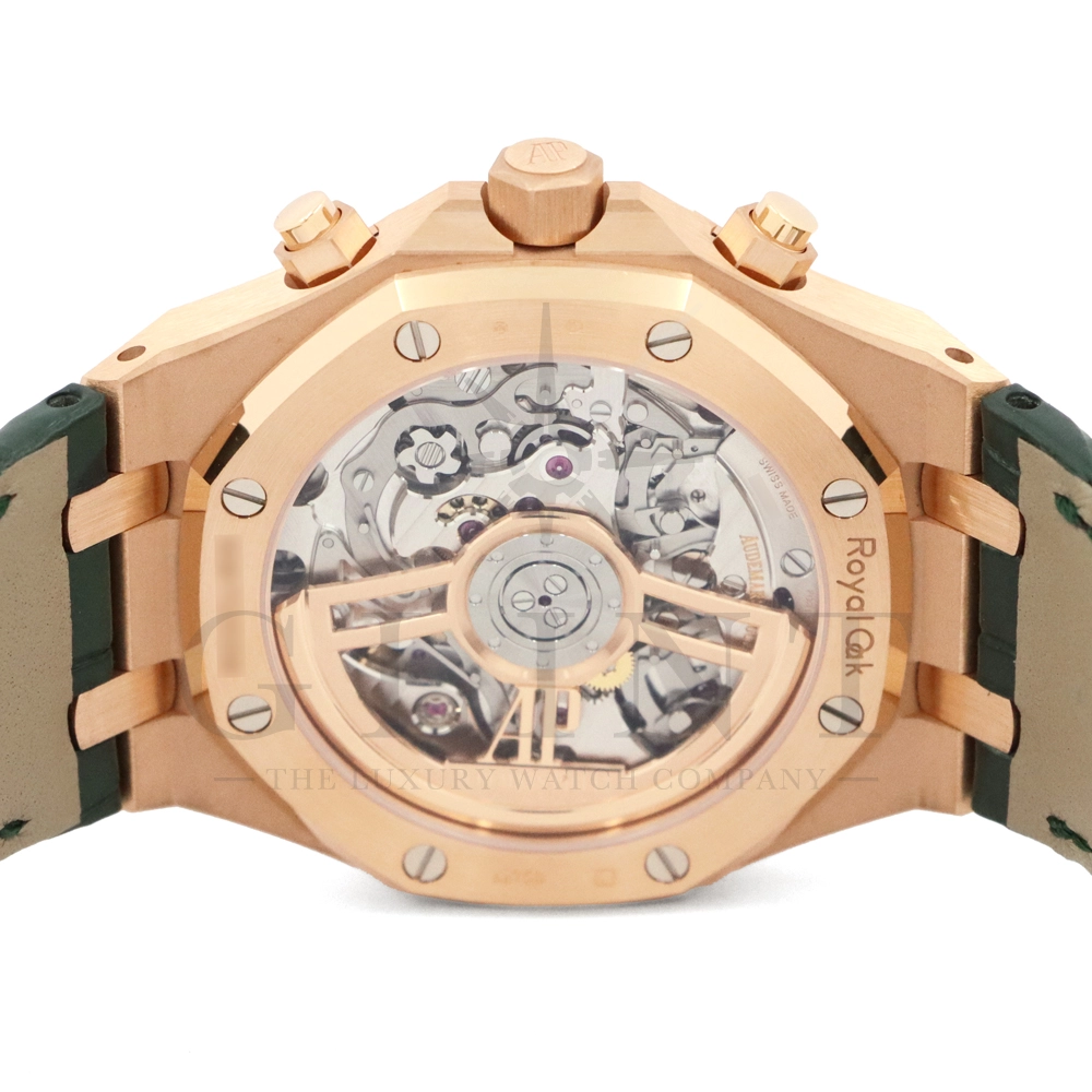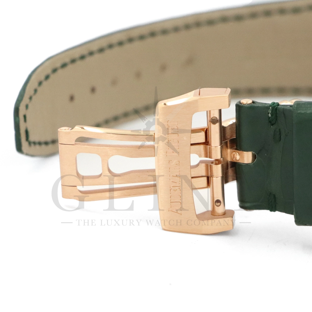 文字盤:「グランドタペストリー」模様のカーキグリーンダイヤル、グリーンカウンター、蓄光処理を施したピンクゴールドのアプライドアワーマーカーとロイヤルオーク針