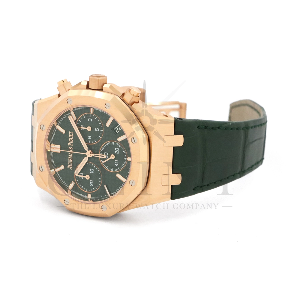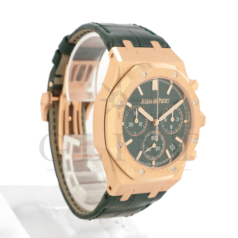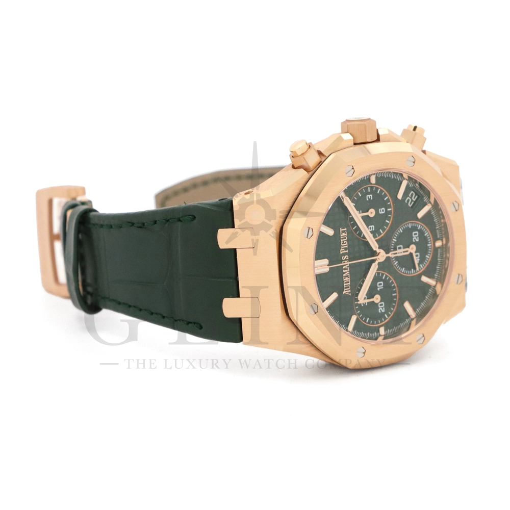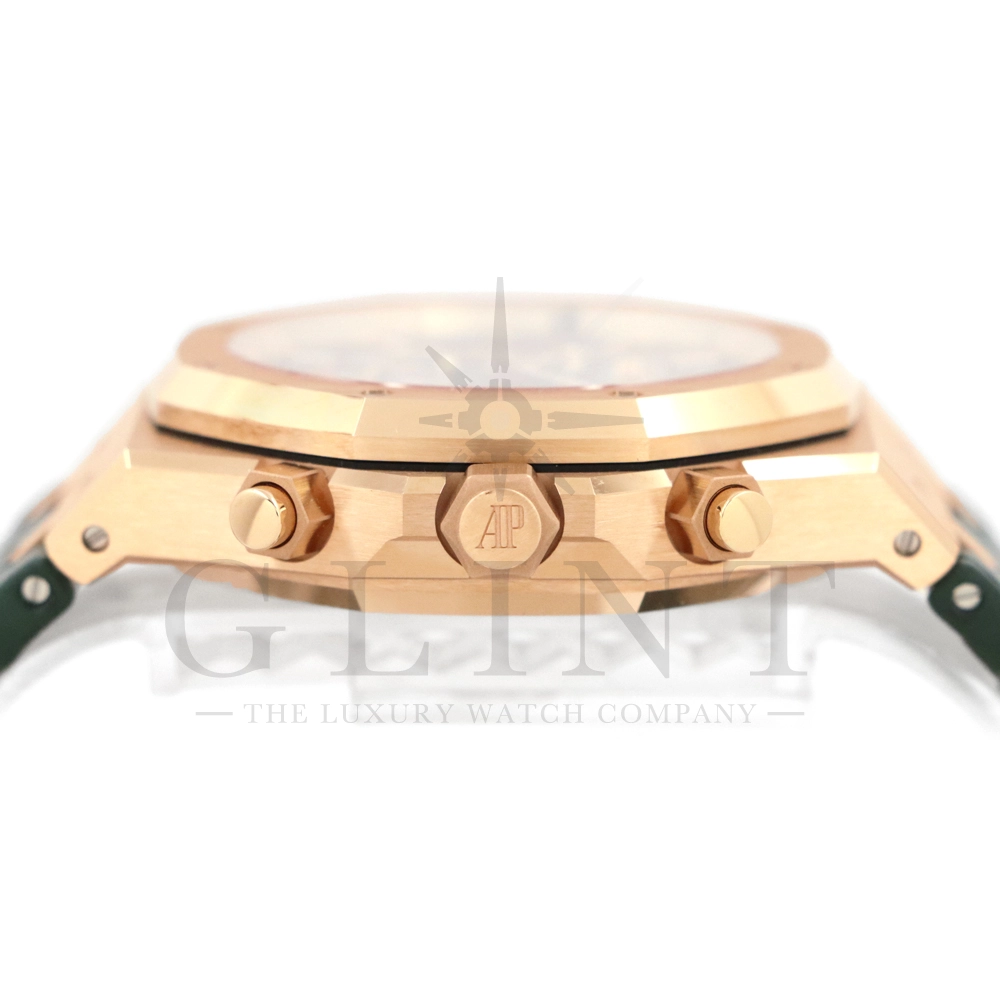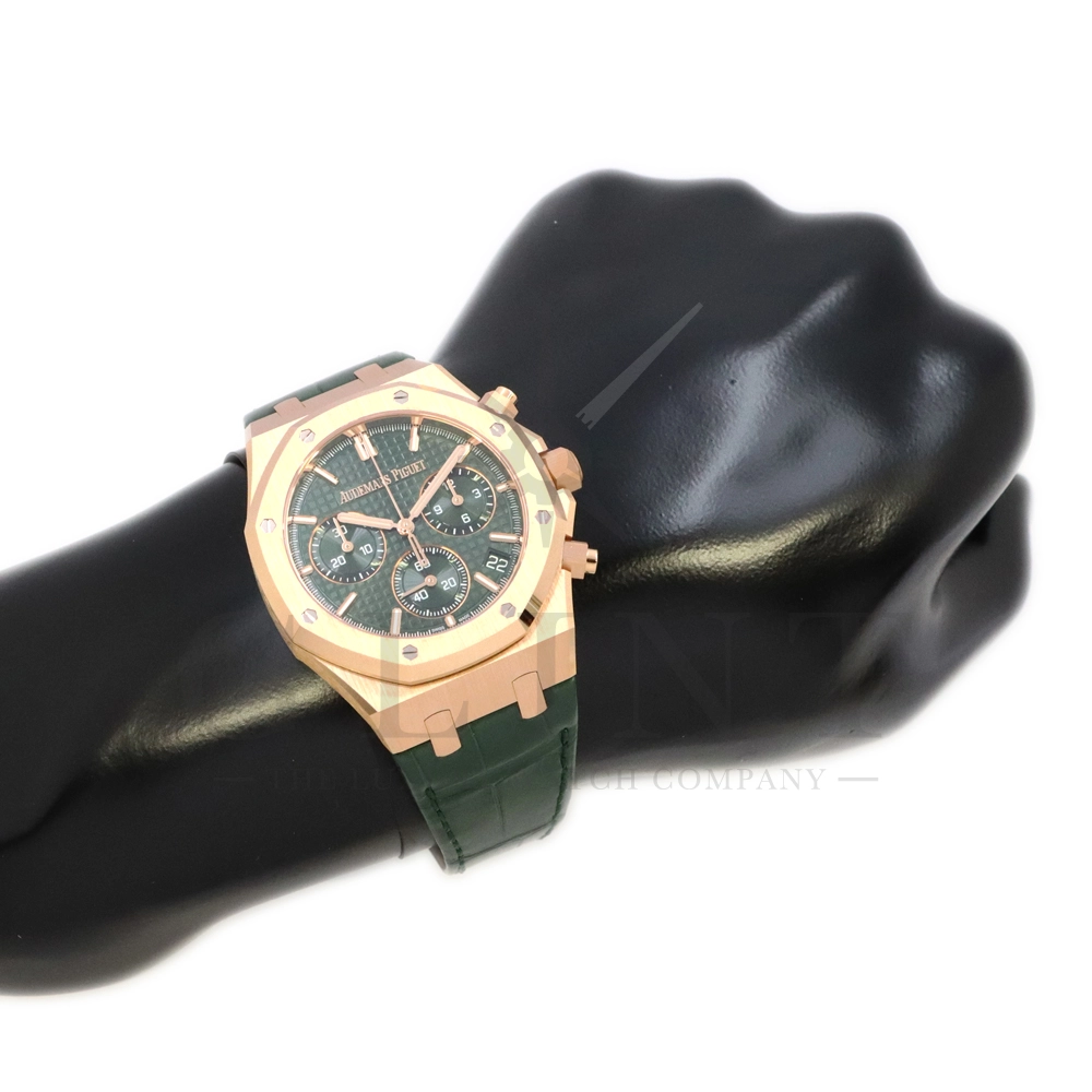 文字盤:「グランドタペストリー」模様のカーキグリーンダイヤル、グリーンカウンター、蓄光処理を施したピンクゴールドのアプライドアワーマーカーとロイヤルオーク針