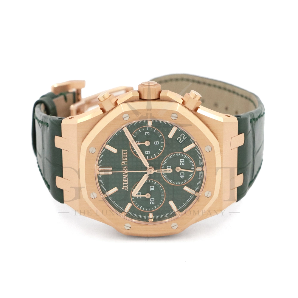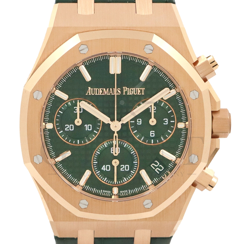 こちらはロイヤル オーク クロノグラフ 26240OR.OO.D404CR.02です。完全自社製Cal.4401を搭載し、70時間のパワーリザーブを実現。測定精度も向上し操作しやすいジャンピングデイトを備え、一体型クロノグラフのフライバック機能、垂直クラッチシステム、ゼロリセットメカニズムを装備しております。18Kピンクゴールドケースの、ダイヤルには美しいグリーンの「グランド・タペストリー」模様を採用し、12時位置の〔AP〕ロゴの廃止。ケースバックのサファイアケースバックからは、AUDEMARS PIGUETのシグネチャーが彫られたロゴやケース色と同色に揃えられた特性のAPのローターをお楽しみいただけます。世界三大時計ブランドが誇る人気のロイヤル オーク クロノグラフは所有者を格別な気持ちにさせてくれるステータス性が高い極上の一本です。