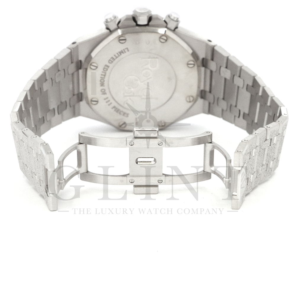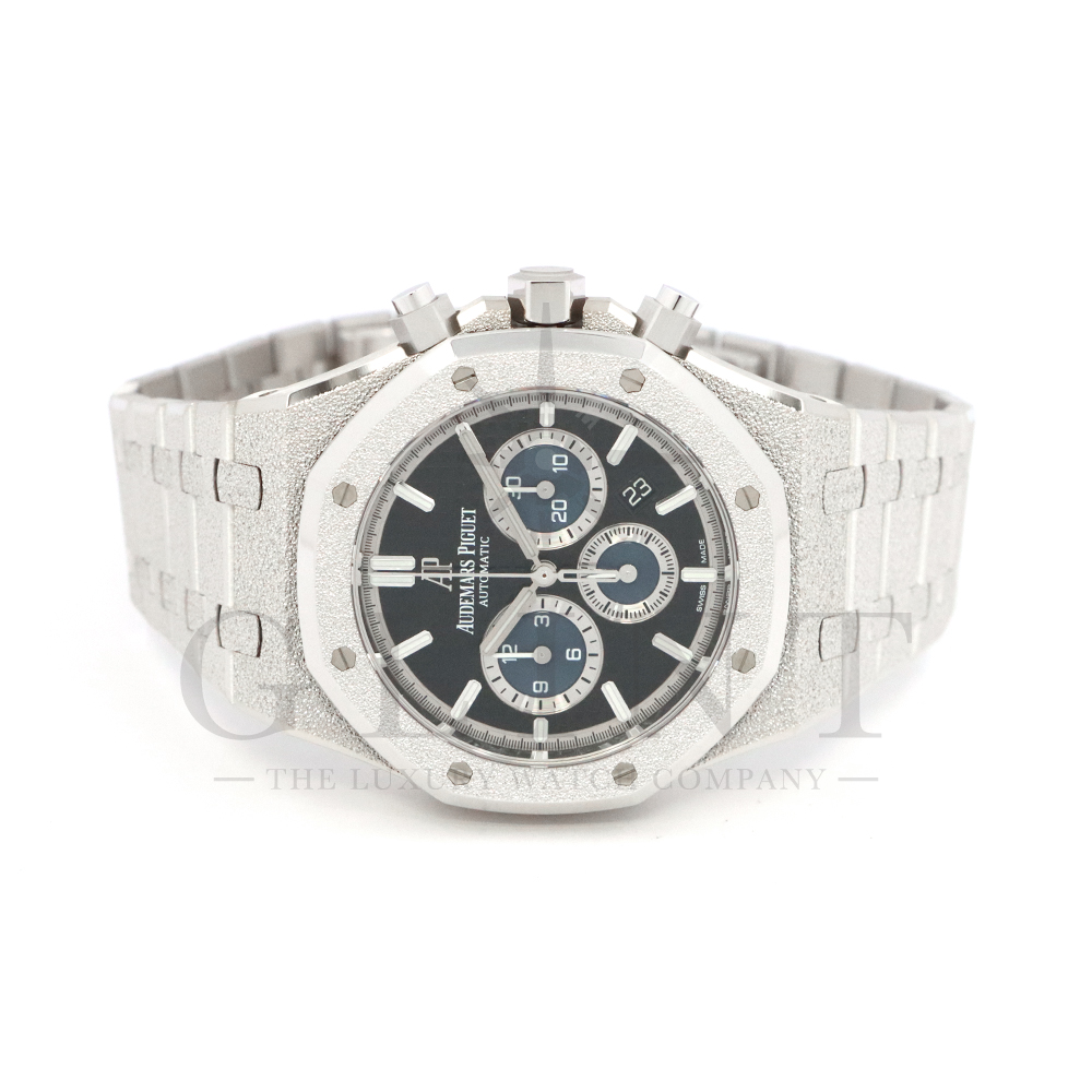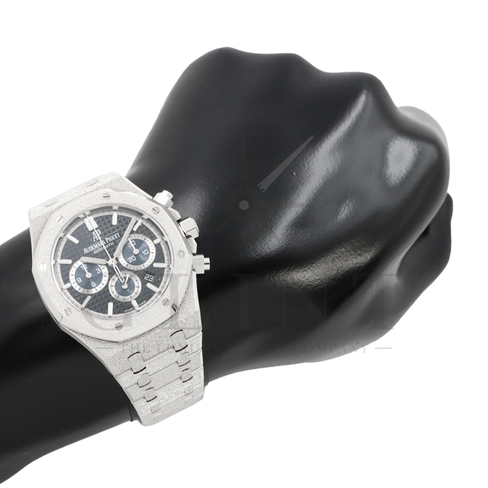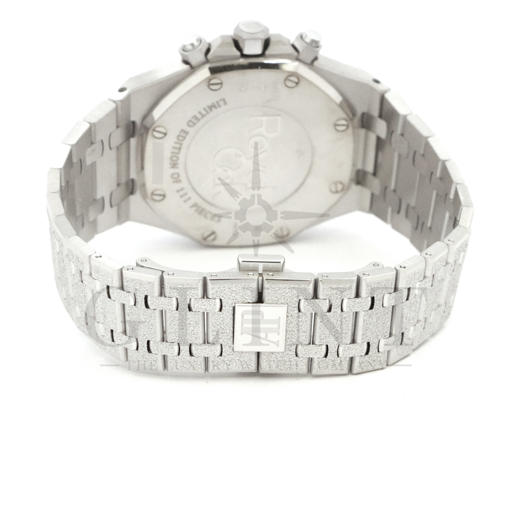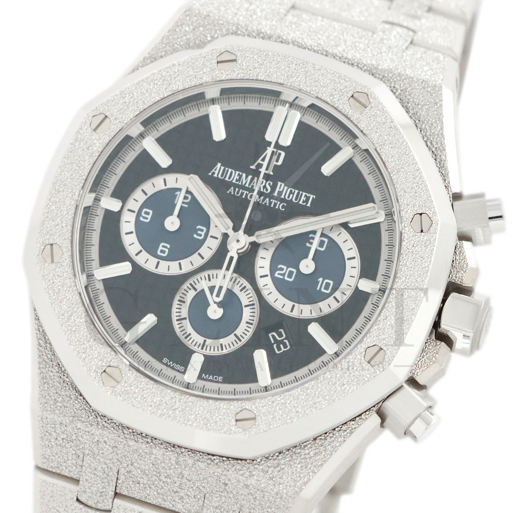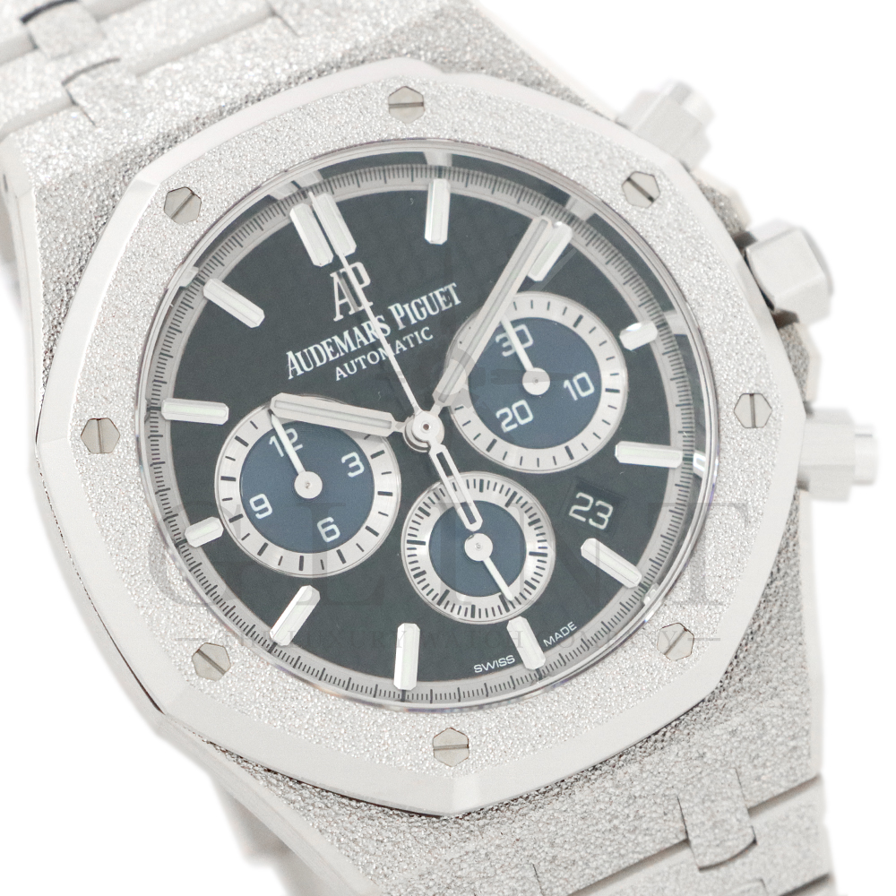 文字盤:「グランドタペストリー」模様のブラックダイヤル、グレーブルーのカウンター、蓄光処理を施した18Kホワイトゴールドのアプライドアワーマーカーとロイヤルオーク針