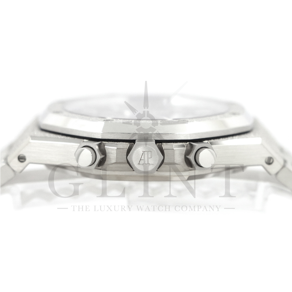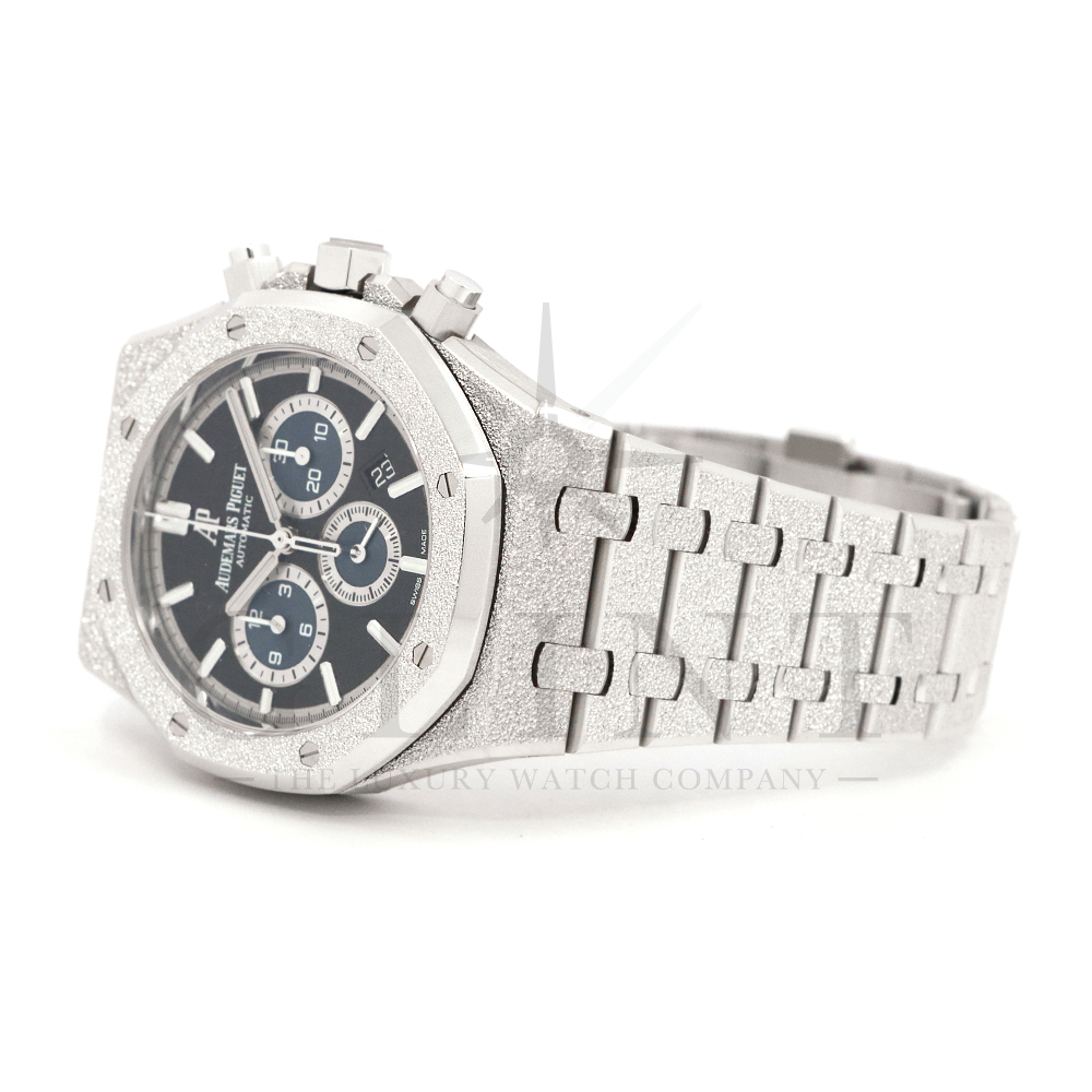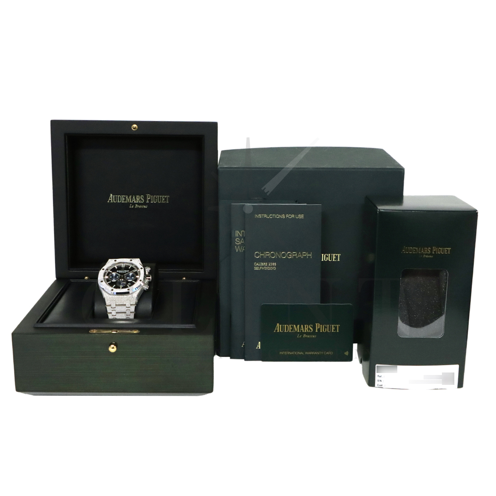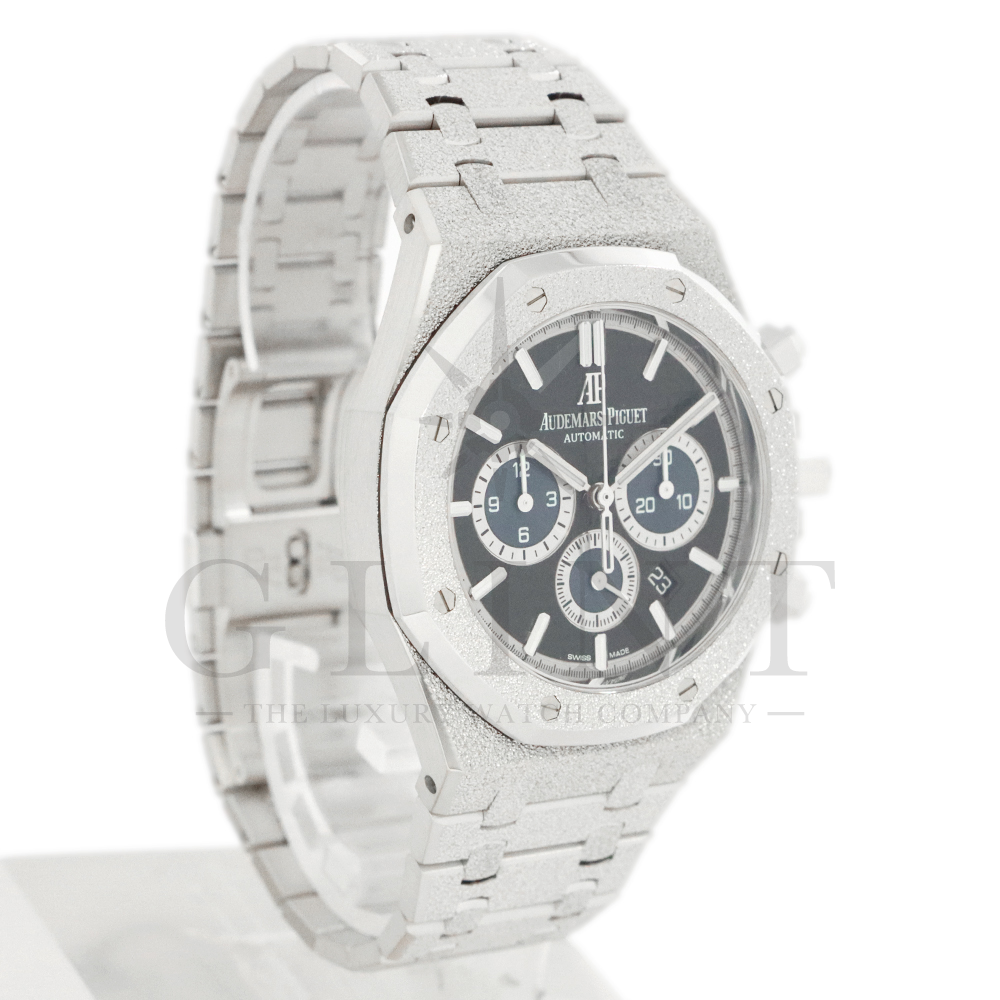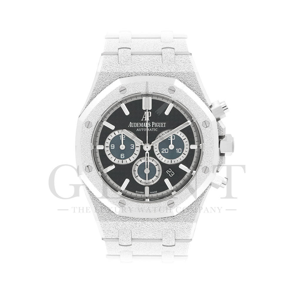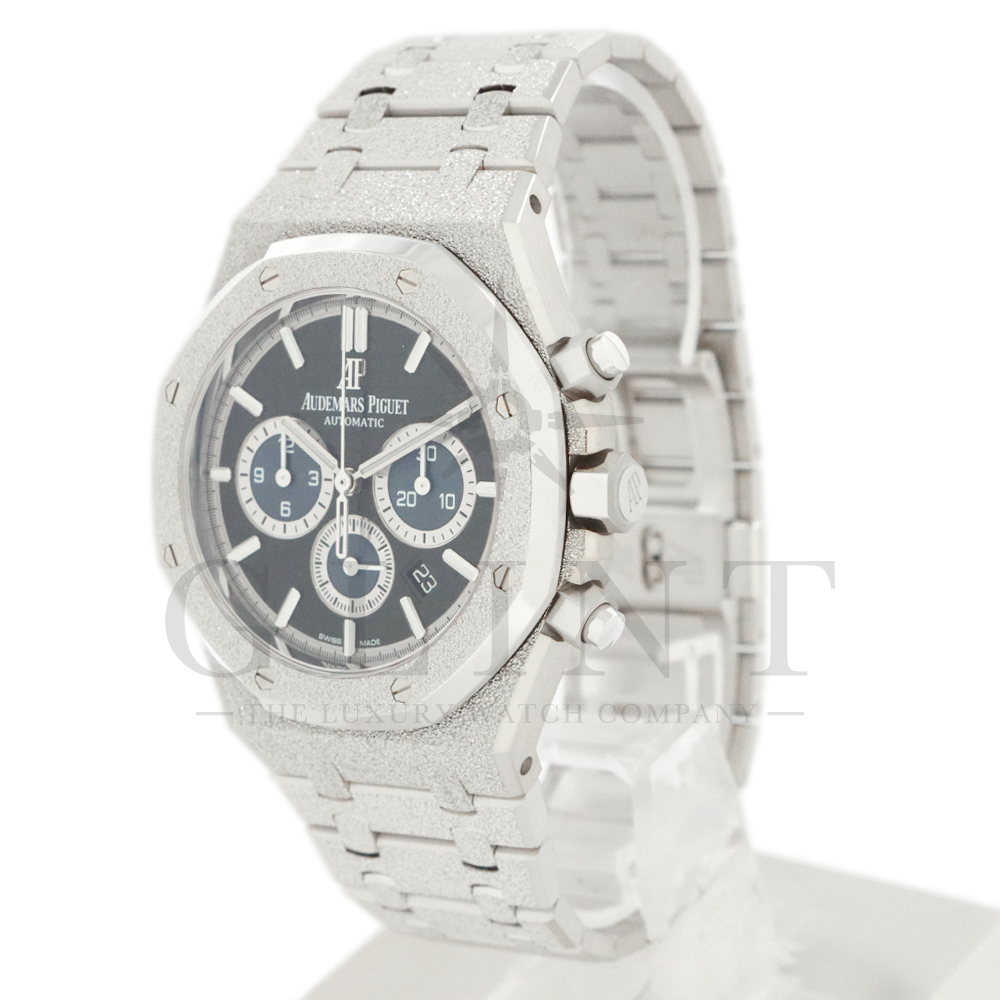 文字盤:「グランドタペストリー」模様のブラックダイヤル、グレーブルーのカウンター、蓄光処理を施した18Kホワイトゴールドのアプライドアワーマーカーとロイヤルオーク針