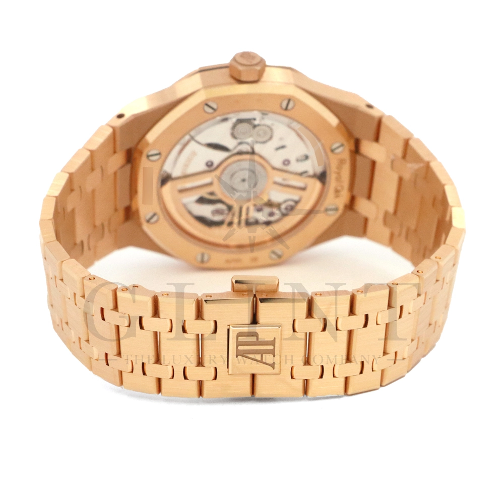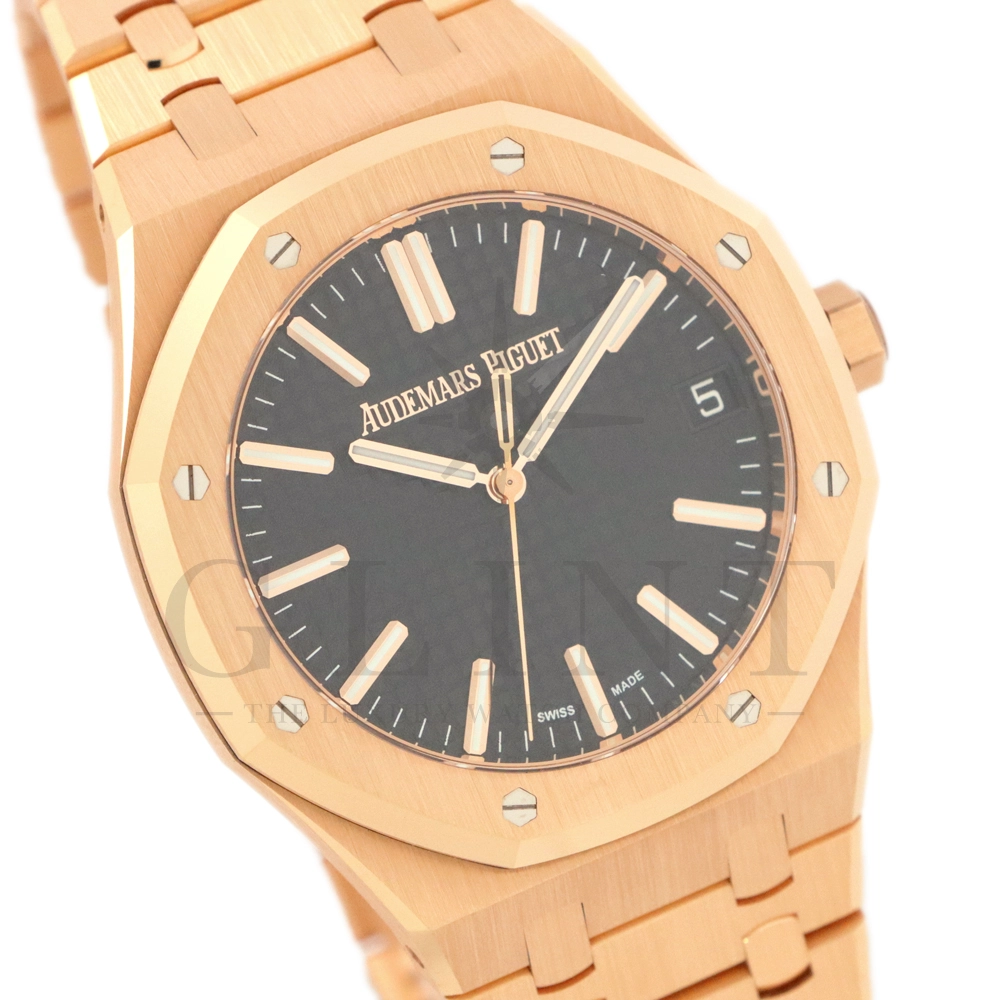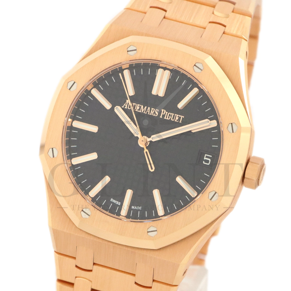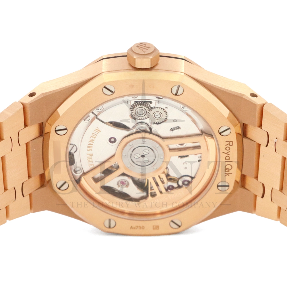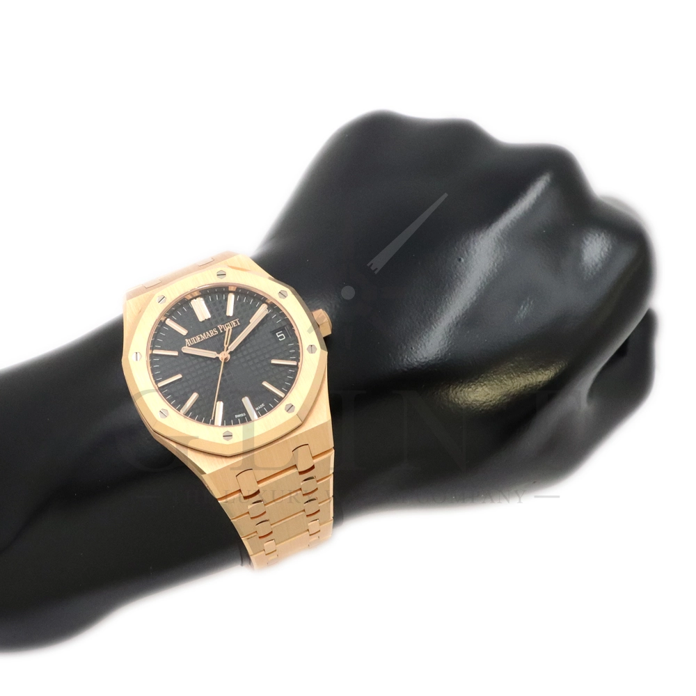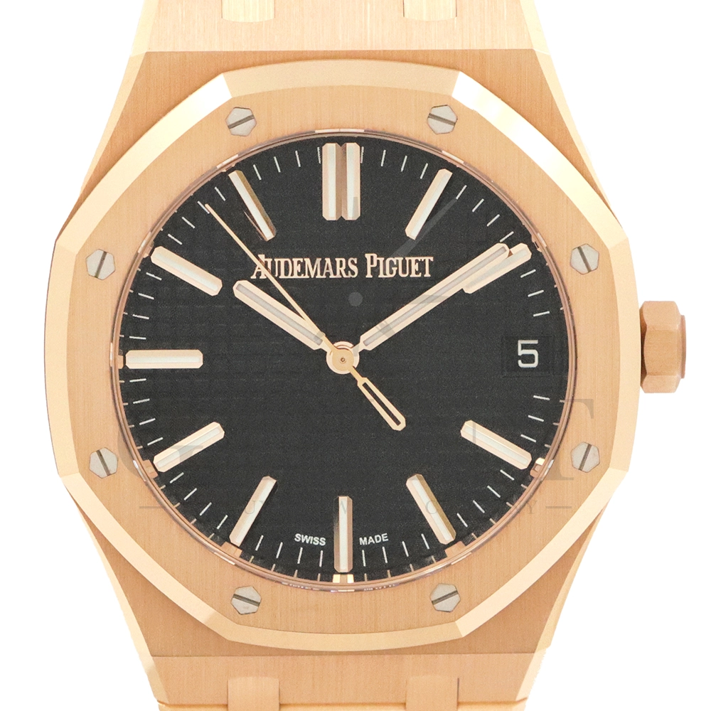 こちらはオーデマ ピゲ ロイヤル オーク オートマティックです。オーデマ ピゲを象徴するロイヤルオークの中でも、ひときわエレガントな存在感を放つ18Kピンクゴールドモデル「15510OR.OO.1320OR.04」。41mmケースと一体型ブレスレットには、ロイヤルオークならではのサテンとポリッシュを組み合わせた美しい仕上げが施され、ピンクゴールド特有の温かみのある輝きが腕元に圧倒的な高級感をもたらします。ダイヤルには立体感のある“グランドタペストリー”パターンを採用し、視認性とデザイン性を高次元で両立。シンプルな3針、デイト表示により、日常使いからフォーマルシーンまで幅広く対応します。搭載ムーブメントは自社製自動巻きムーブメントを採用。シースルーバックからは、オーデマ ピゲならではの精緻な仕上げとローターの動きを堪能でき、機械式時計としての魅力も存分に味わえる一本です。スポーティーさとラグジュアリーを見事に融合させた、まさにロイヤルオークの王道とも言えるモデル。資産性・実用性・デザイン性のすべてを求める方におすすめの逸品です。