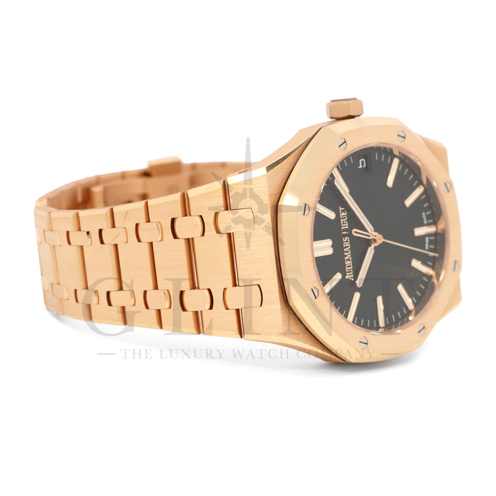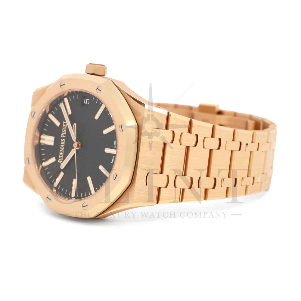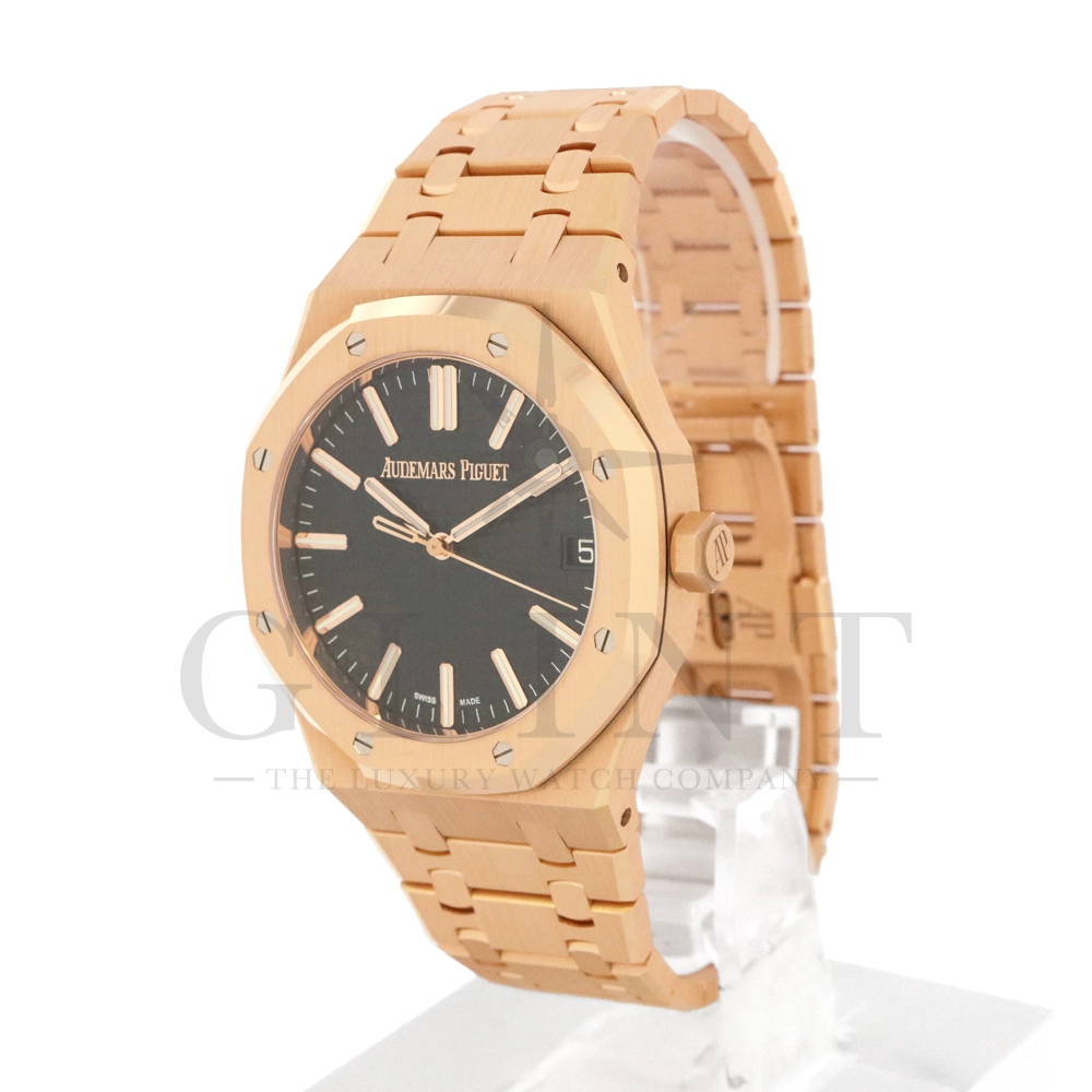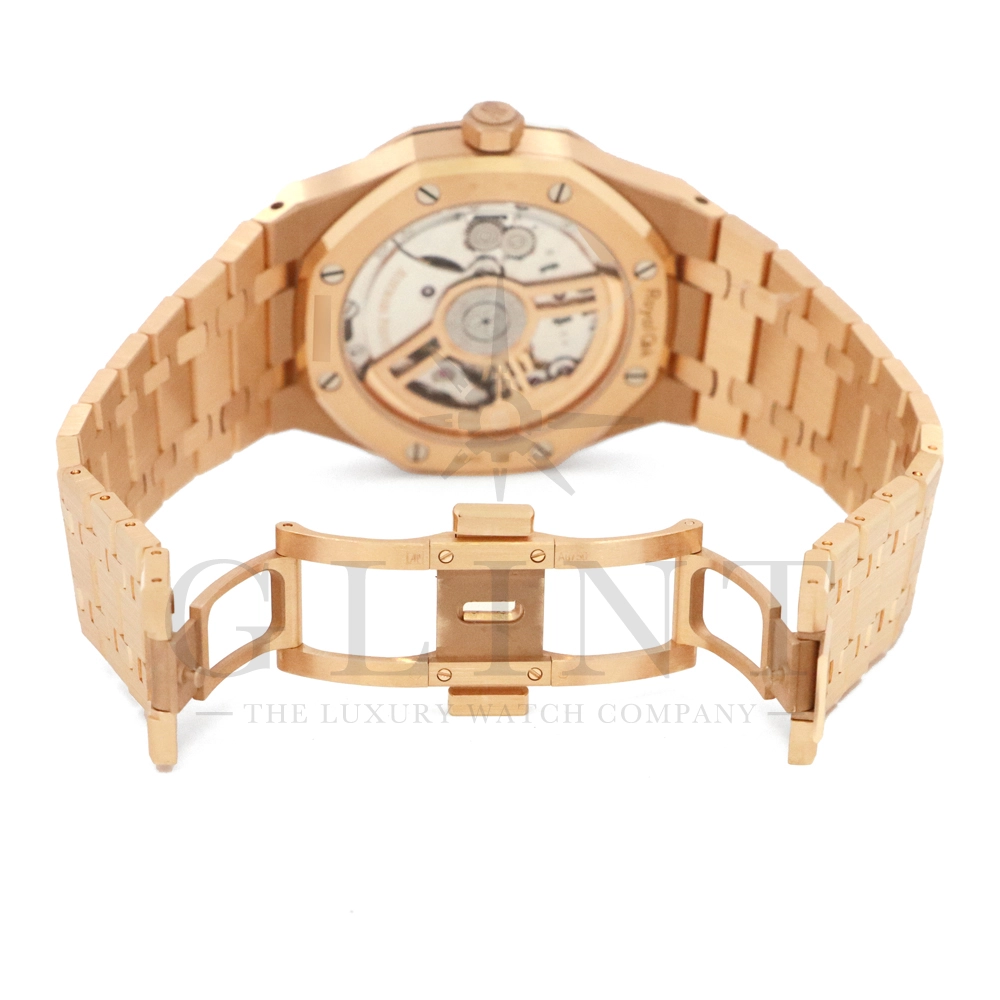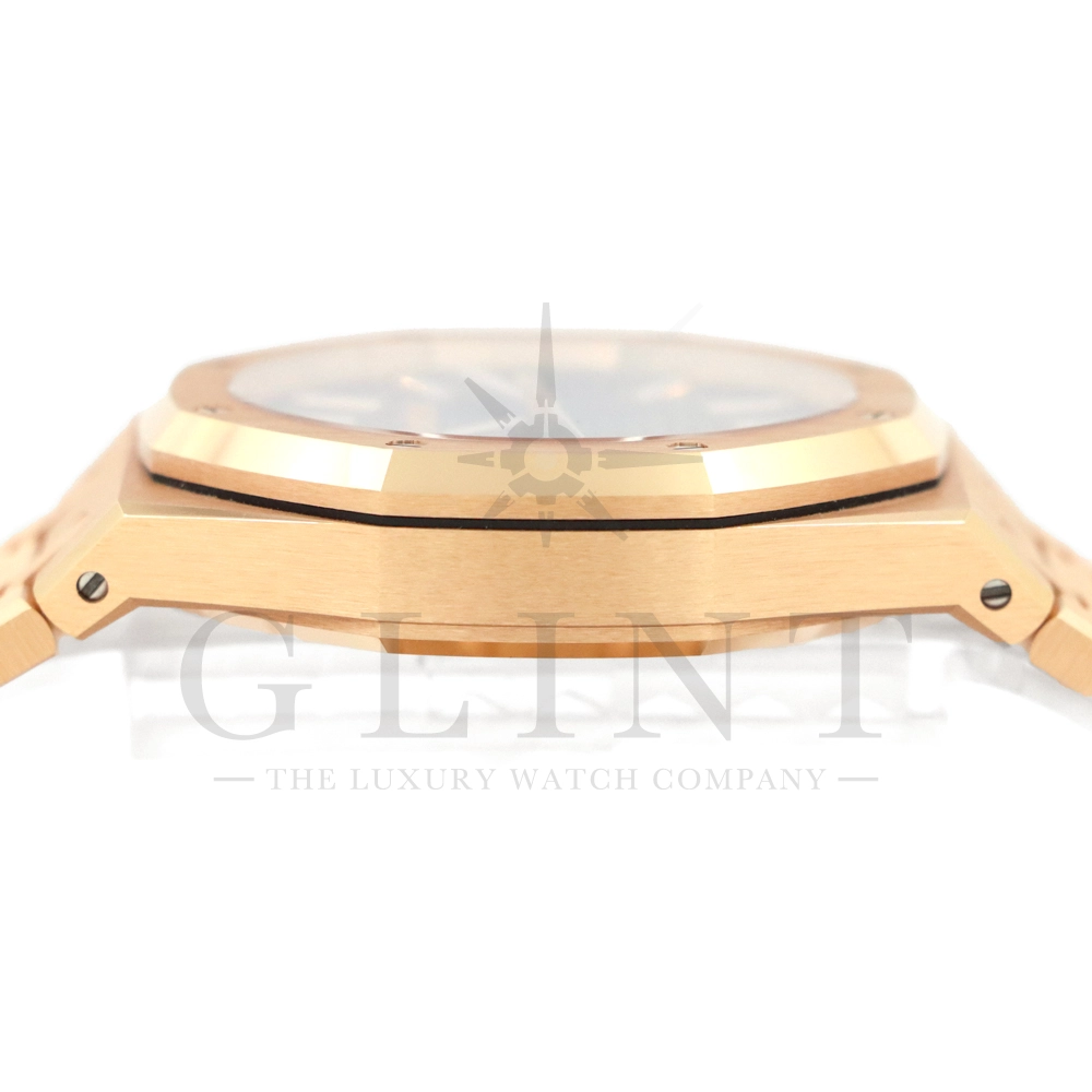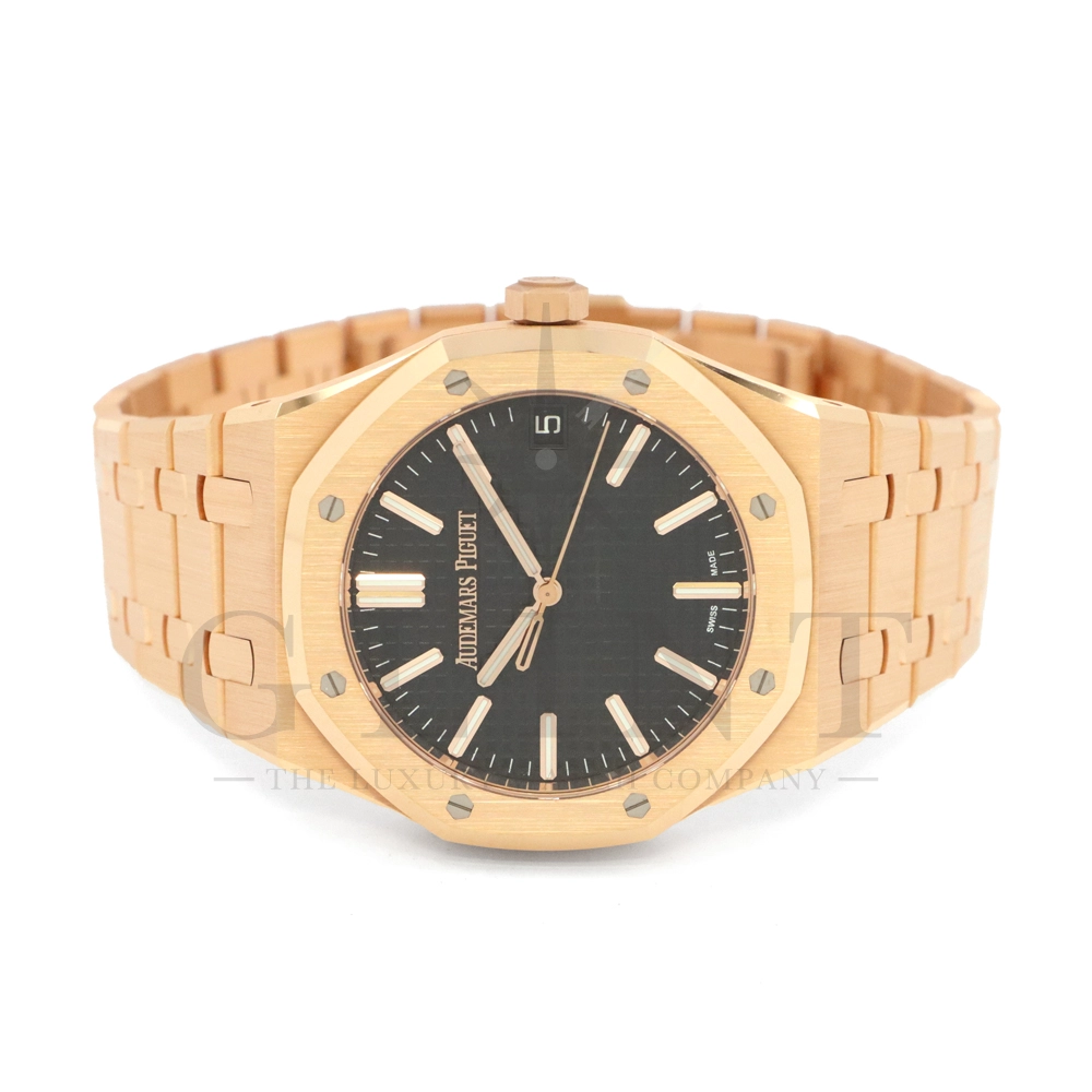 こちらはオーデマ ピゲ ロイヤル オーク オートマティックです。オーデマ ピゲを象徴するロイヤルオークの中でも、ひときわエレガントな存在感を放つ18Kピンクゴールドモデル「15510OR.OO.1320OR.04」。41mmケースと一体型ブレスレットには、ロイヤルオークならではのサテンとポリッシュを組み合わせた美しい仕上げが施され、ピンクゴールド特有の温かみのある輝きが腕元に圧倒的な高級感をもたらします。ダイヤルには立体感のある“グランドタペストリー”パターンを採用し、視認性とデザイン性を高次元で両立。シンプルな3針、デイト表示により、日常使いからフォーマルシーンまで幅広く対応します。搭載ムーブメントは自社製自動巻きムーブメントを採用。シースルーバックからは、オーデマ ピゲならではの精緻な仕上げとローターの動きを堪能でき、機械式時計としての魅力も存分に味わえる一本です。スポーティーさとラグジュアリーを見事に融合させた、まさにロイヤルオークの王道とも言えるモデル。資産性・実用性・デザイン性のすべてを求める方におすすめの逸品です。